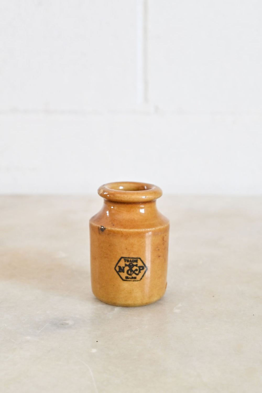 Antique mustard pot made by George Skey Wilncote Works in Tamworth. The pot is decorated with the distinctive treacle coloured glaze and typography, as shown in pictures. Sourced from a farmhouse in Arles.