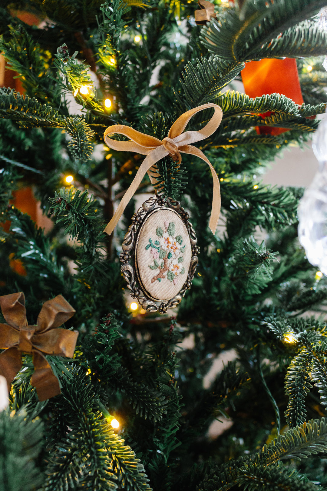 midcentury Italian framed "petit point" floral ornament with velvet ribbon