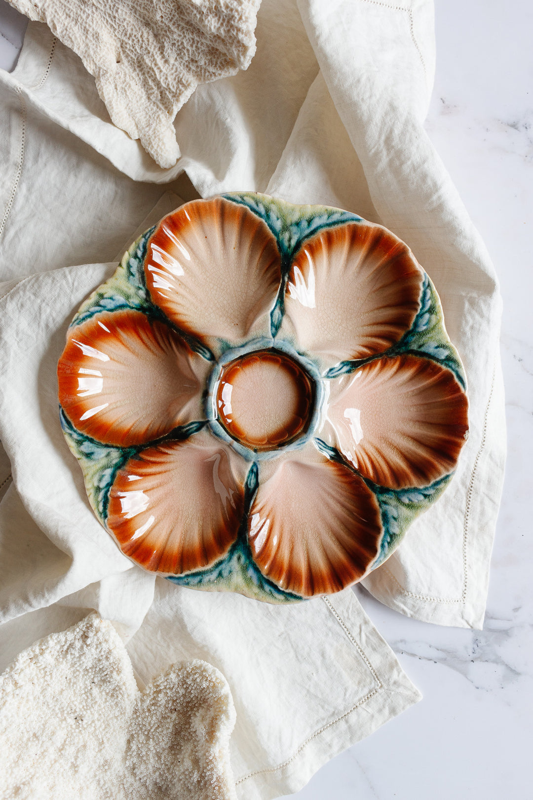 rare antique french Sarreguemines pink & burgundy majolica oyster plate