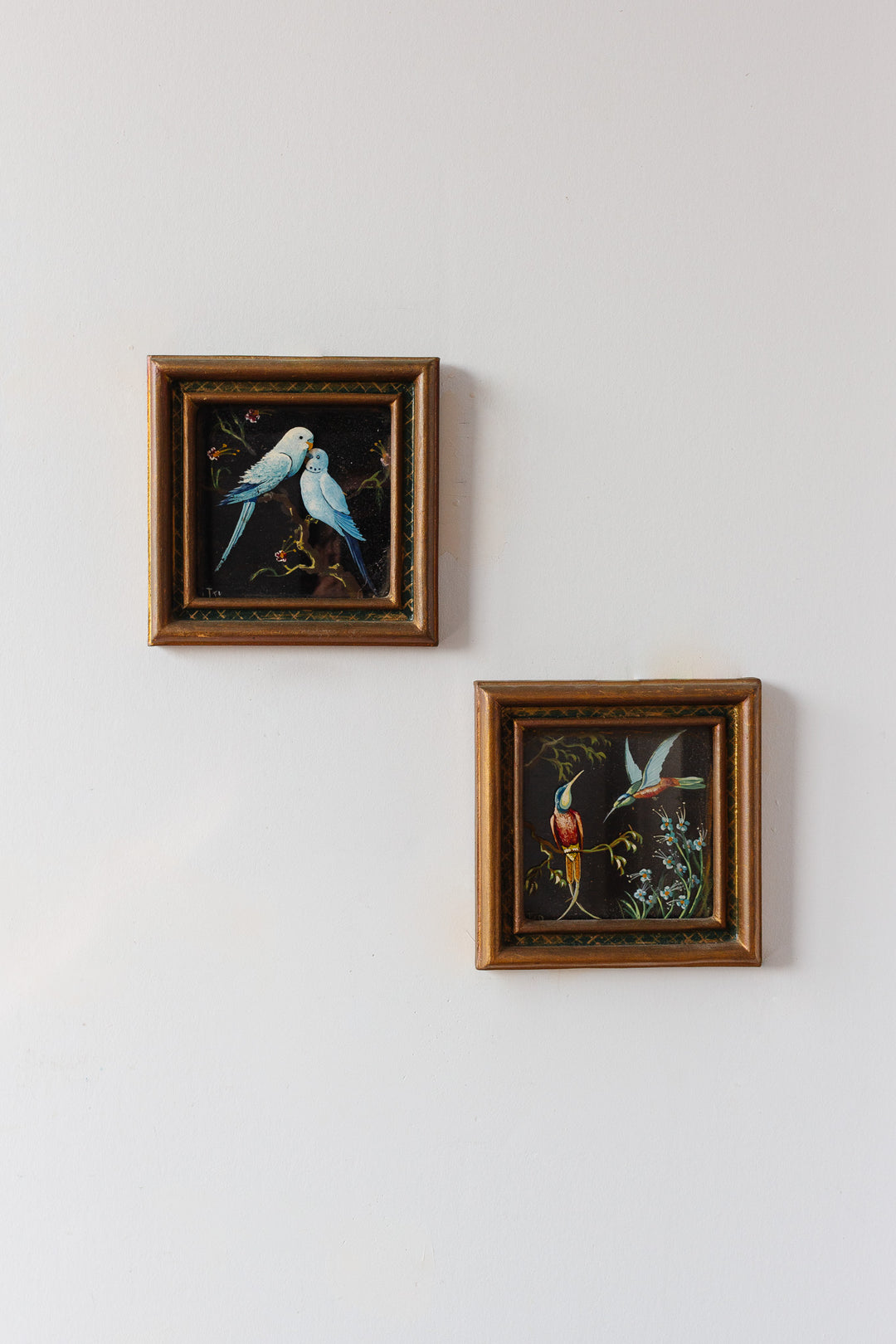 rare pair of 1940s French glass paintings, “oiseaux sur verre”