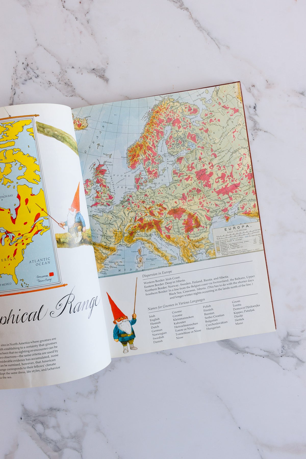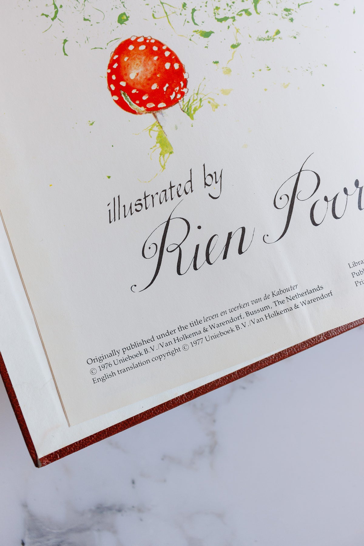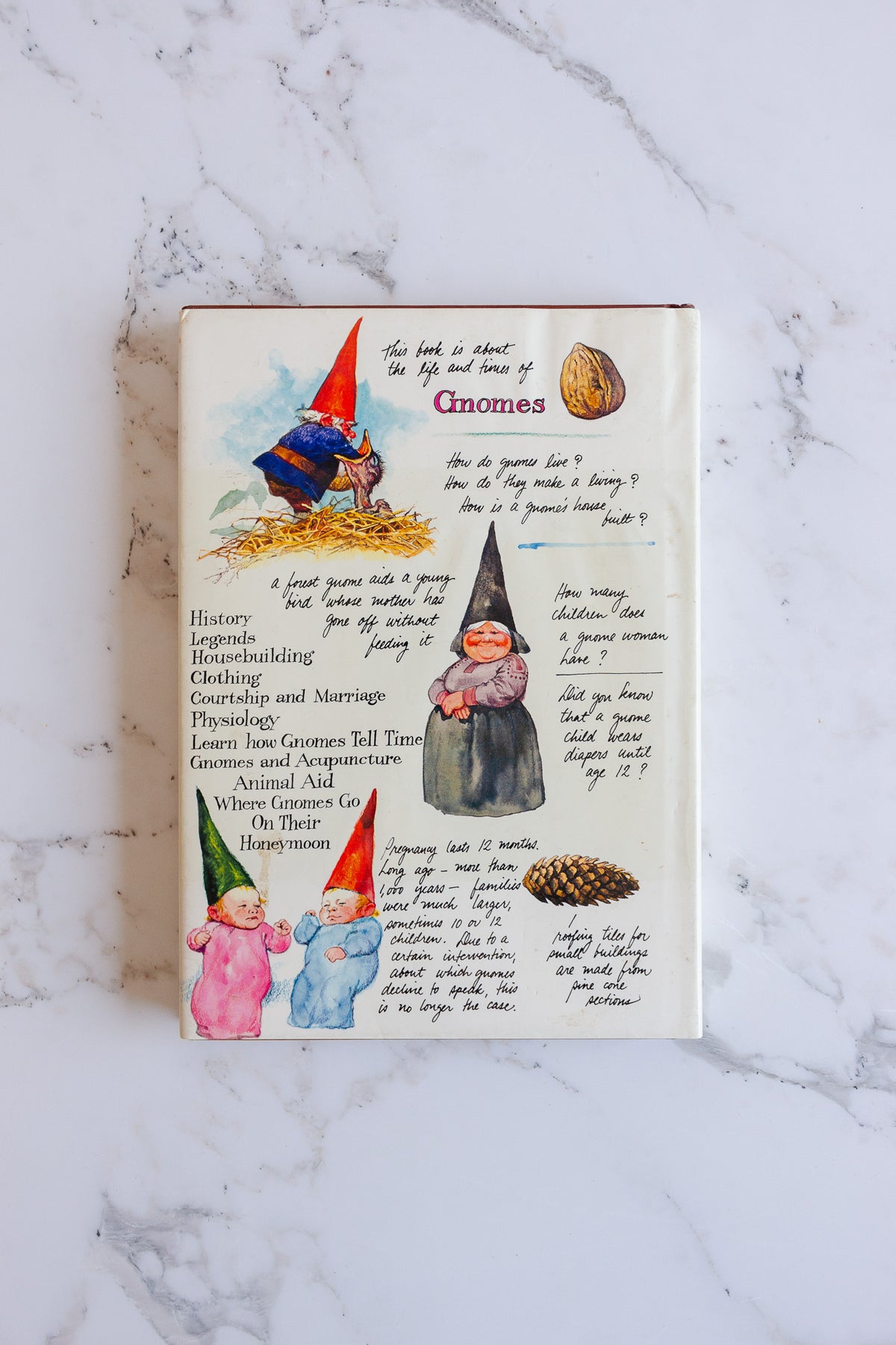 A sweet and whimsical fictional hardcover book, it is the first English translation edition 1977,  of the famed Gnomes book by Dutch author Wil Huygen with illustrations by Rien Poortvliet.