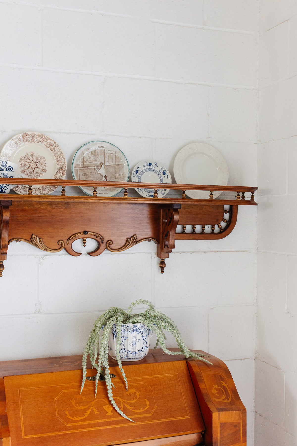 This mid-century neo-classical style wall-mounted shelf features a long, narrow profile with turned spindle detailing, carved scrollwork, and a warm wood finish. Decorative yet functional, it was designed to display small objects, plates, or framed pieces while adding architectural interest to a wall. The balanced proportions and ornamental details give it presence without feeling heavy, making it well suited for an entryway, living space, or above a console.