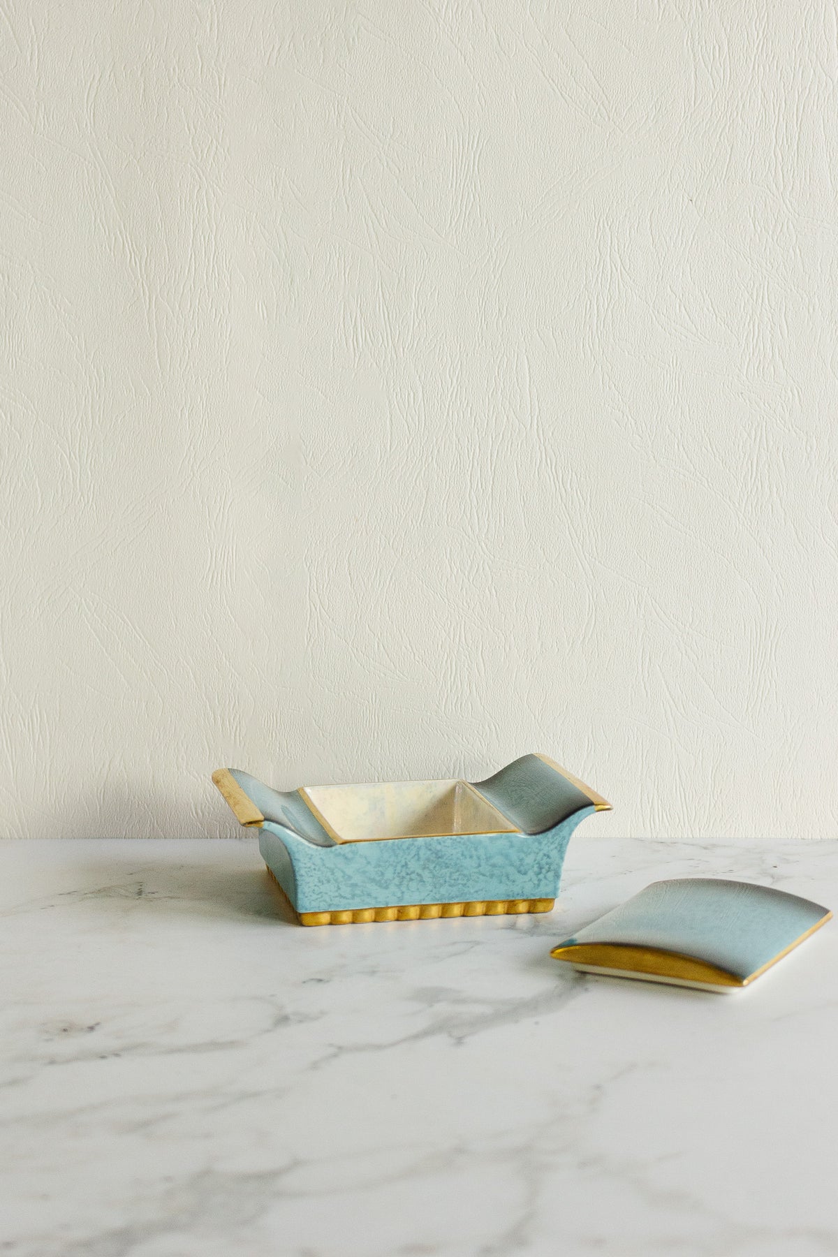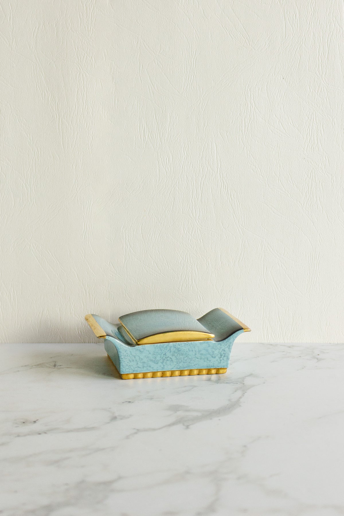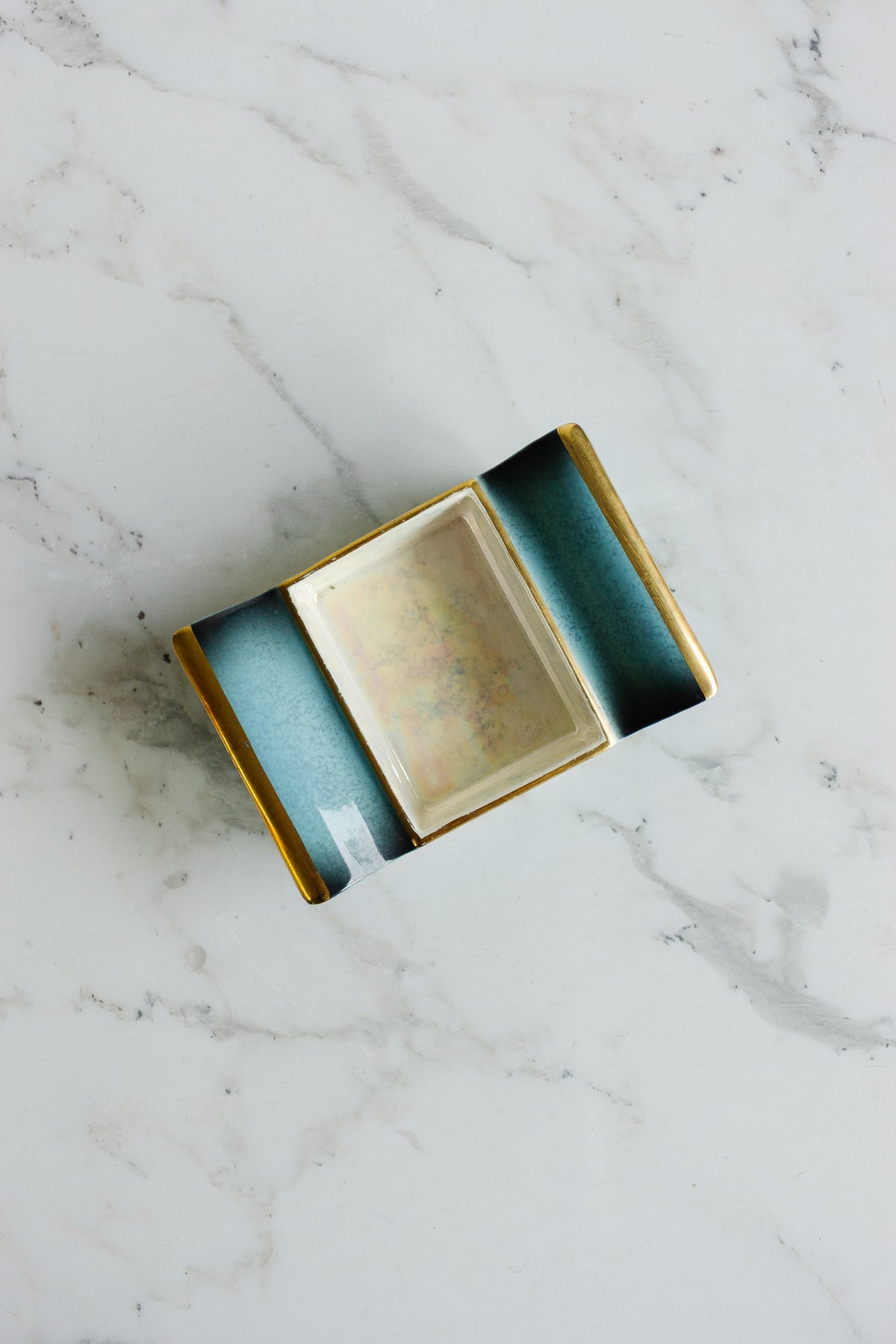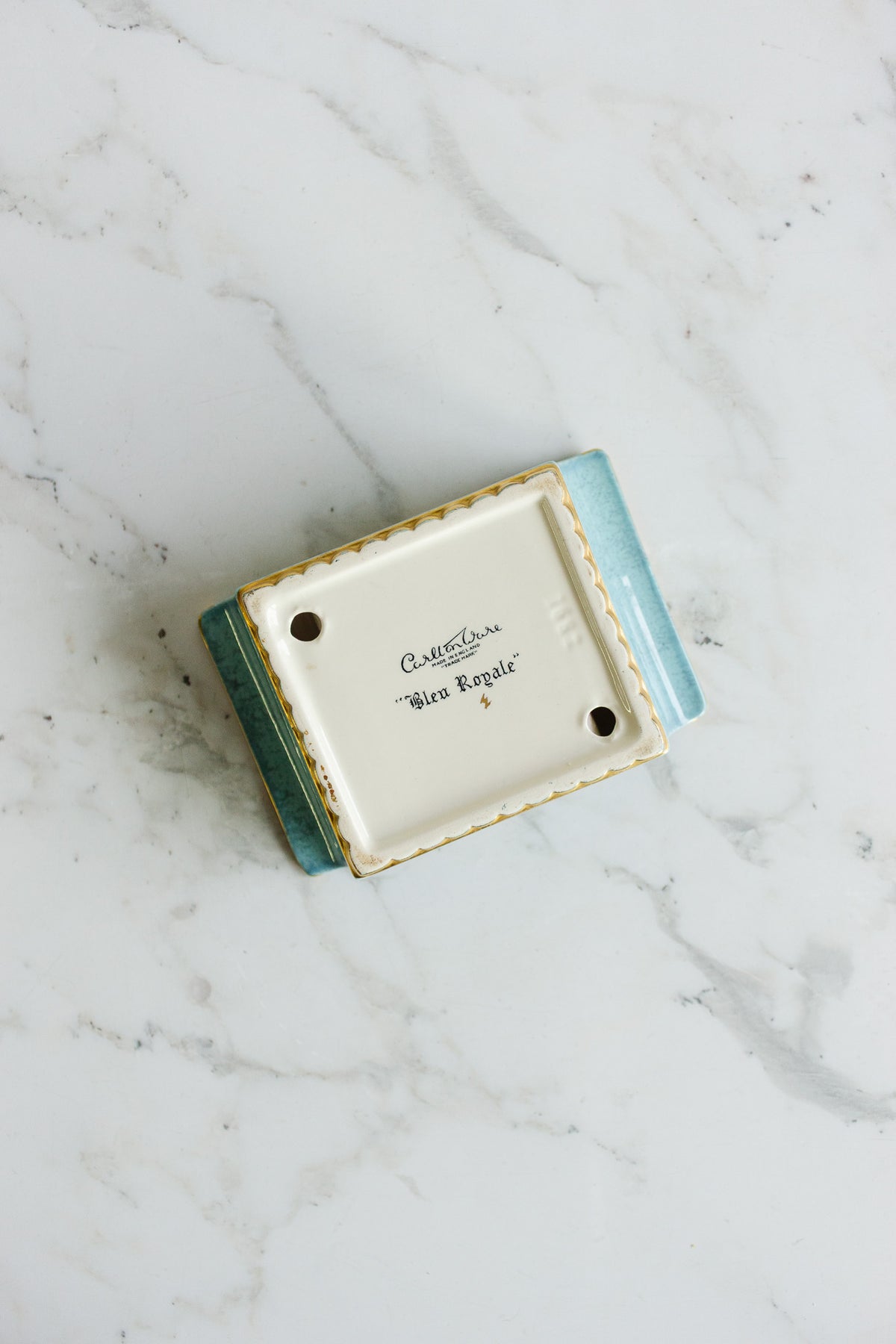 A vintage Carlton Ware “Bleu Royale” trinket dish, sourced from a brocante in Marseille. This elegant piece features the brand’s signature deep cobalt glaze with a subtle iridescent sheen and gilt detailing along the rim and lid. Compact yet refined, it’s perfect for holding jewelry or small keepsakes, or simply adding a touch of vintage sophistication to a dressing table or console.