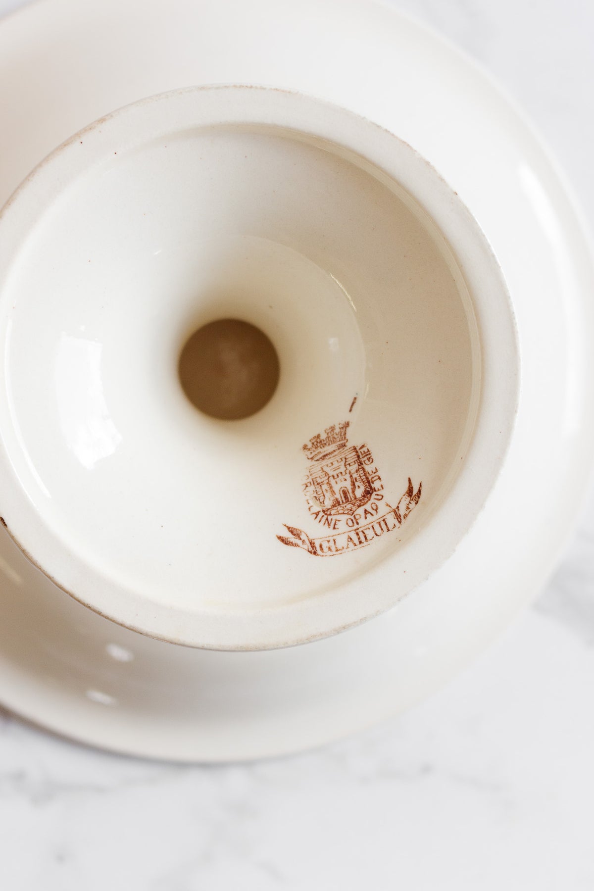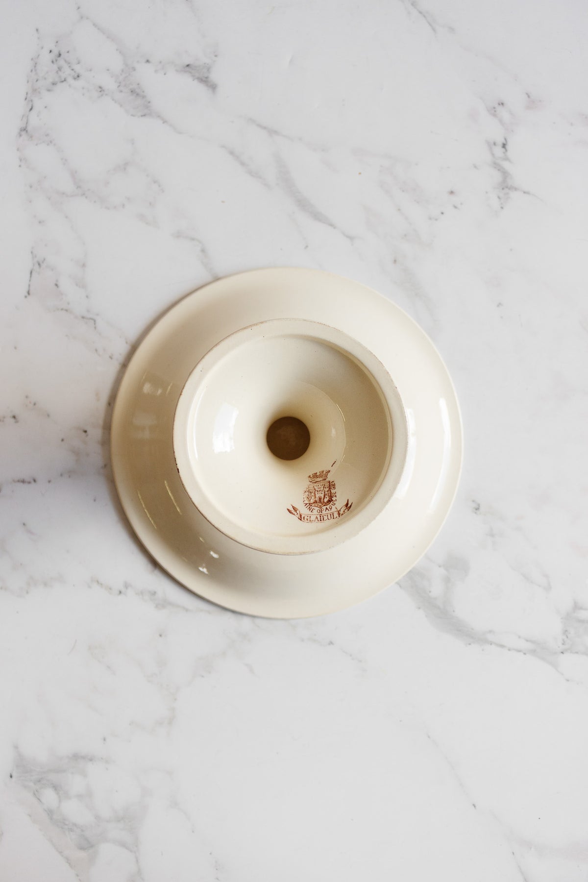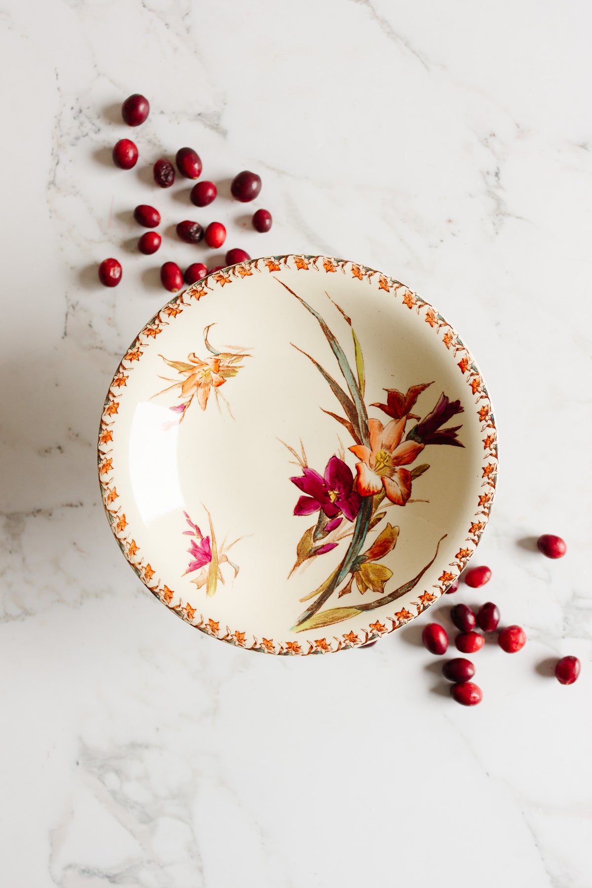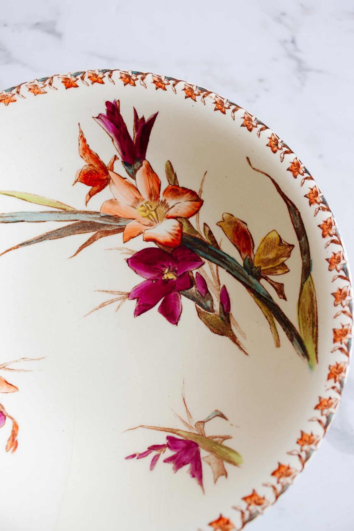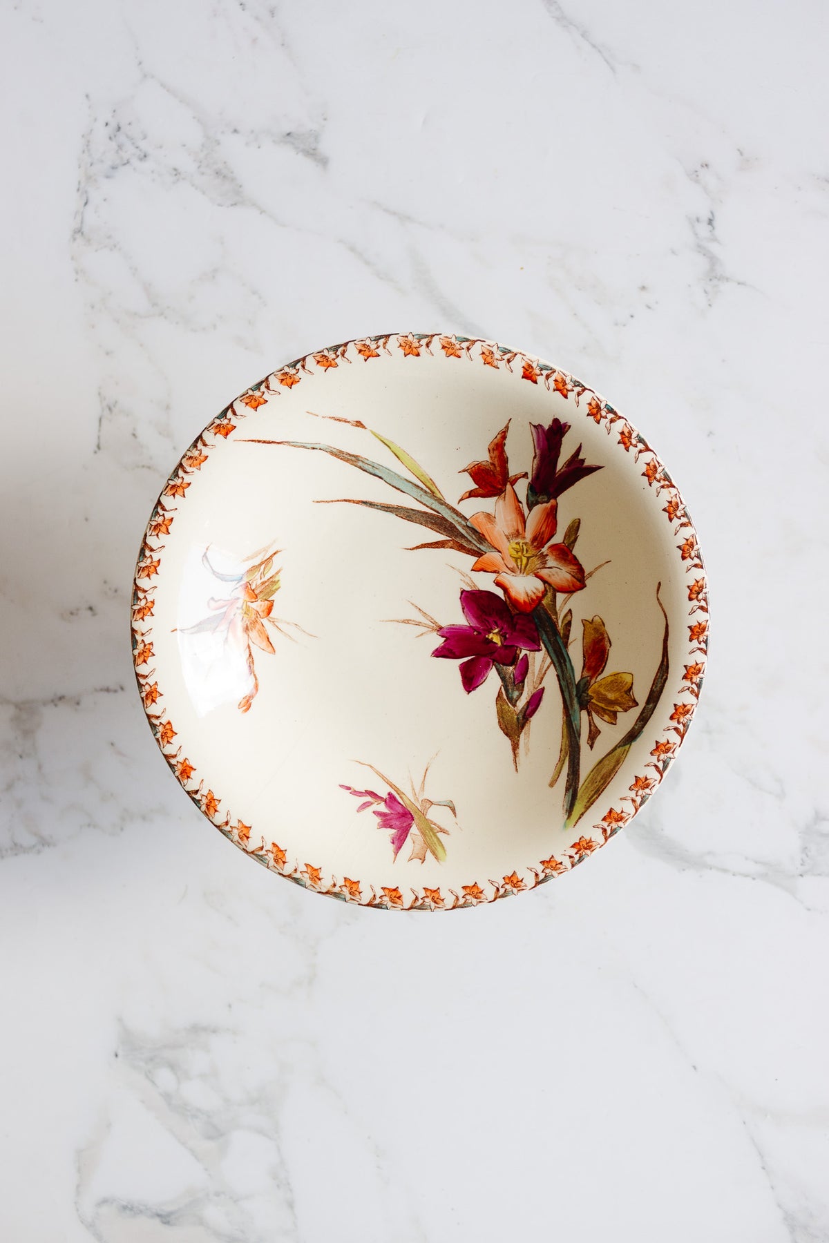 Turn-of-the-century Porcelaine Opaque de Gien “Glaïeul” (gladiolus) polychrome compotier featuring vibrant botanical decoration in rich shades of red, orange, and soft greens. A striking French table piece that works beautifully for display or serving fruit and pastries. Sourced from a brocante in Marseille.