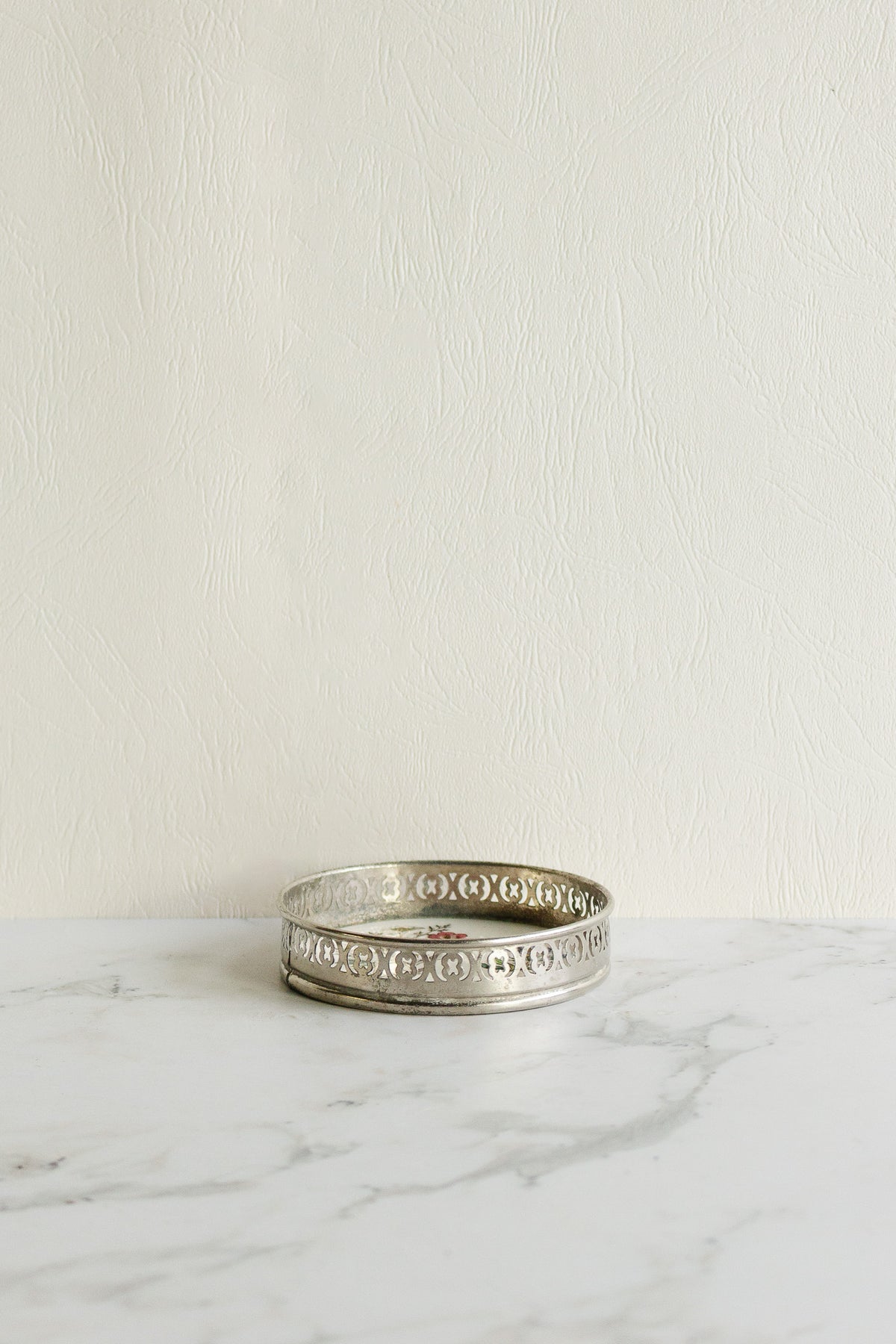 We love the look of this 19th-century French rare polychrome porcelain sous-bouteille (bottle stand) features vivid hand-painted floral motifs encased in an ornate reticulated metal frame. The delicately glazed porcelain and intricate openwork metal were designed to protect fine linens while elevating the presentation of wine or liqueur. A special find, sourced in Marseille and ready for your tablescape.