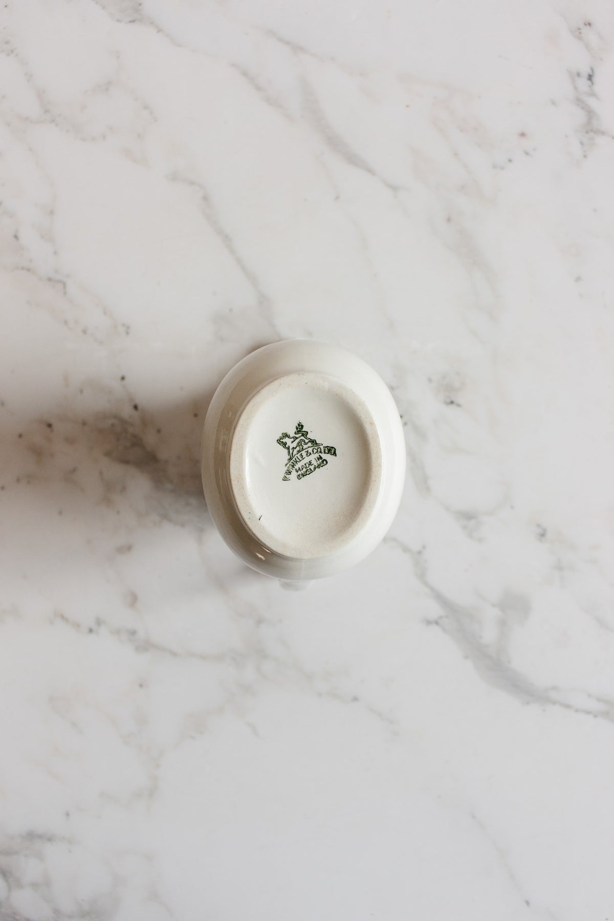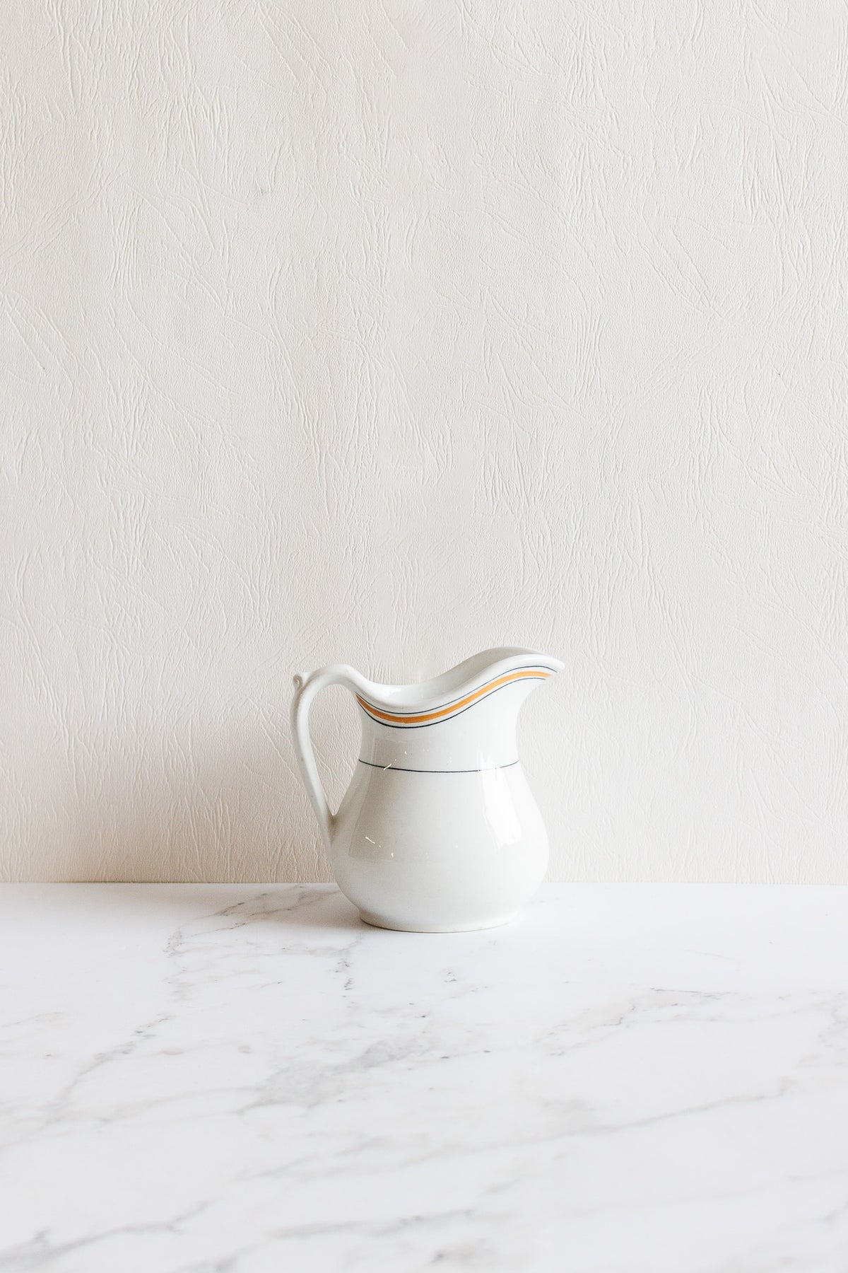 A porcelain creamer by F. Winkle & Co., shaped with an easy curve that feels as natural to hold as it is to pour from. The hand-painted banding—amber, slate, and soft charcoal—adds just enough color to catch the eye without taking over the room. There’s a quiet confidence to pieces like this: sturdy, useful, and unexpectedly poetic in the way they’ve moved through time. Light signs of age soften the surface in all the right ways. Sourced from a brocante in Marseille.