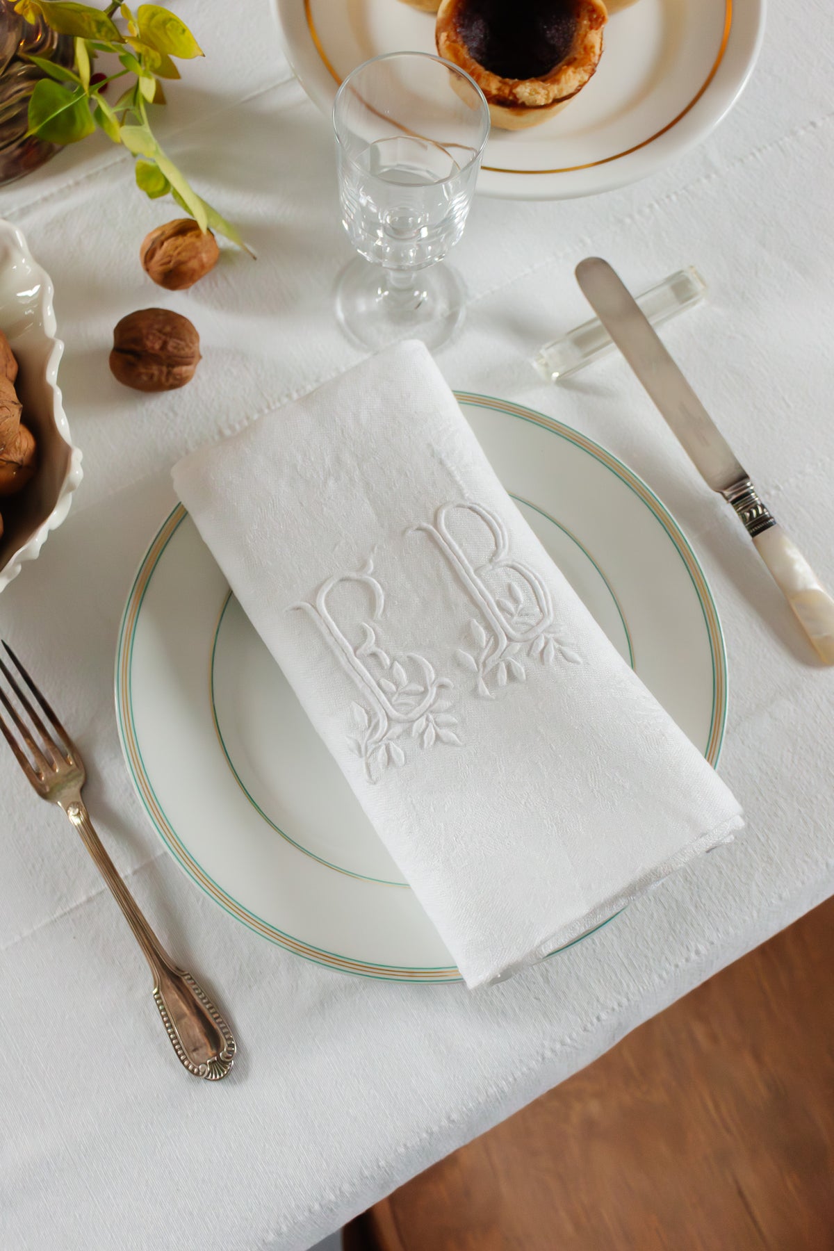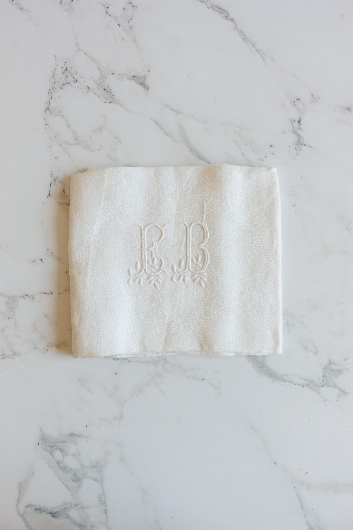 Pair of antique French monogrammed “EB” napkins, crafted in a linen–cotton blend and sourced from a brocante in Marseille. The raised “EB” monogram and softly aged hand give them that unmistakable French textile charm. A beautiful pairing for everyday tables or for adding a collected touch to your décor.