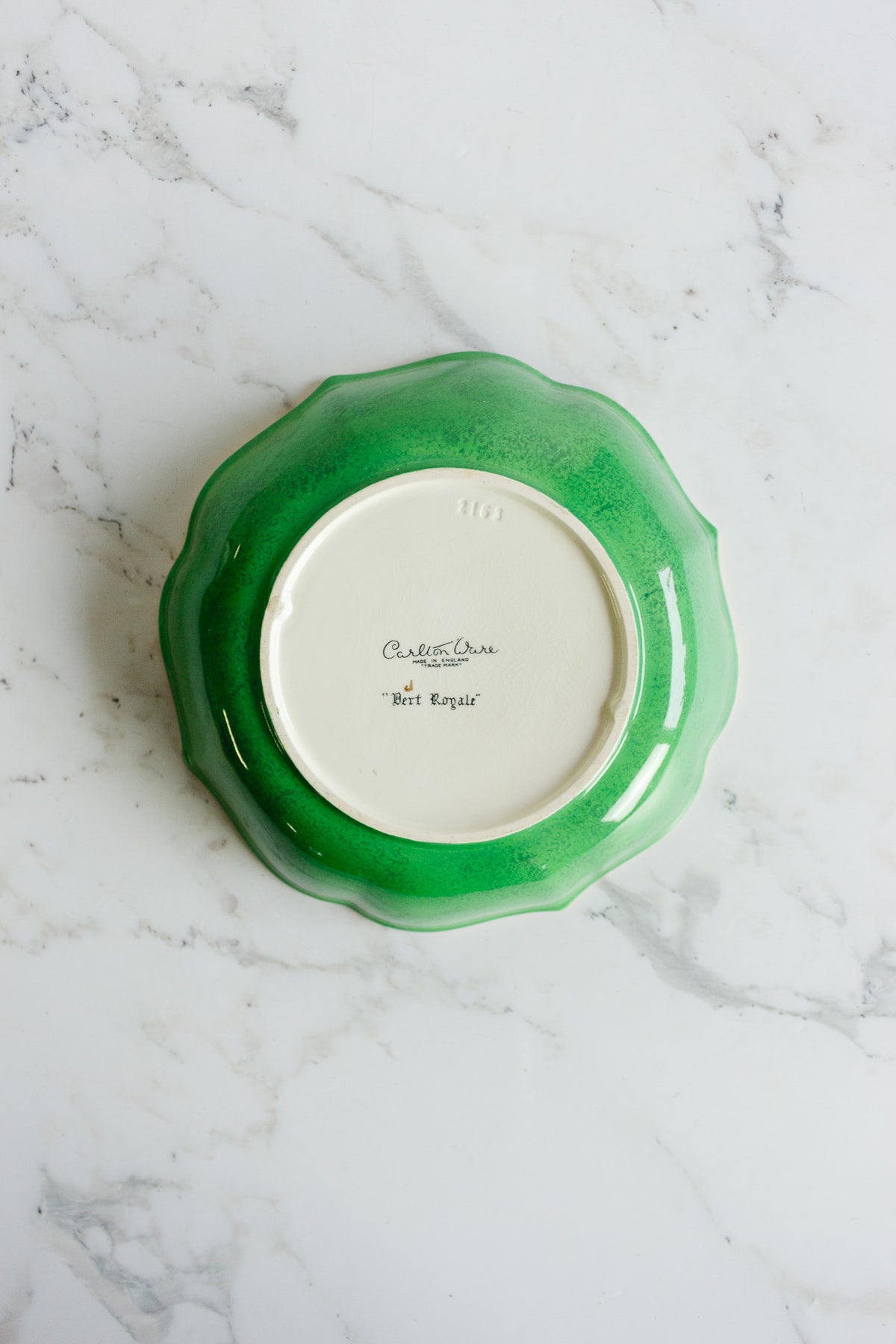 An elegant vintage Carlton Ware bowl in the sought-after Vert Royale glaze, made in England. The deep, iridescent green finish contrasts beautifully with the hand-painted floral detailing and gilt trim that define this iconic line.