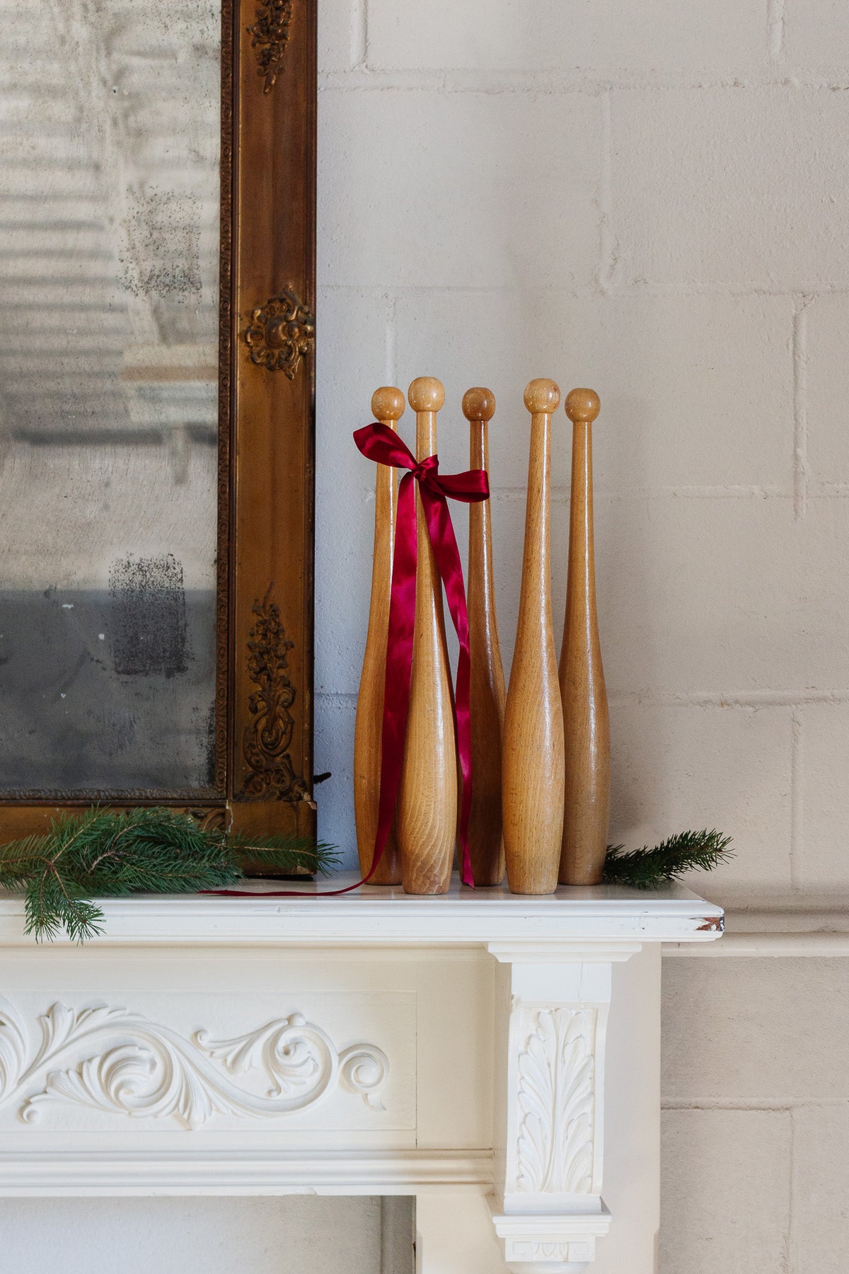 A charming group of vintage hand-carved wooden pins, sourced from the home of a collector in Aix-en-Provence. Their provenance notes that they were once used in a circus act, and the marks, wear, and softened edges all speak to that lively past.