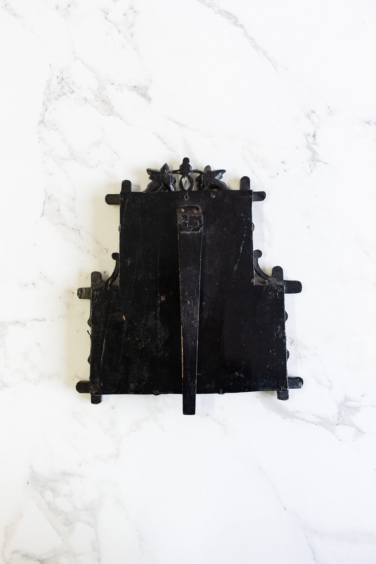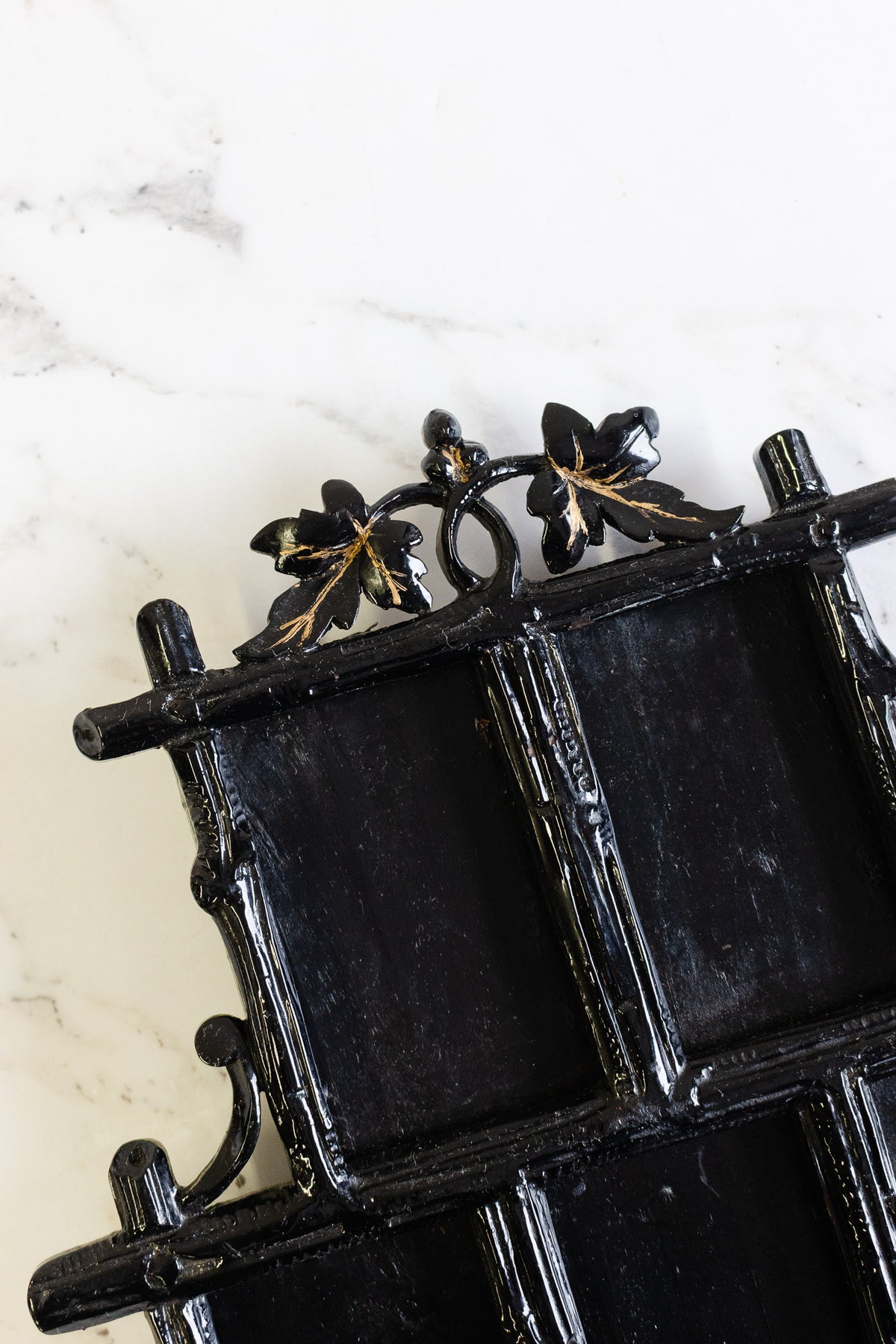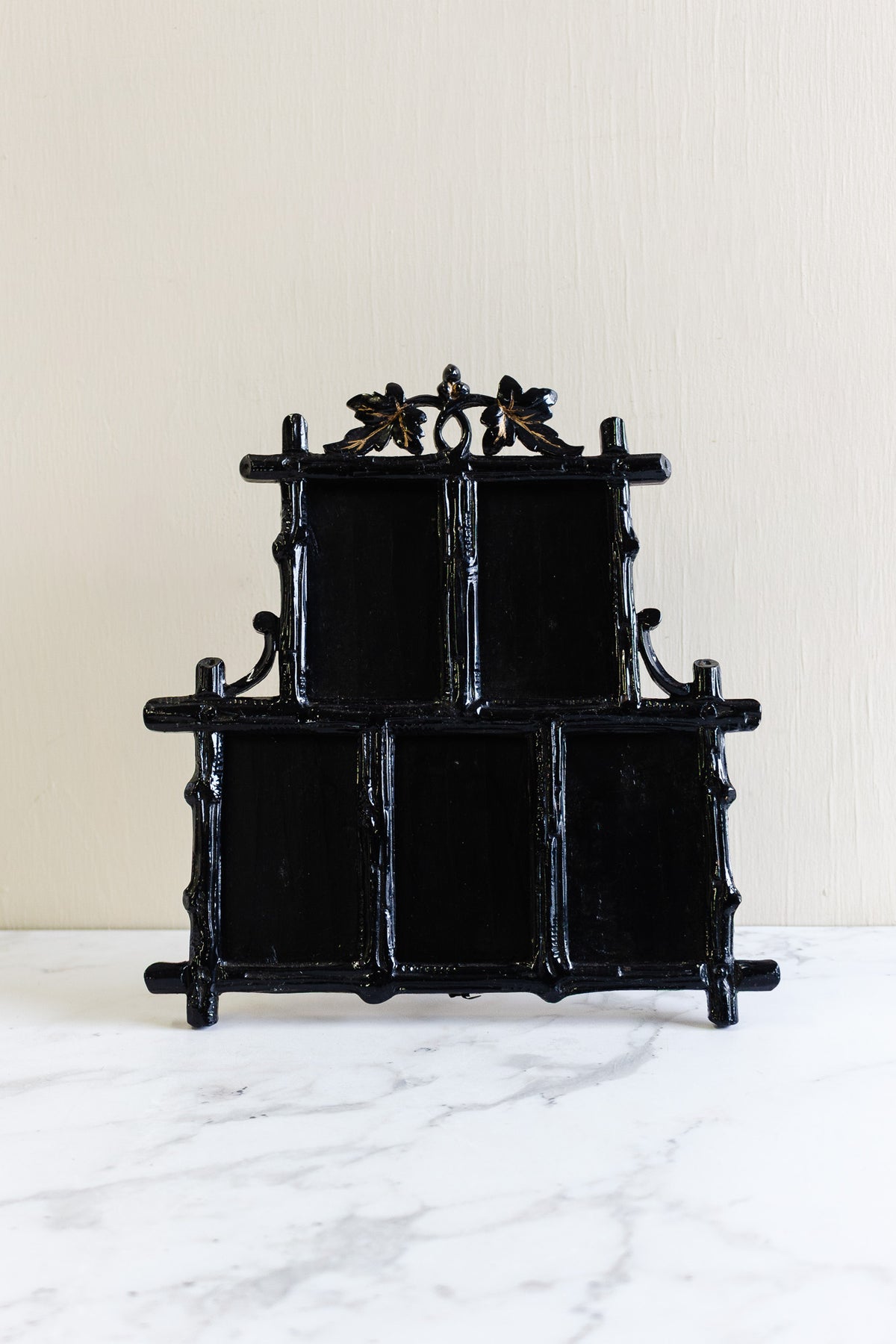 A striking Victorian multi-opening photograph frame, dating to the late 19th century, crafted in papier-mâché (carton-pierre) and finished in a deep, hand-painted black with subtle gilt highlights. Lightweight yet richly detailed, this technique was widely used during the Victorian era to replicate carved wood or cast iron, allowing for intricate foliate and architectural motifs such as the sculptural crest seen here.