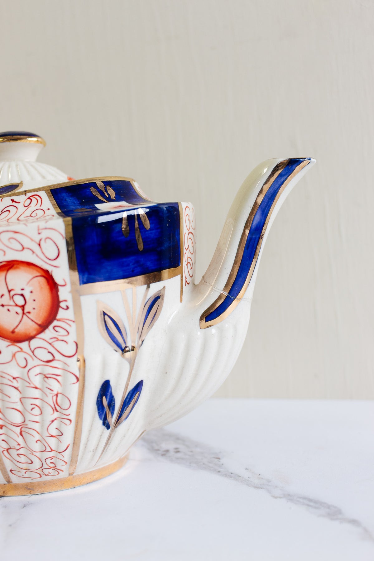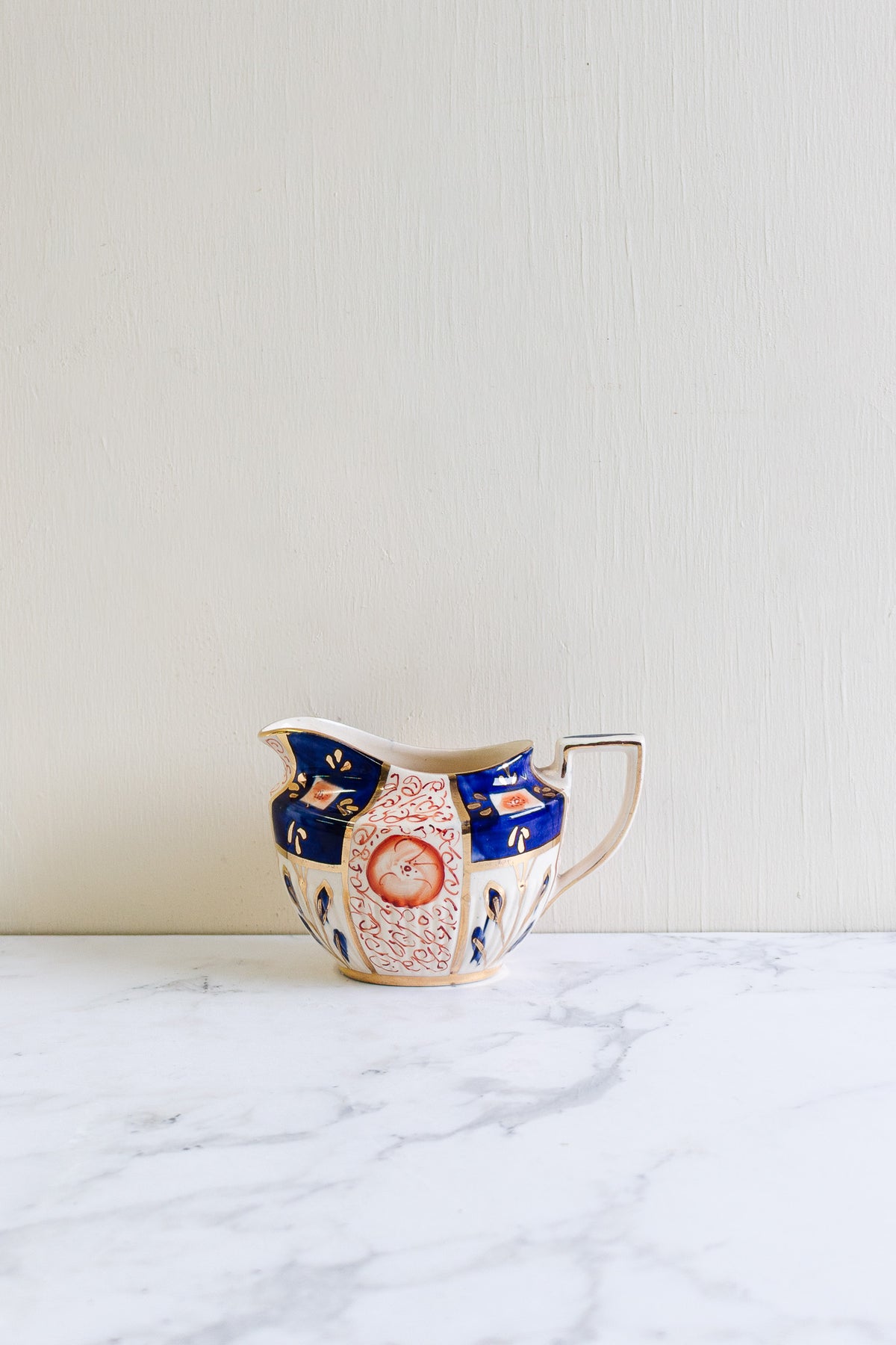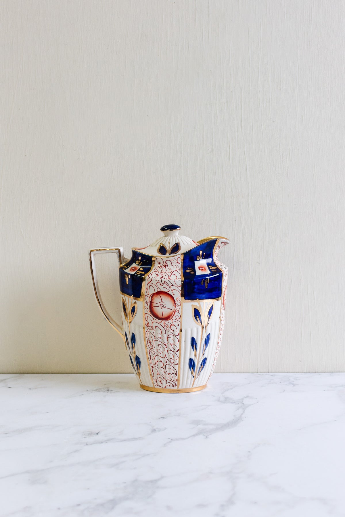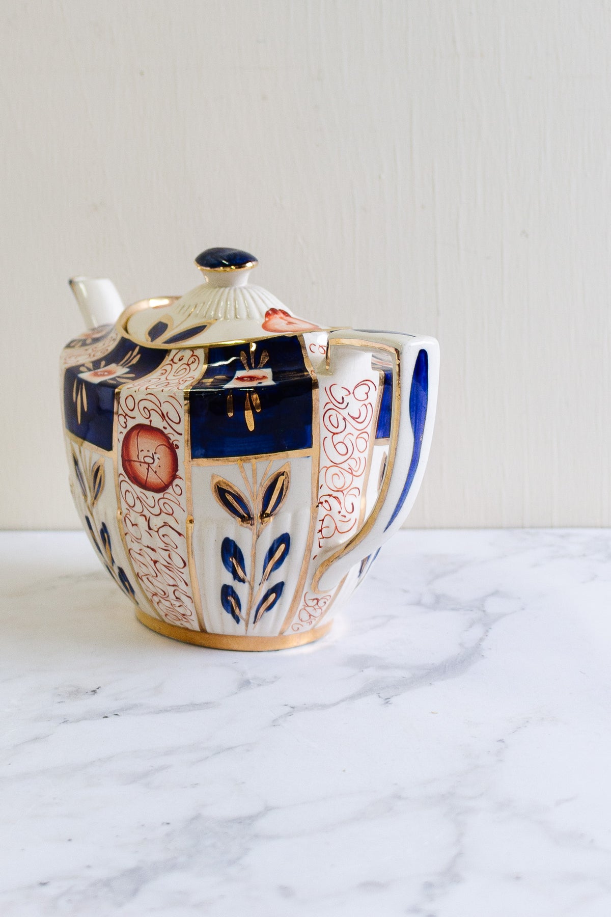 A refined vintage English porcelain tea set produced by Sudlow’s of Burslem, part of the historic Staffordshire pottery region long celebrated for its fine ceramics. This beautifully coordinated set features a richly decorative palette of deep cobalt blue, warm rust-red medallions, and hand-applied gilt accents, balanced by crisp white porcelain and elegant, faceted forms.