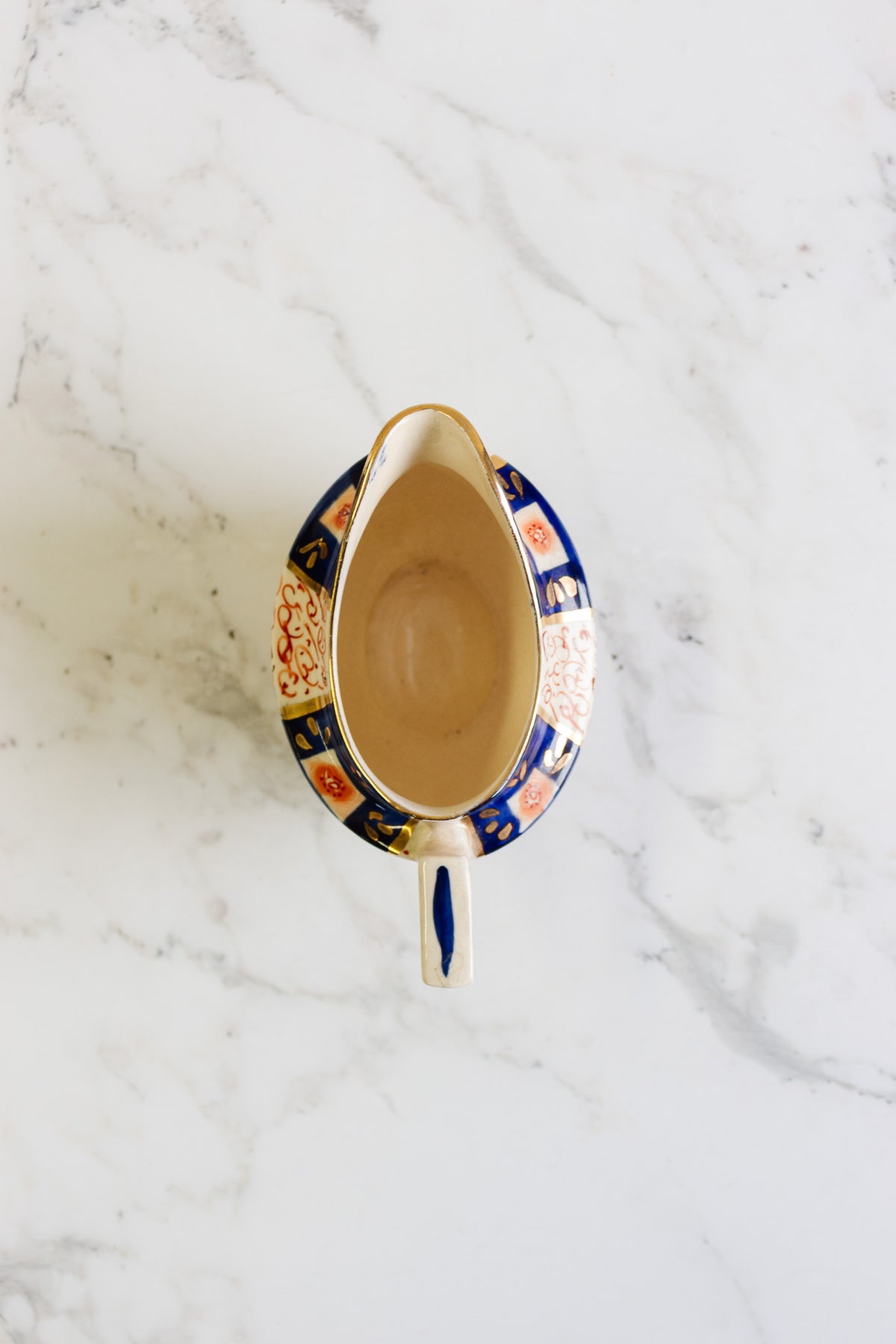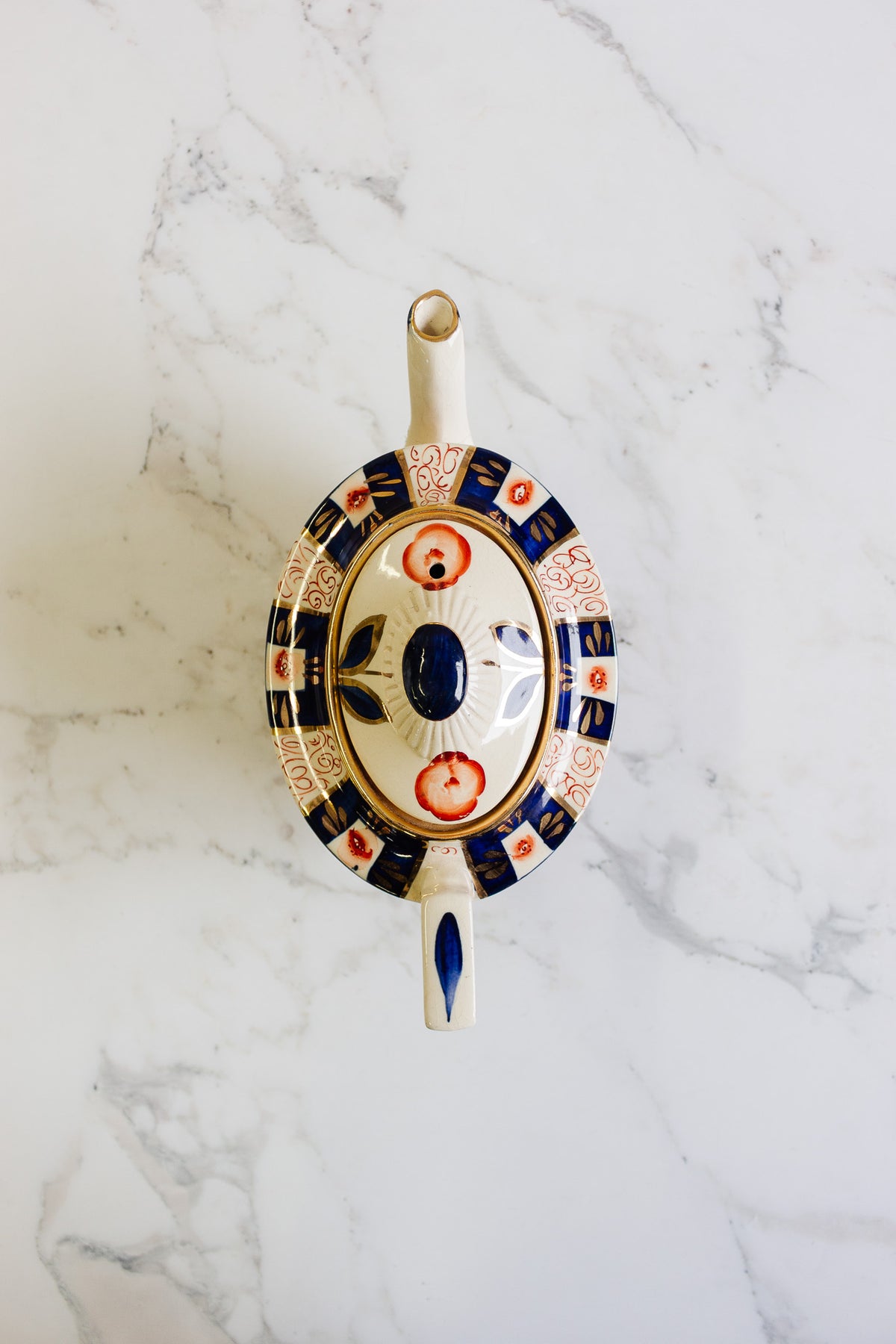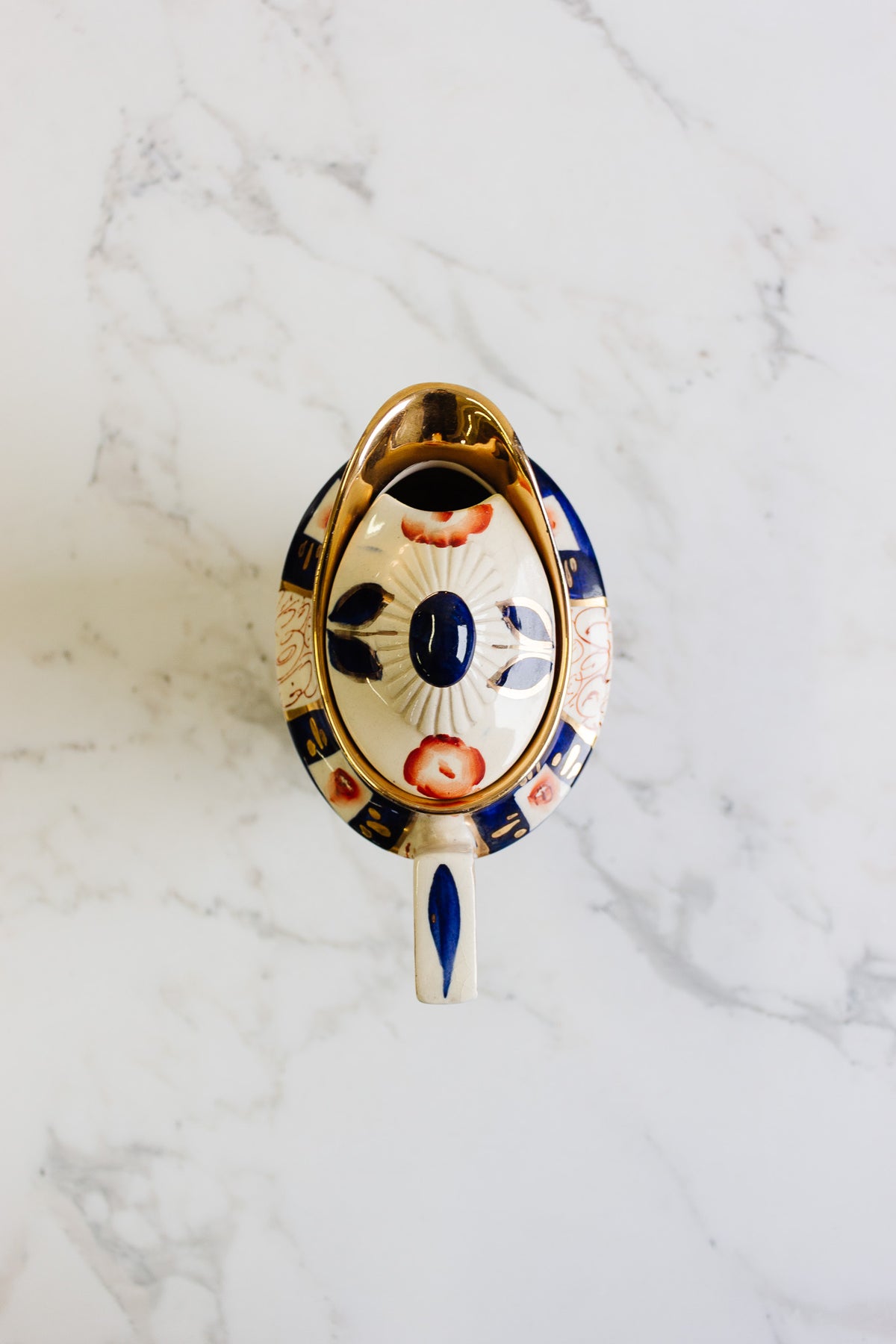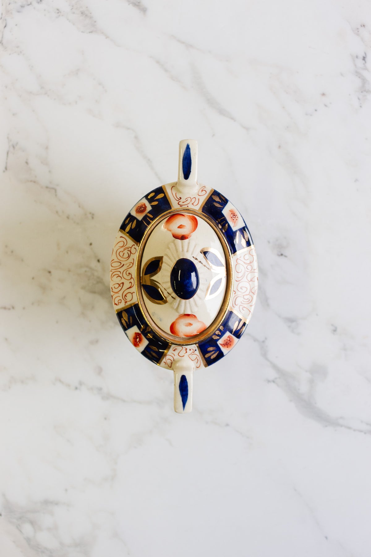 A refined vintage English porcelain tea set produced by Sudlow’s of Burslem, part of the historic Staffordshire pottery region long celebrated for its fine ceramics. This beautifully coordinated set features a richly decorative palette of deep cobalt blue, warm rust-red medallions, and hand-applied gilt accents, balanced by crisp white porcelain and elegant, faceted forms.