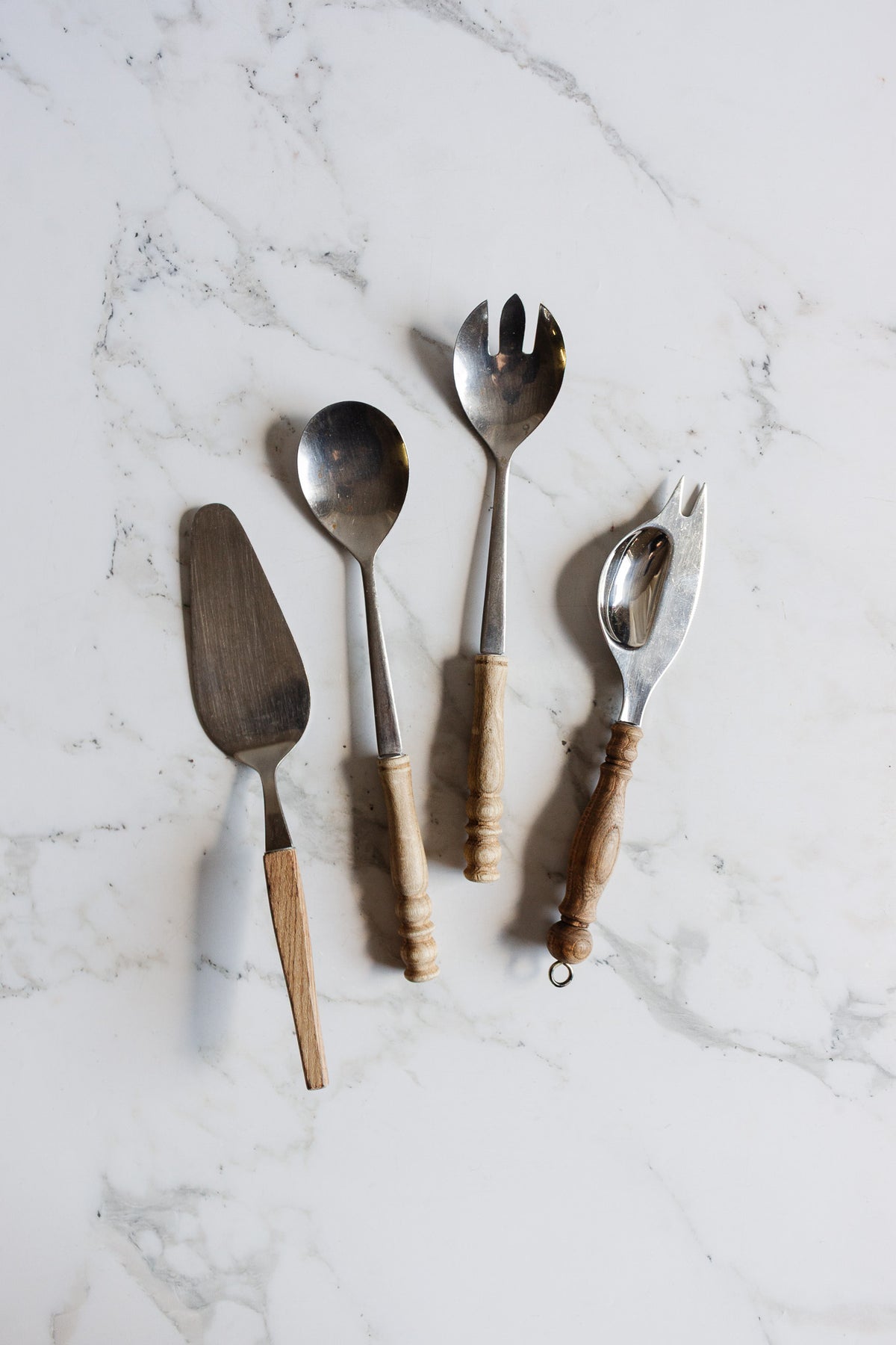 A character-filled mix of stainless-steel german serving pieces, each with a beautifully worn wood handle. Signs of age add to their charm, making them perfect for casual entertaining or display in a layered kitchen.