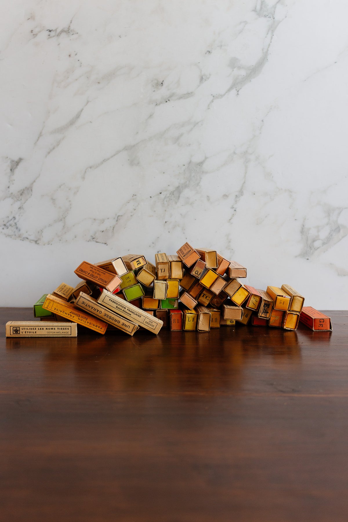 Antique French monogrammed linen ribbons, sourced from a private collector in Marseille and preserved in their original boxes. Traditionally used to mark household linens, each ribbon features a woven or embroidered initial, with a variety of letters available. Sold individually, these pieces are well suited for framing, styling, textile work, or collection.