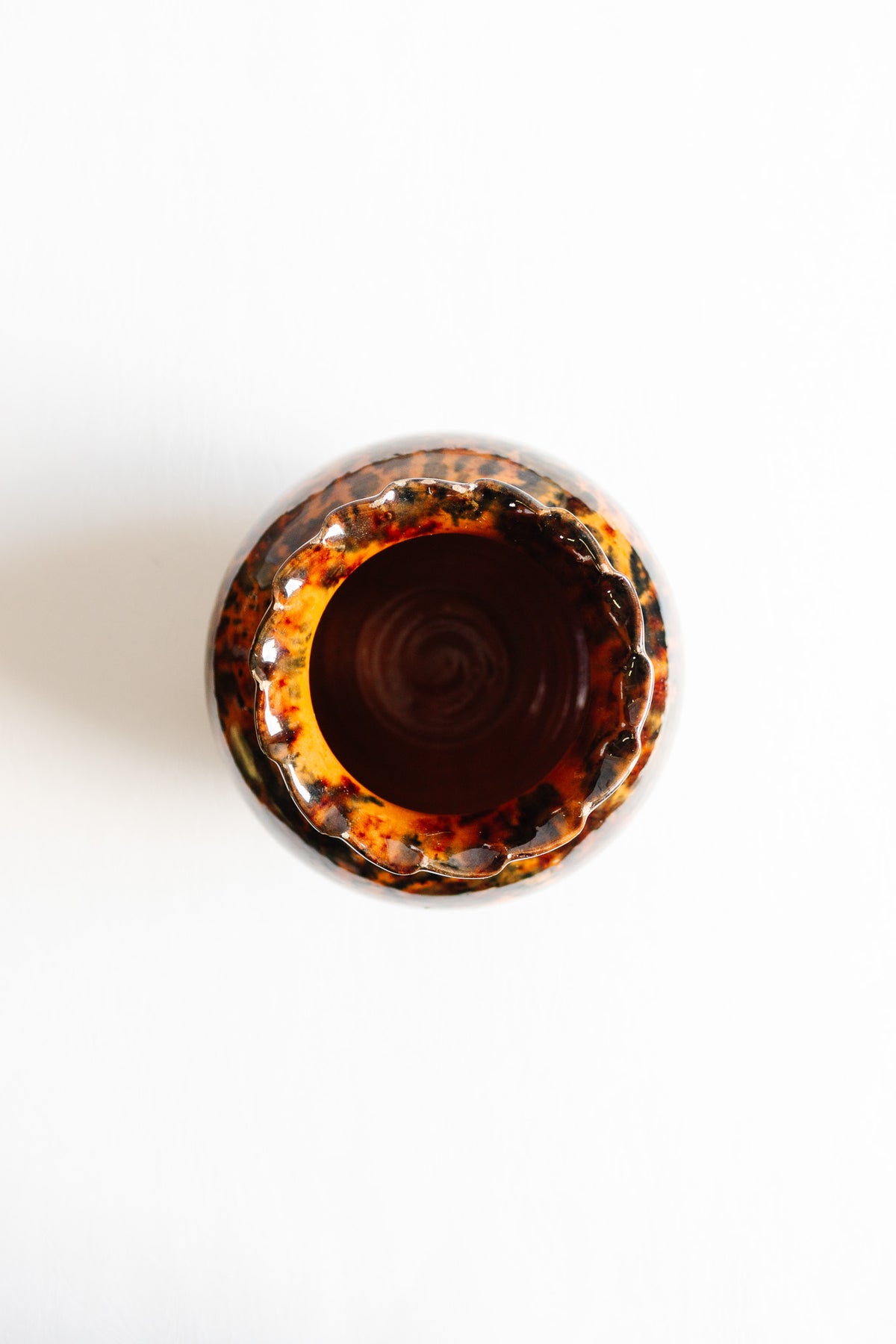 This vintage French pottery vase features a rounded form with a softly crimped rim and a richly mottled glaze in deep amber, chestnut, and dark brown tones. The layered, marbled finish gives the piece depth and variation, a style popularized in the late 19th and early 20th century. The unmarked base and earthy glaze suggest it was likely produced by a provincial pottery workshop rather than a named factory.