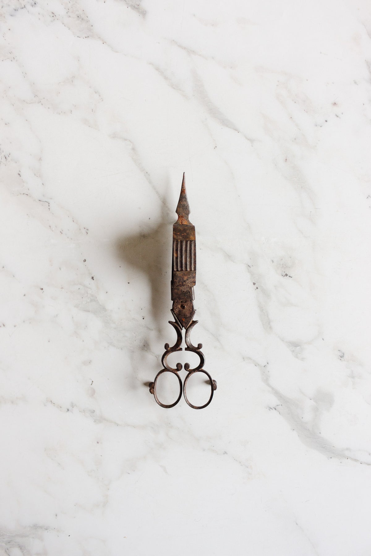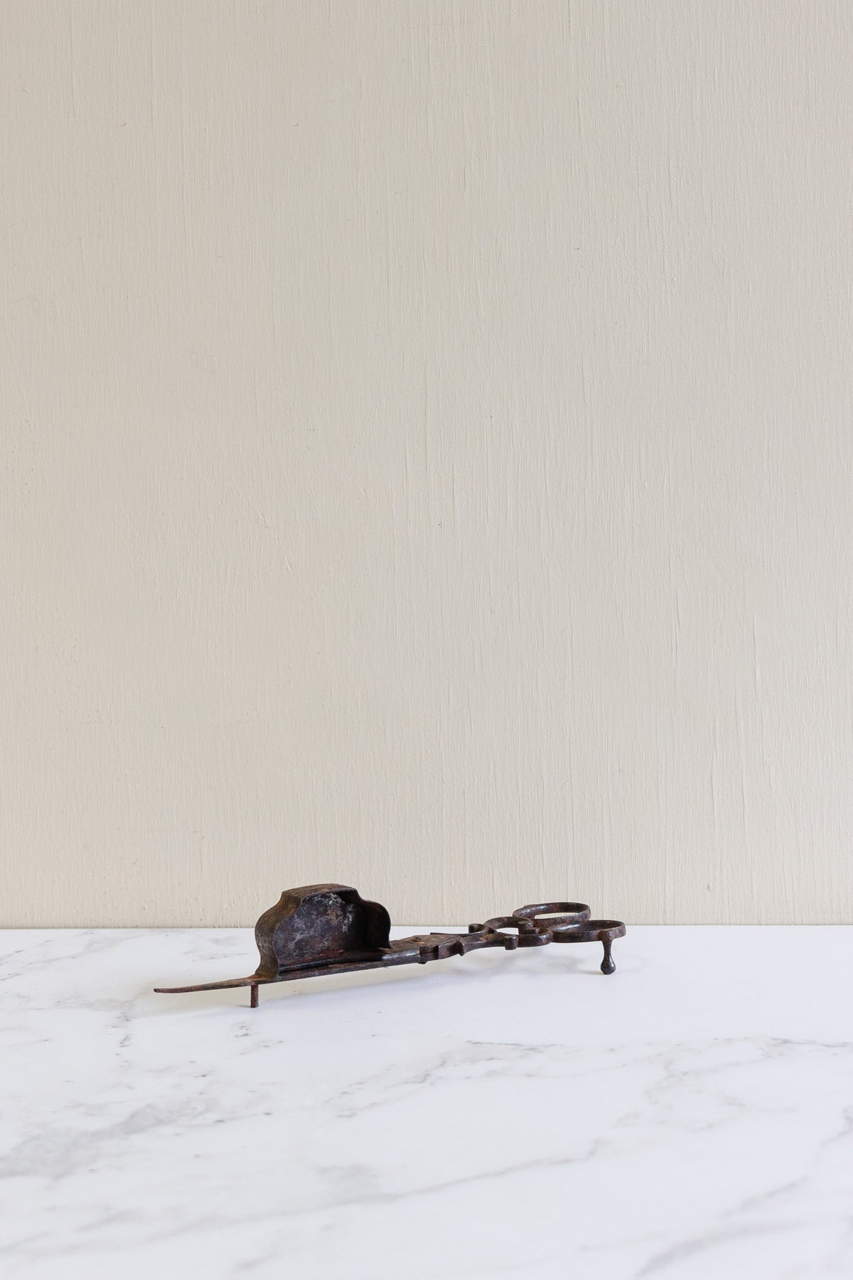 This antique French scissor candle snuffer features a beautifully forged iron form with elegant looped handles and a tapered snuffer head, designed to safely extinguish candles without smoke or wax splatter. The surface shows a rich, timeworn patina that highlights its age and character. Sourced from a brocante in Lille.