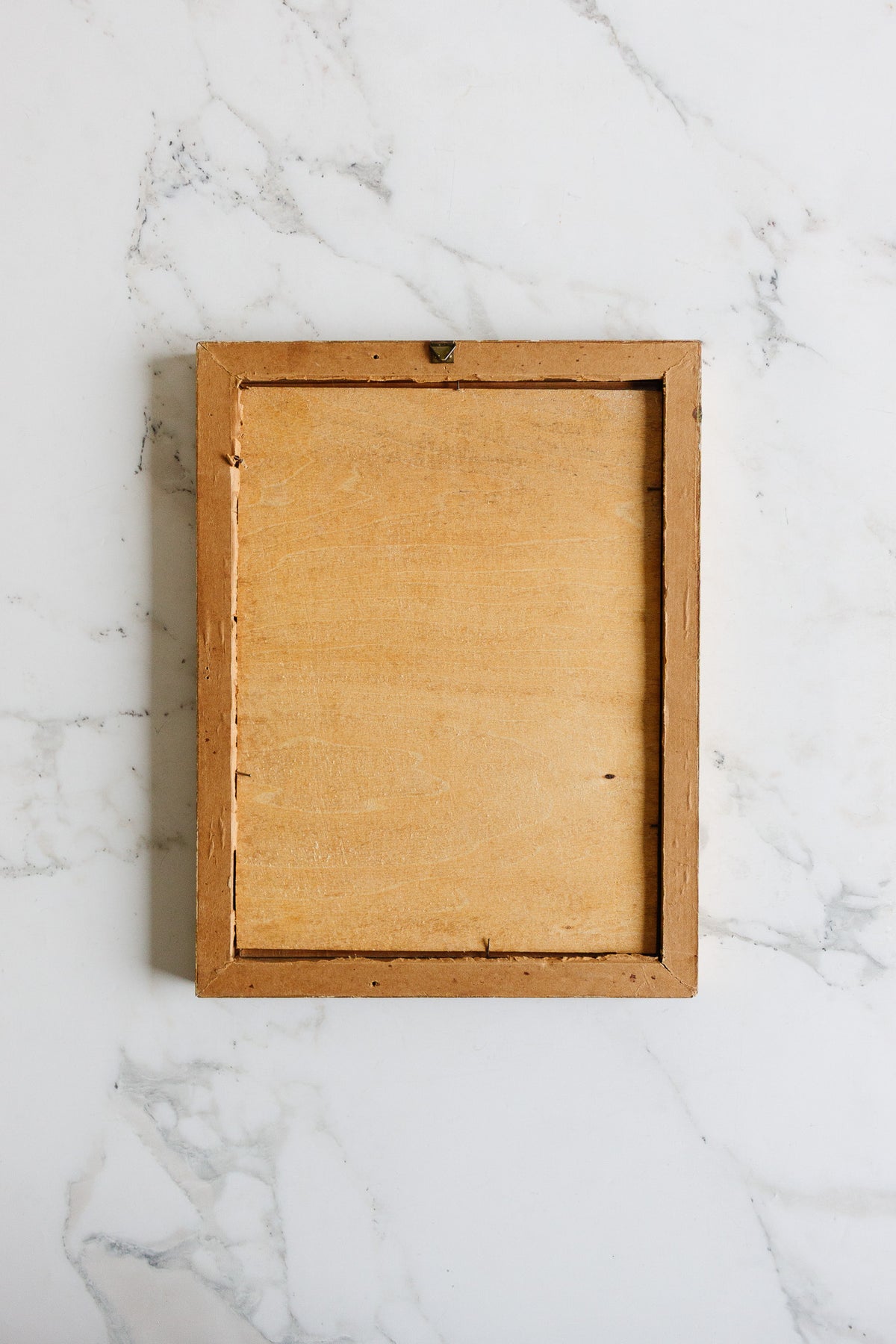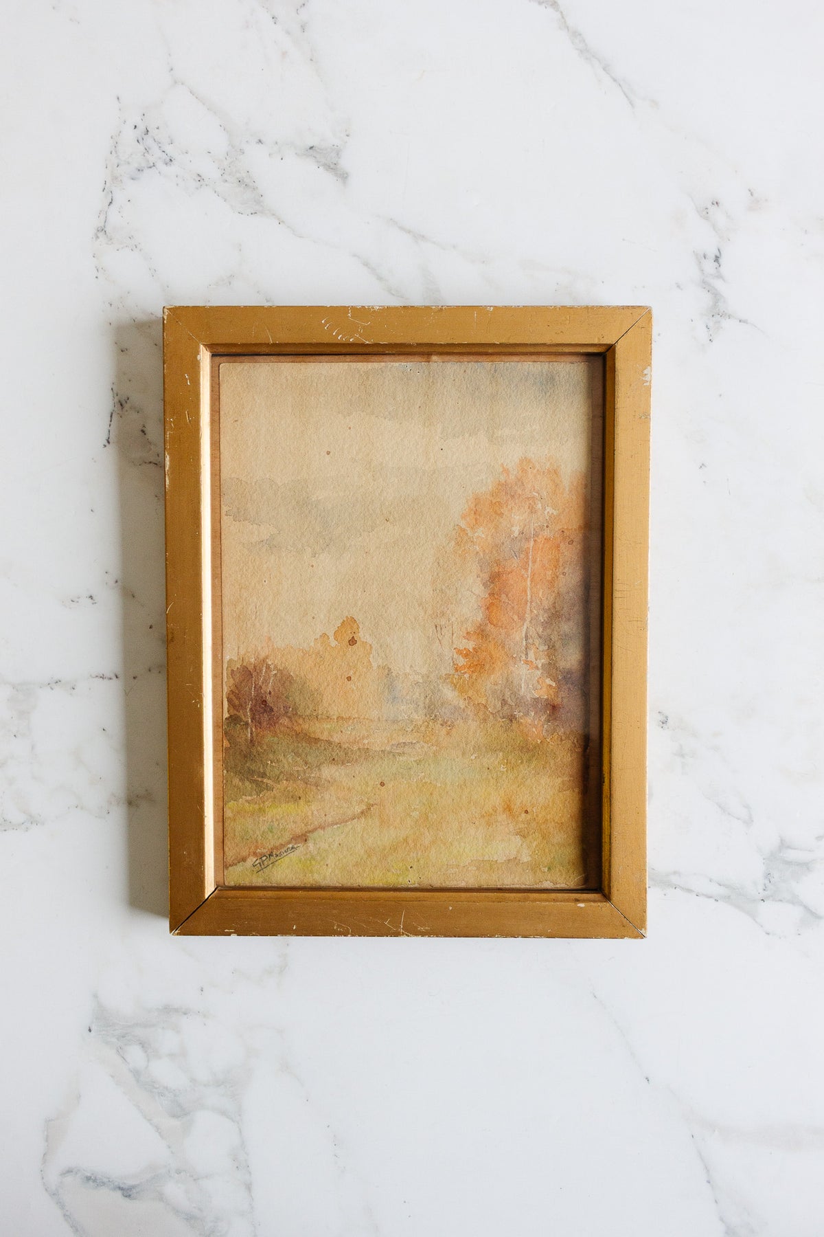 A vintage watercolor with dreamlike colours and shading signed by the artist and housed in a simple wood frame behind glass. Sourced from a brocante in Marseille.