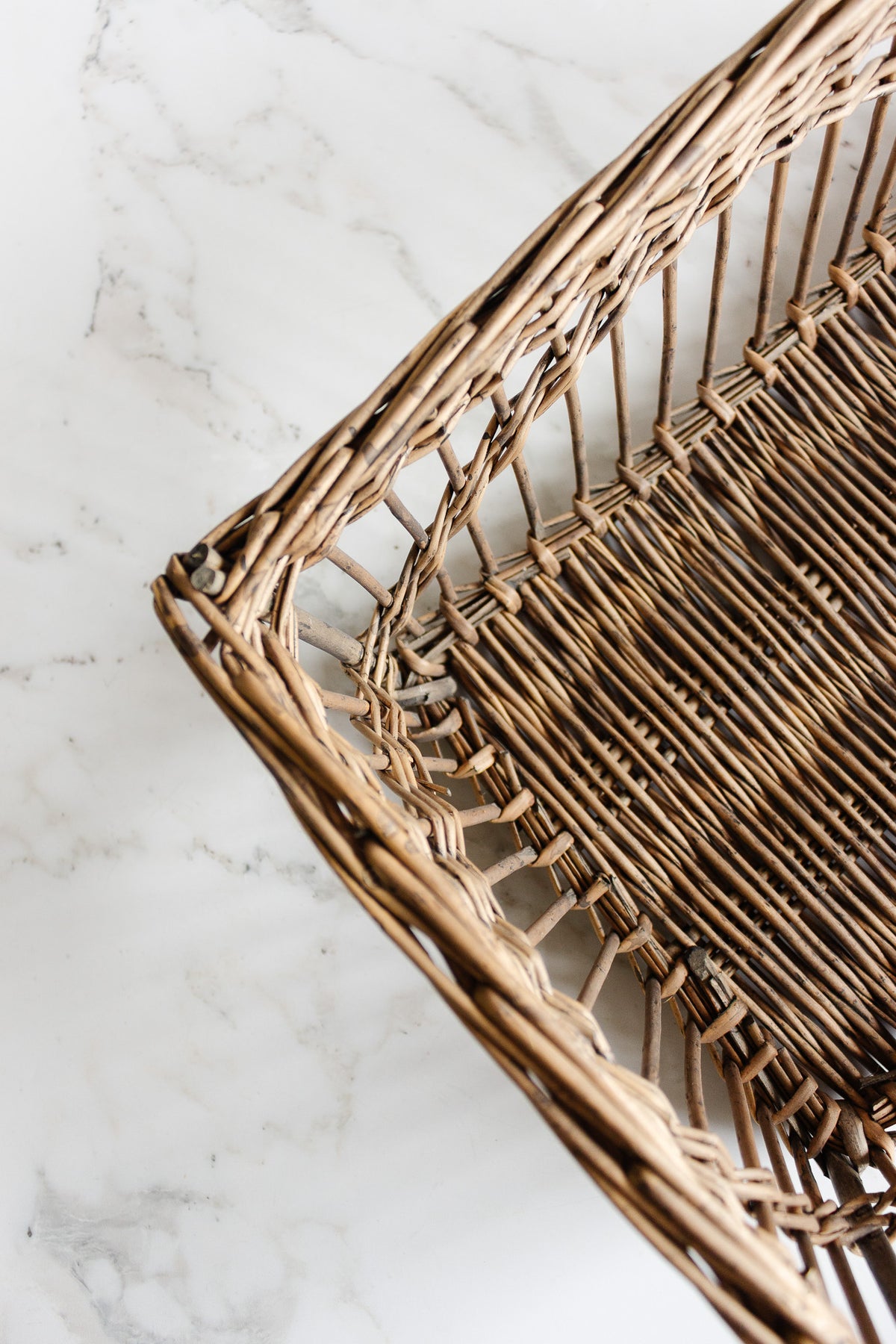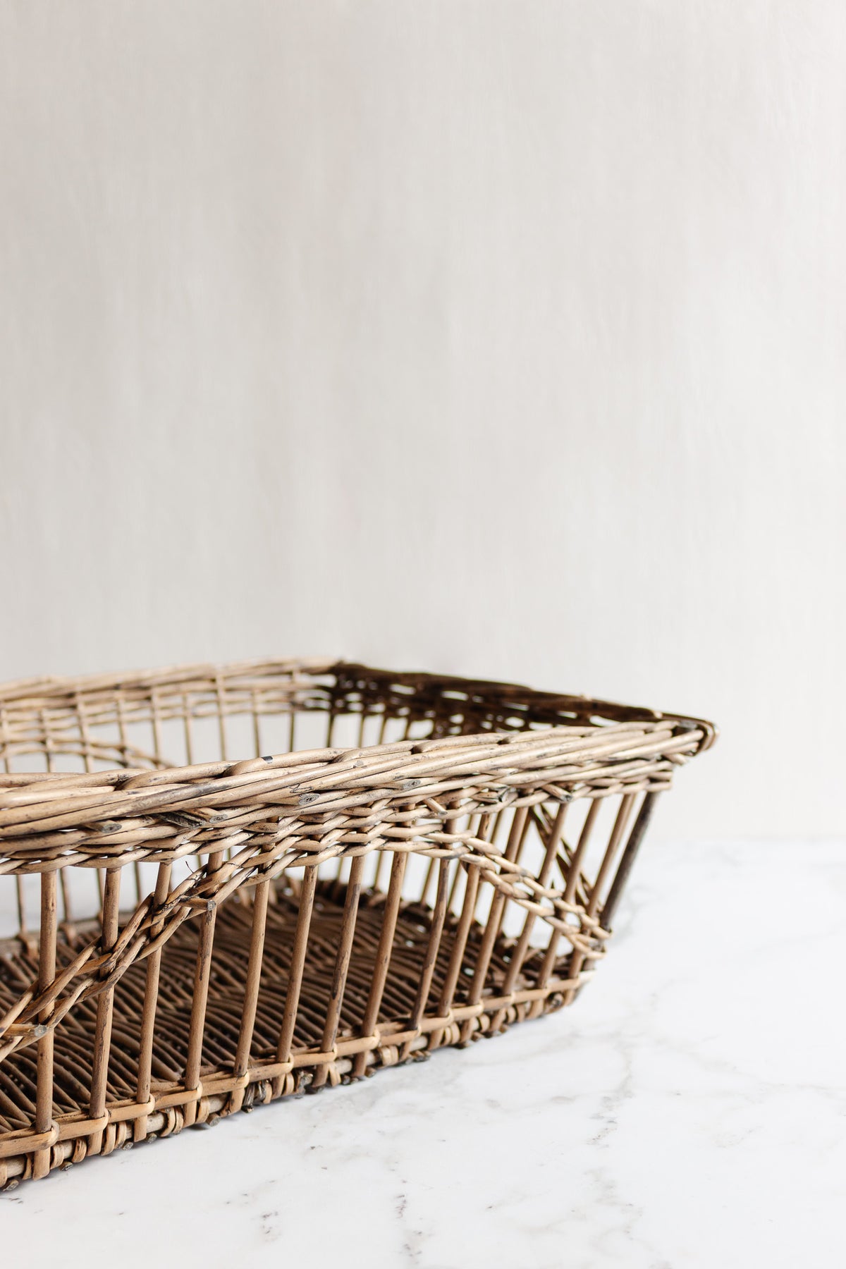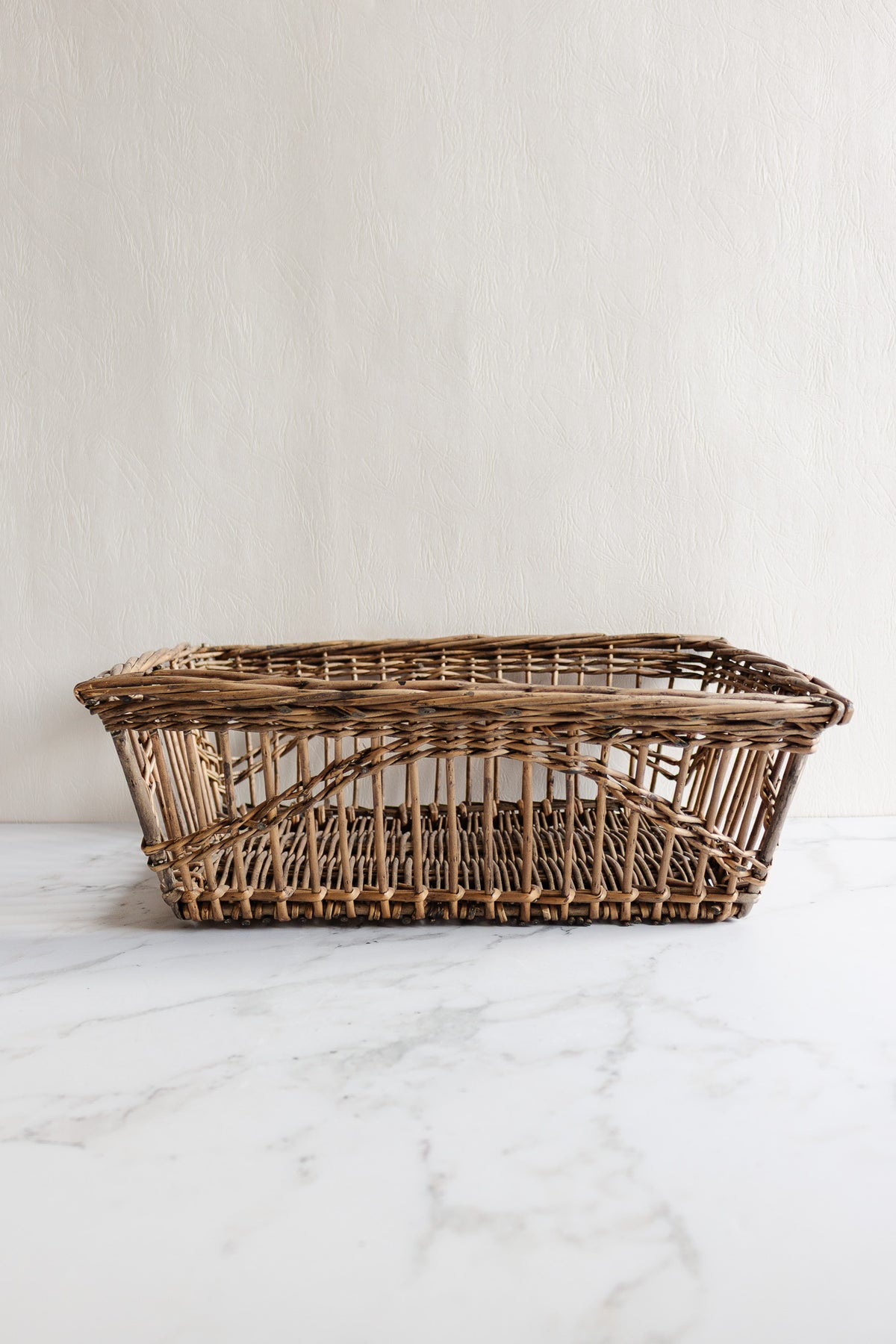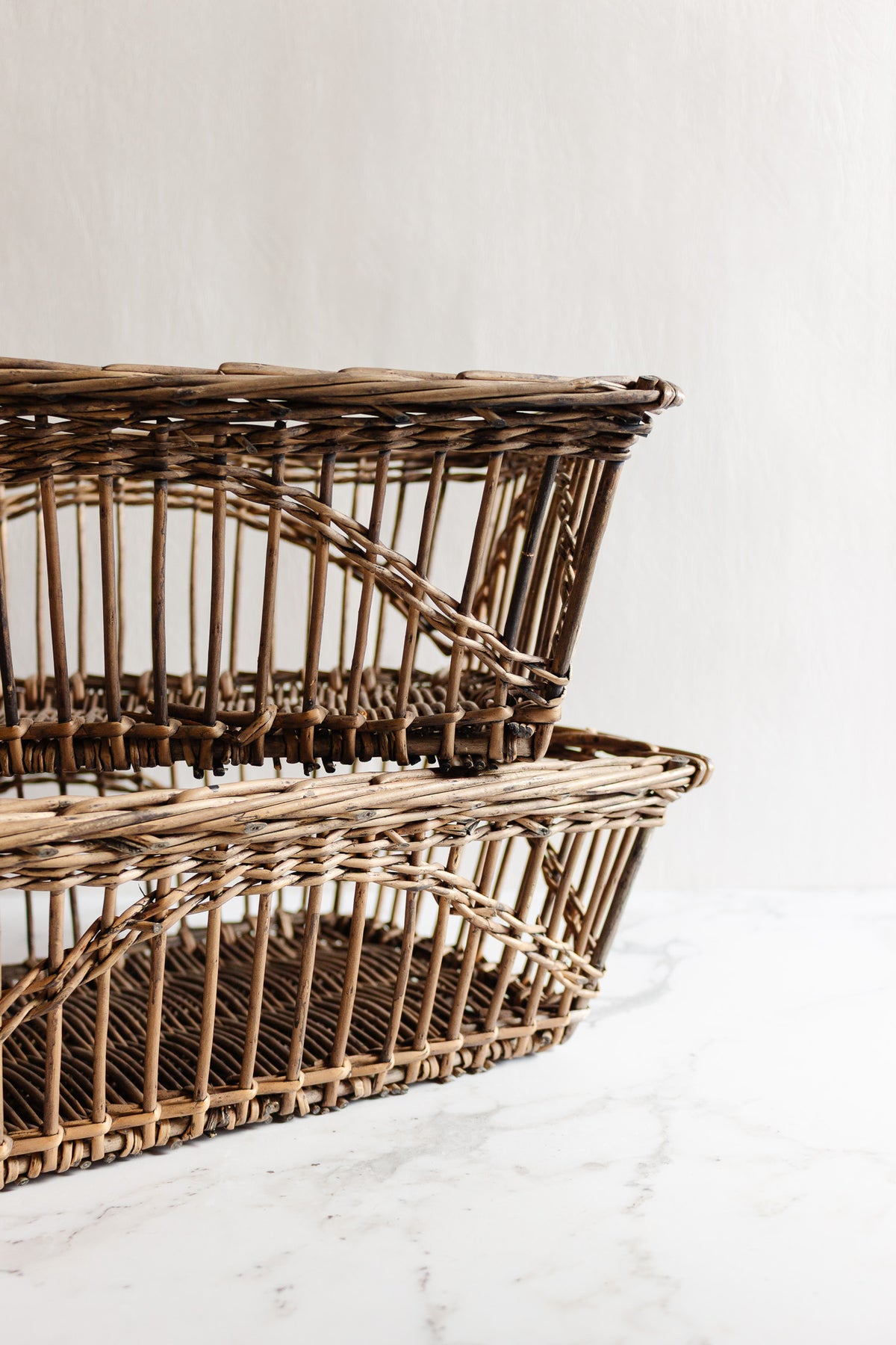 A beautiful antique French handmade spindle panier, showcasing the intricate weaving and sculptural form of traditional French basketry. Crafted entirely by hand, the basket features turned wooden spindles and a delicate frame. Once used for storing linens, bread, or sewing supplies, it now makes a striking decorative piece for modern interiors.