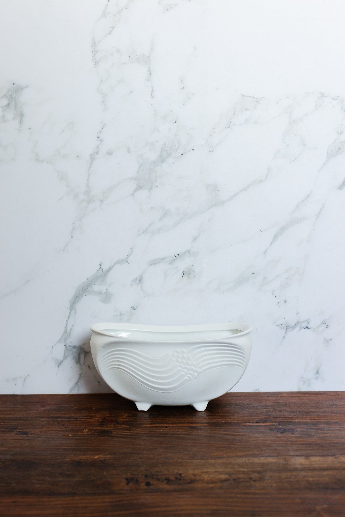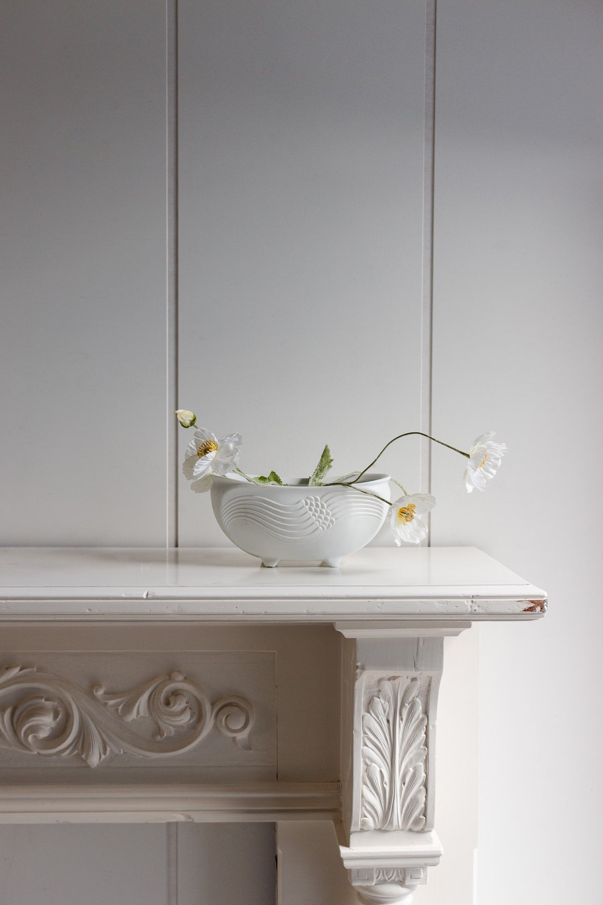 Kaiser Porzellan Jardinière No. 680 by Manfred Frey — Designed by German sculptor Manfred Frey, celebrated for his modernist porcelain works with AK Kaiser during the 1960s–1980s, this bisque porcelain jardinière exemplifies his refined, sculptural aesthetic. The matte white finish and fluid relief lines evoke movement and calm, characteristic of Frey’s ability to merge form and function in understated elegance. Signed M. Frey and numbered 680 on the base, this footed vessel was sourced from an antique dealer in Bamberg. Perfect as a minimalist planter, a centerpiece for fresh flowers, or a vessel for fruit, brushes, or utensils.