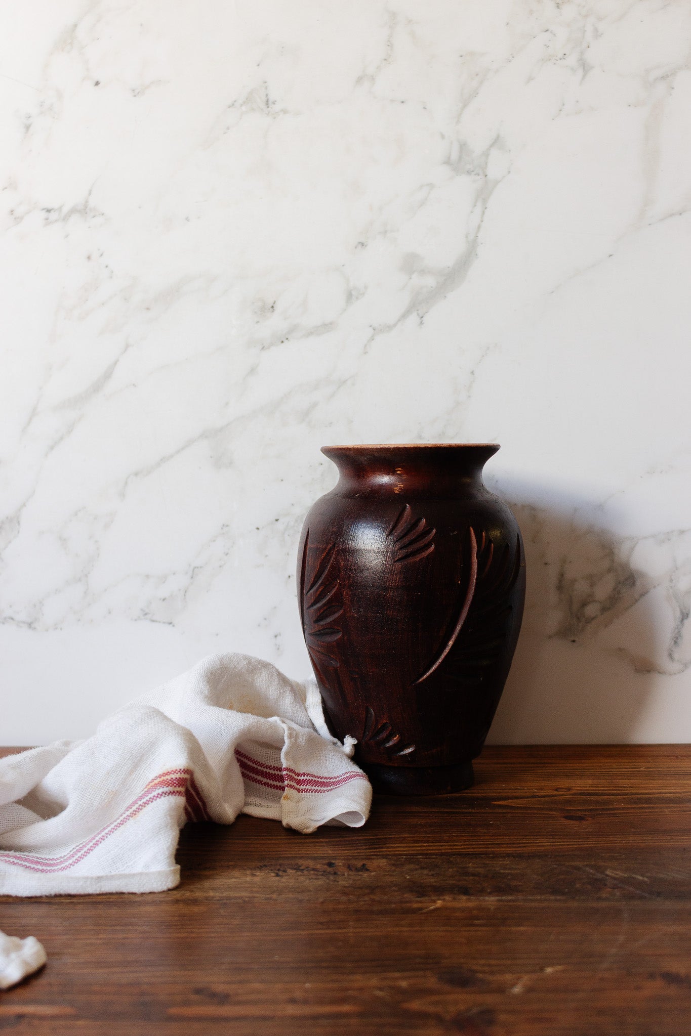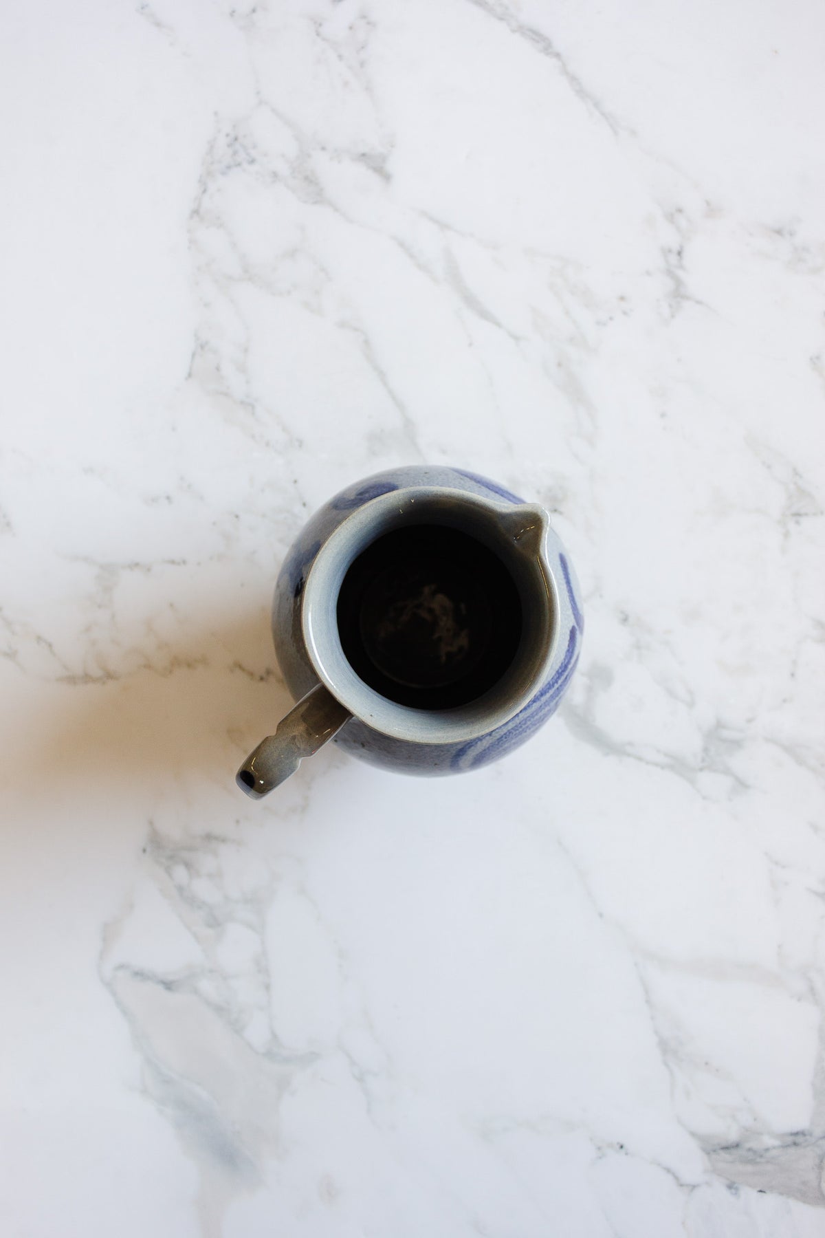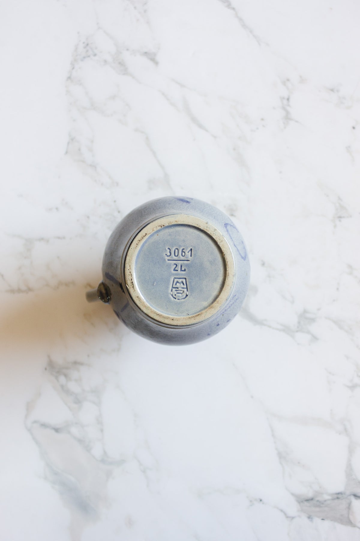 This vintage German Marzi & Remy stoneware 2 L pitcher is a striking example of mid-century Westerwald pottery. With its salt glaze finish in tones of cobalt and gray, the piece balances utility and aesthetic presence beautifully. Sourced from a market in Bamberg, it works equally as a dramatic serving pitcher or a sculptural vase for bold blooms.
