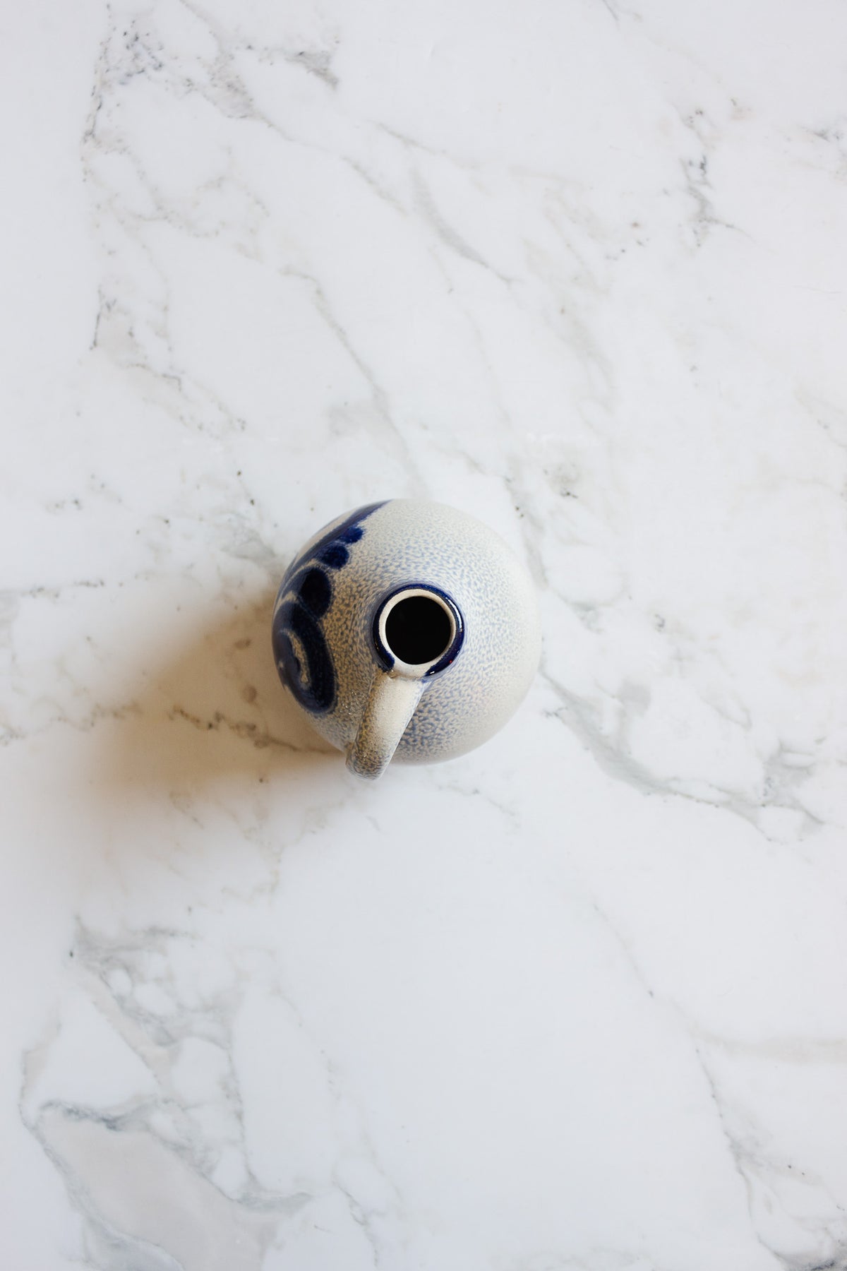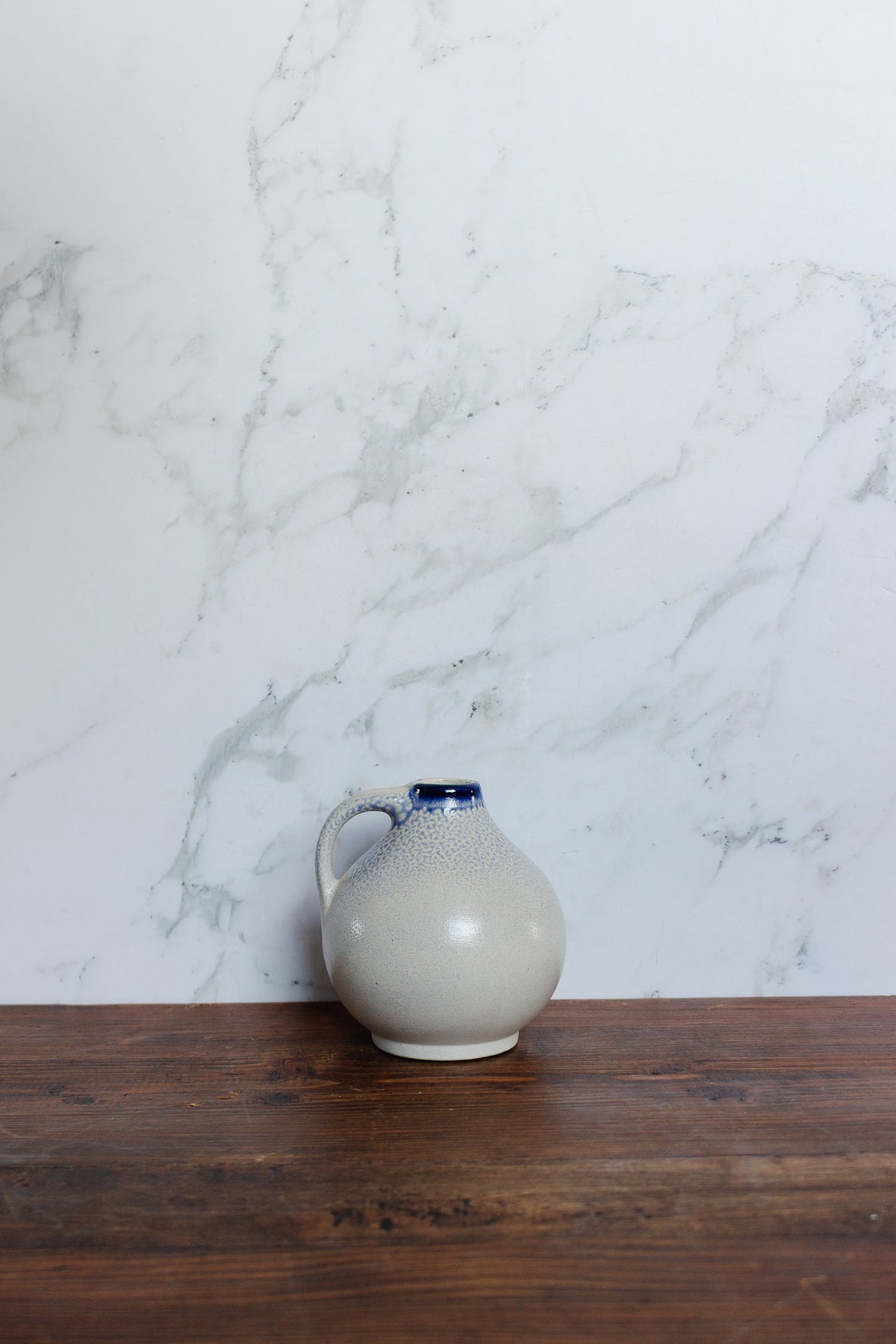 This vintage German jug features a classic salt-glazed finish with traditional grey tones and bold cobalt blue decoration. Its sturdy stoneware form and timeless motif make it a versatile accent for your home.