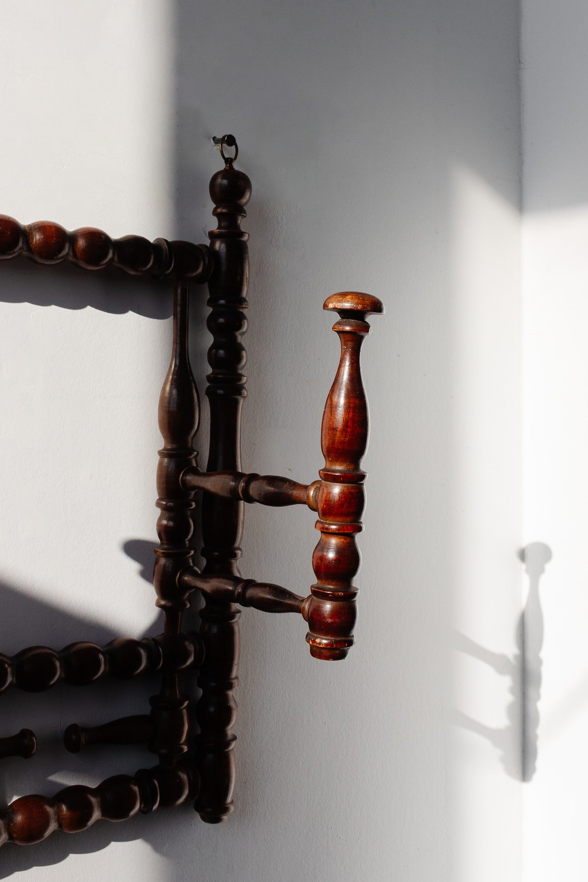 We love discovering Napoleon III–era pieces, especially those with their distinctive, deeply ebonized wood finishes. This rare late 19th-century hat rack showcases a beautifully shaped frame with exquisite bobbin-turned details and adjustable hooks—a perfect balance of form and function.