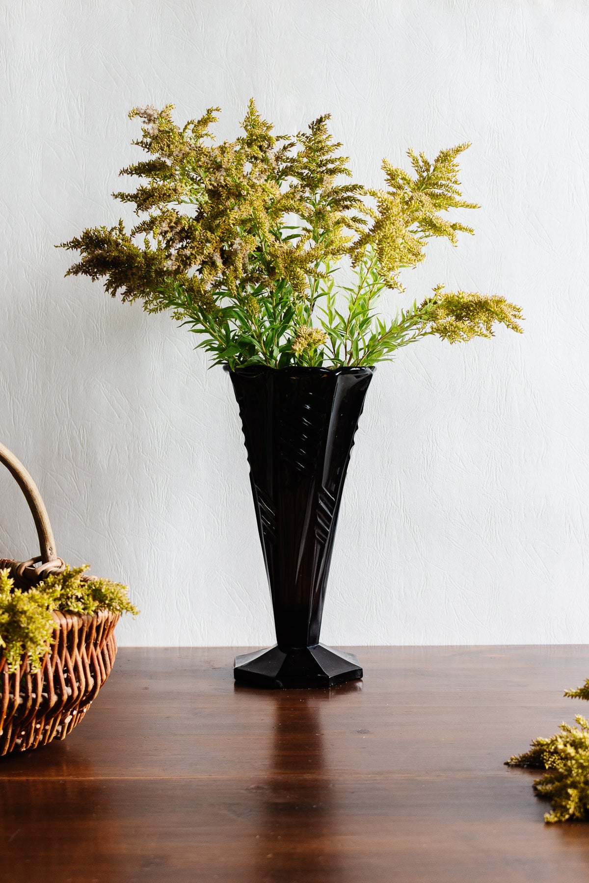 Art Deco glass vase, likely from the early to mid-20th century. This striking and heavy piece captures the bold sophistication of the Art Deco era with its geometric relief and confident silhouette. Crafted from tinted glass that catches the light beautifully, it offers a subtle play of tone and transparency. Both sculptural and functional, it stands as a statement of refined modernity—perfect as a standalone accent or filled with a simple arrangement to highlight its clean lines.