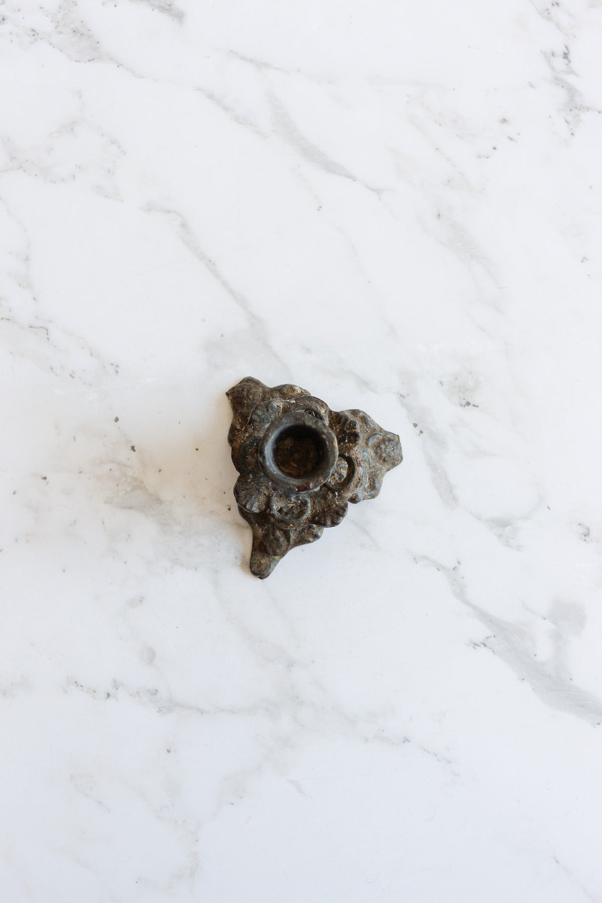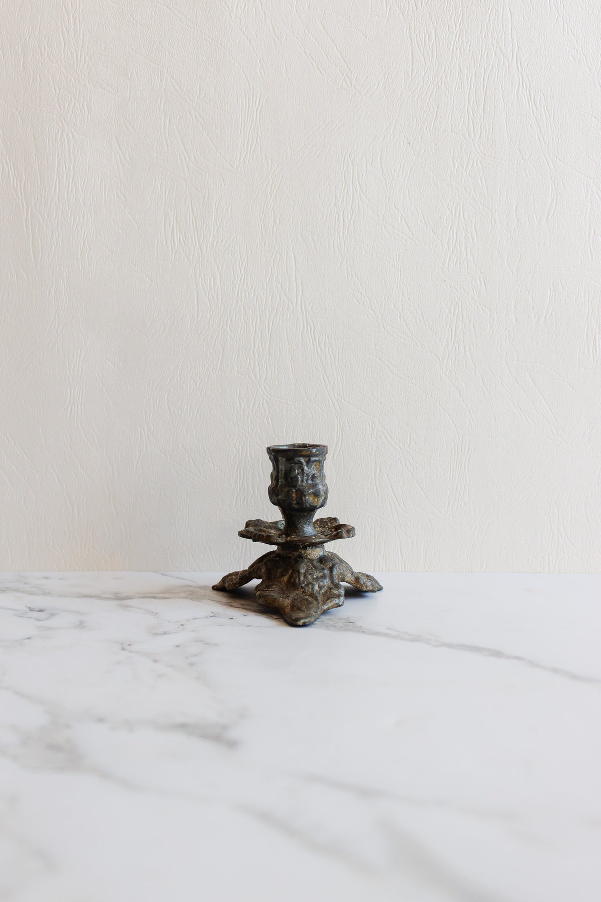 Antique French ornate candlestick pair. Sourced from a brocante in Marseille, this elegant duo features intricate detailing and a beautifully aged patina that speaks to their history. Crafted from metal with finely cast ornamentation, each candlestick stands as a small work of art—balanced in proportion and rich in character. Perfect for a mantel, dining table, or sideboard, they bring warmth and timeless French refinement to any setting.
