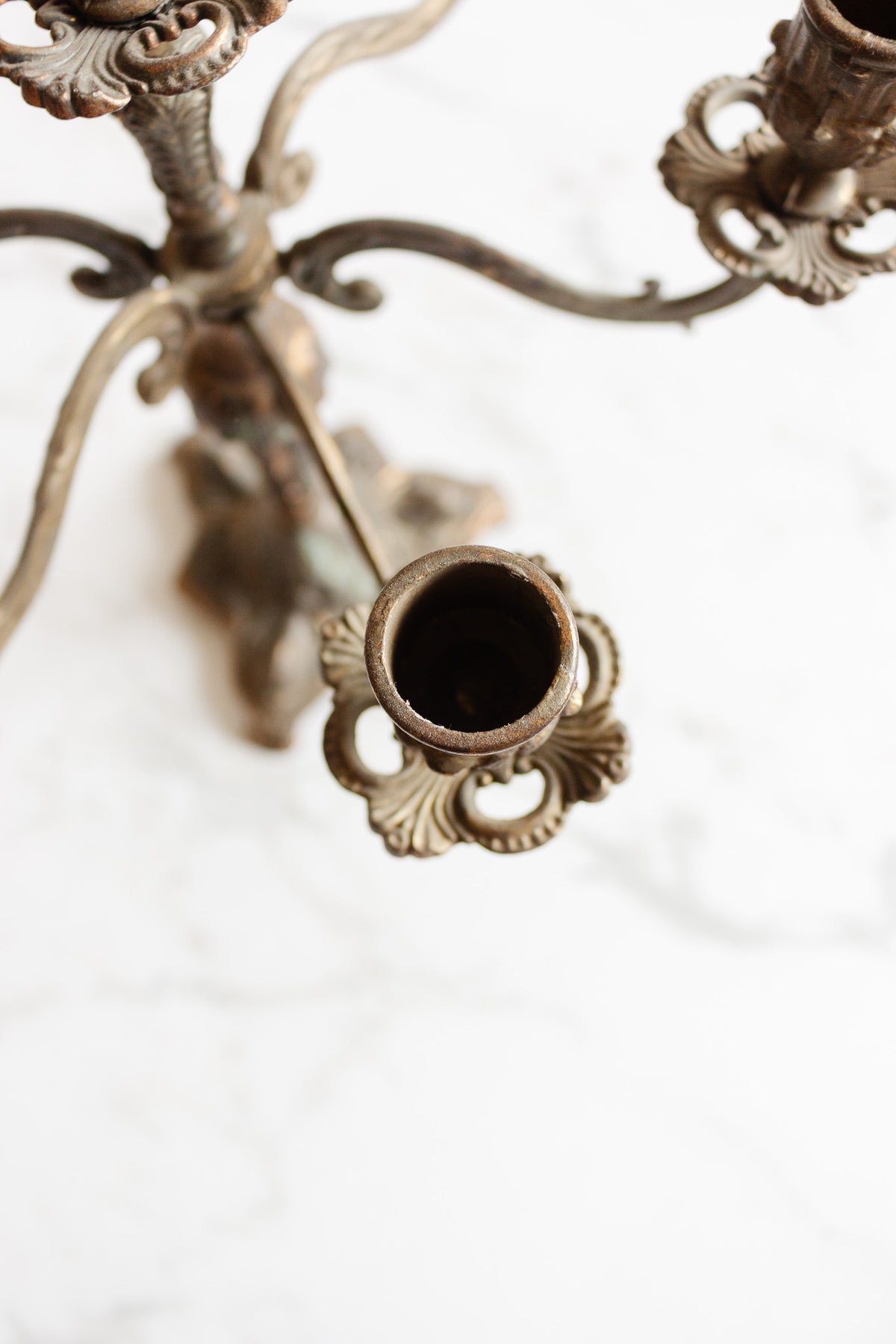 A vintage French seven-arm candelabra in richly patinated brass. Its ornate form rises with scrolling arms and decorative flourishes, each branch designed to hold a taper and cast a warm, layered glow. Both dramatic and refined, it carries the grandeur of traditional French interiors while remaining versatile enough to anchor a modern table or mantel with sculptural presence.
