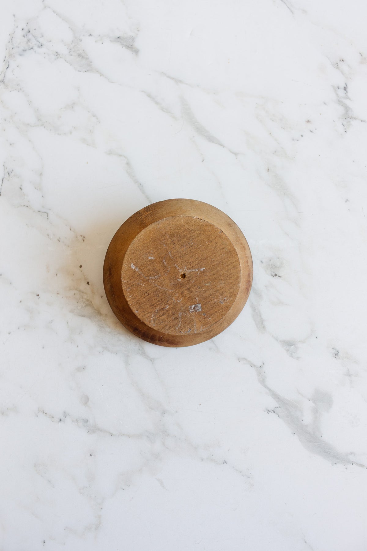 This vintage German turned wooden candlestick has a simple, sculptural beauty that speaks to mid-century European craftsmanship. Its low, rounded form is thoughtfully designed with a central metal spike to secure a taper candle. The warm patina of the wood reveals years of gentle use, giving it a soft, natural glow.