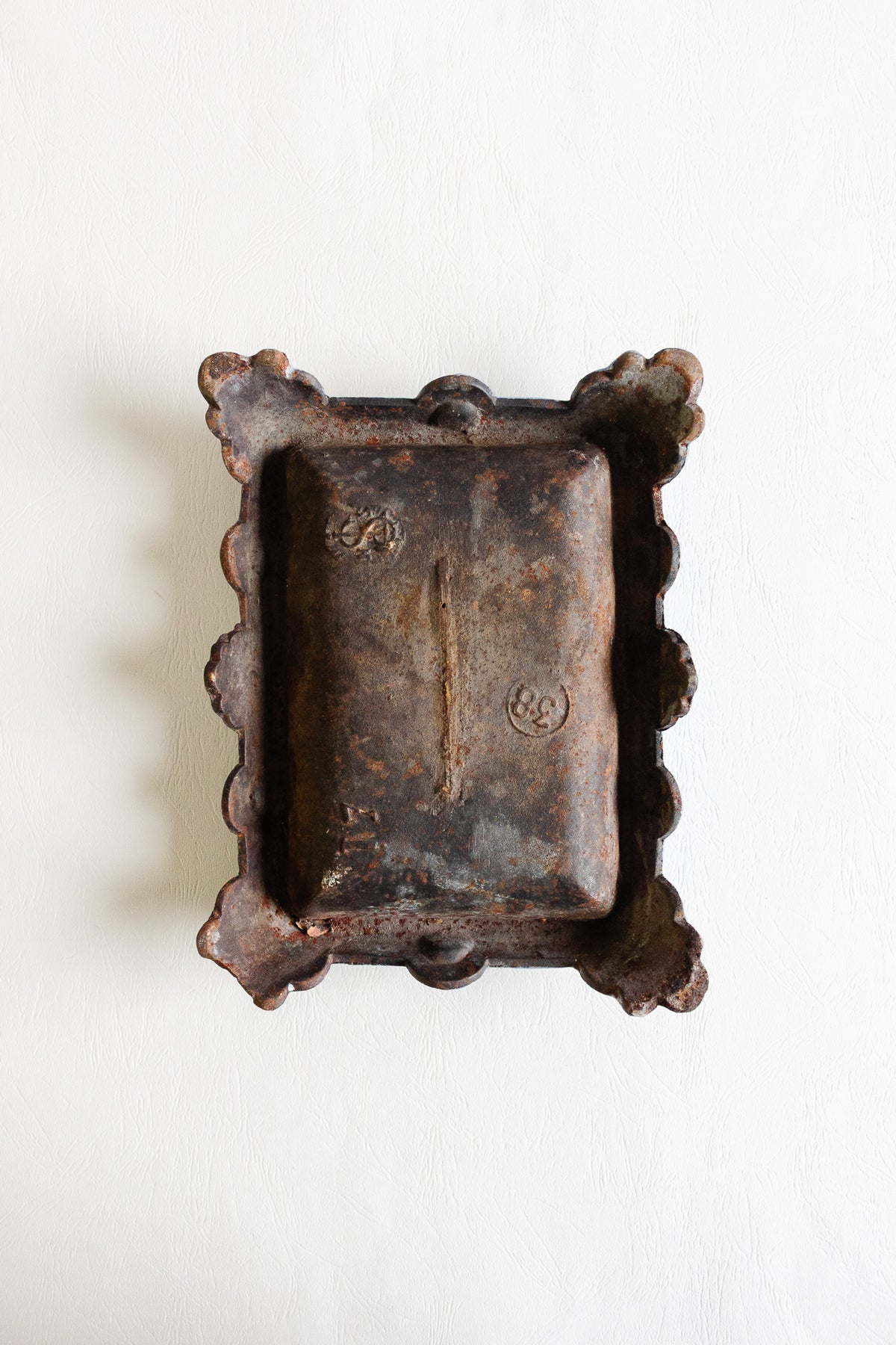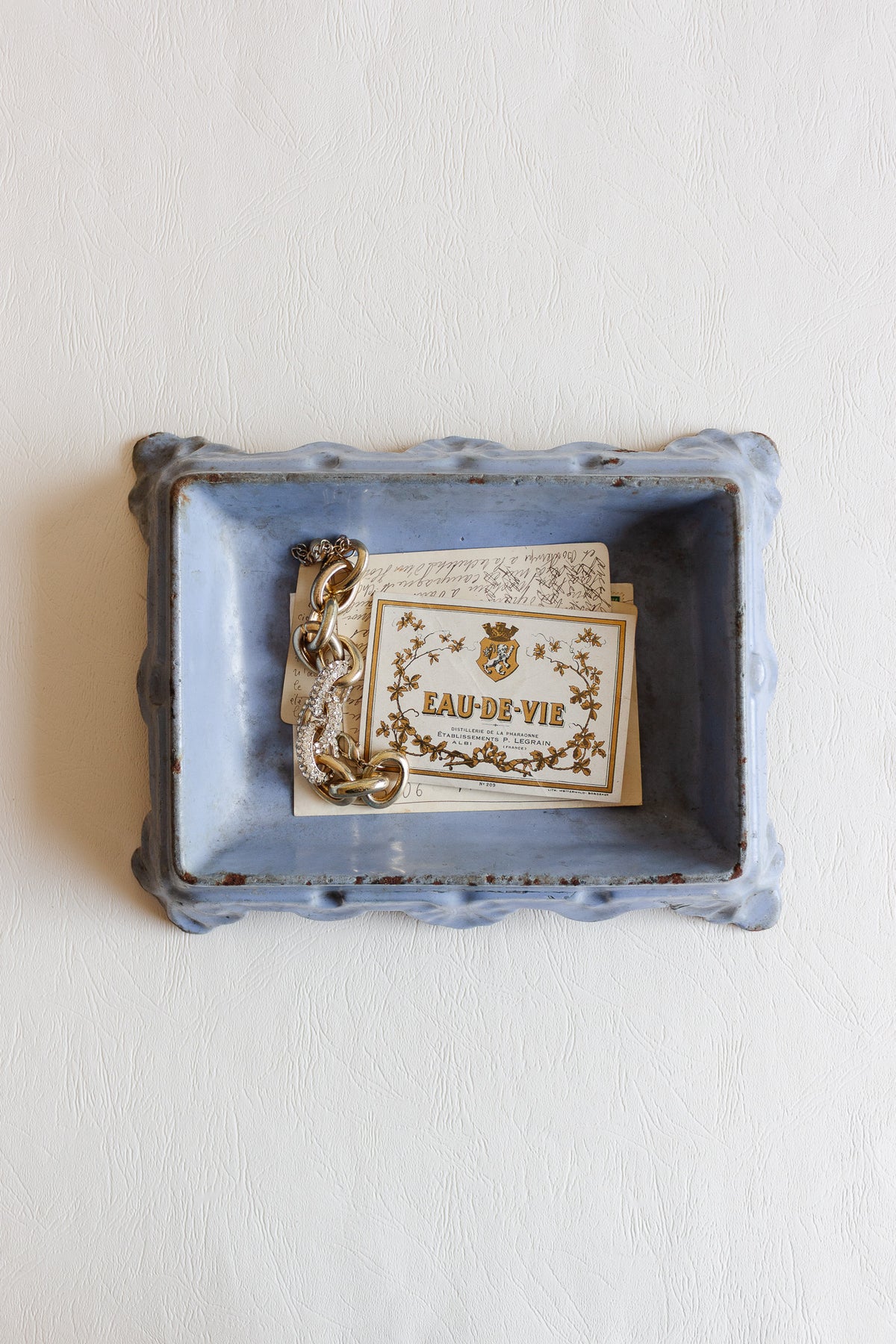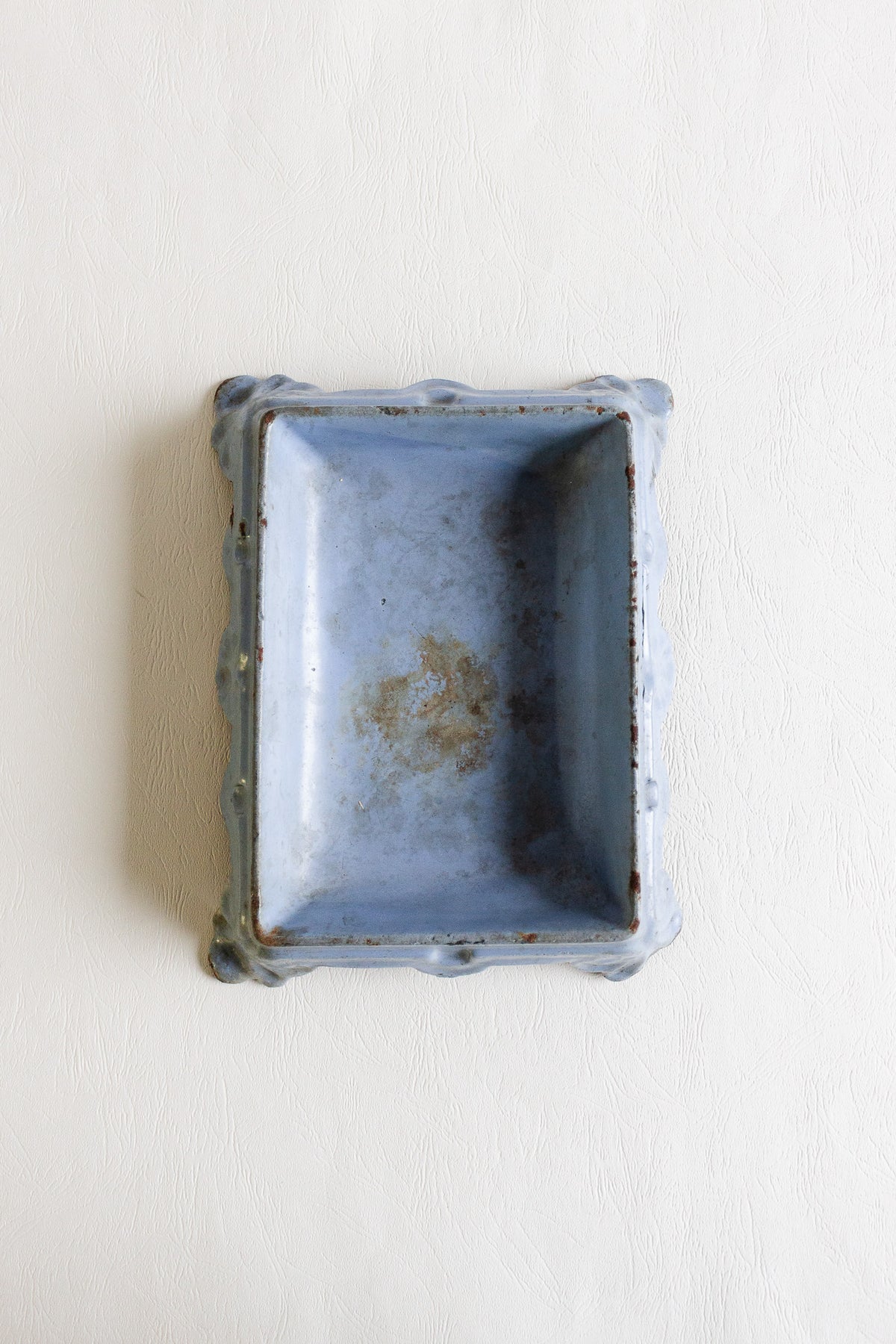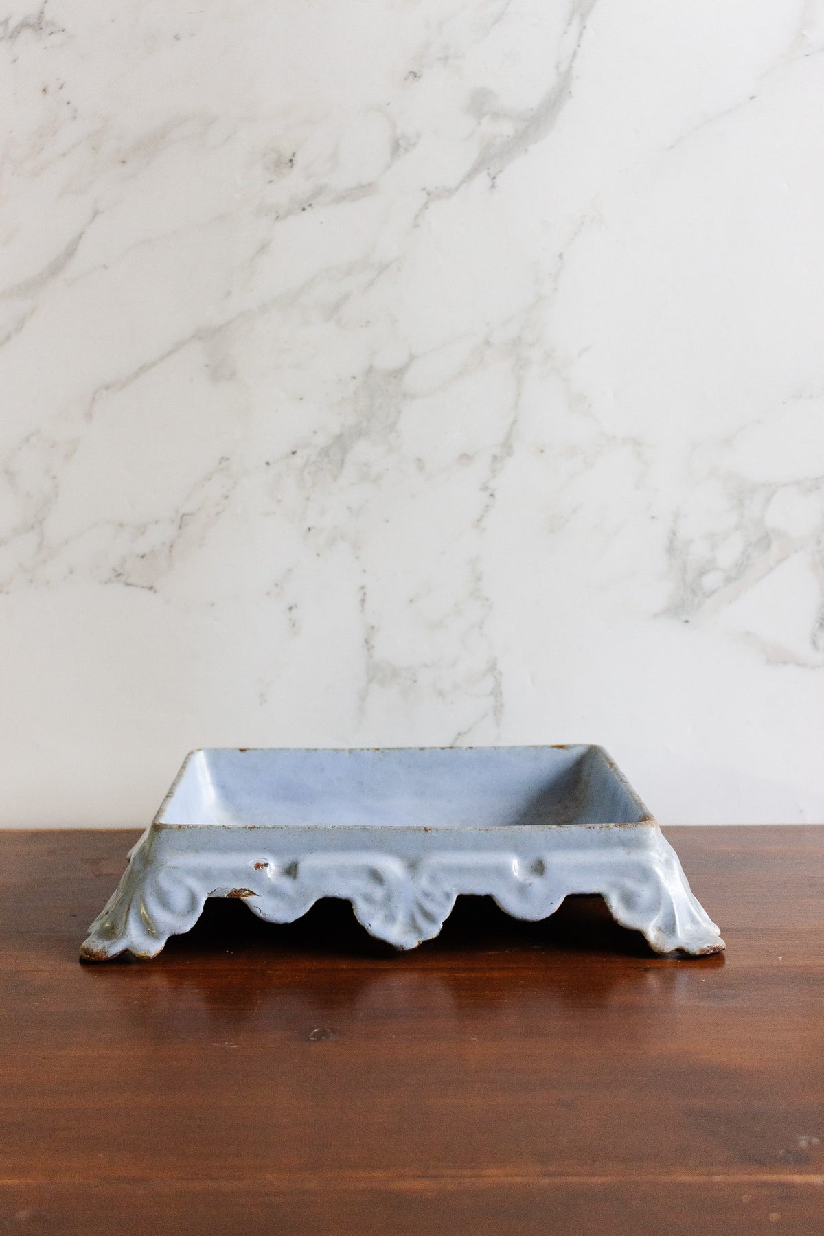 This antique French cast iron spittoon features a softly contoured square form and a beautifully aged pale blue finish, with gentle wear that adds depth and character. Once a utilitarian object, these pieces are having a moment, and now they work effortlessly as a decorative catchall, planter base, or sculptural accen. Sourced from a brocante in Marseille.