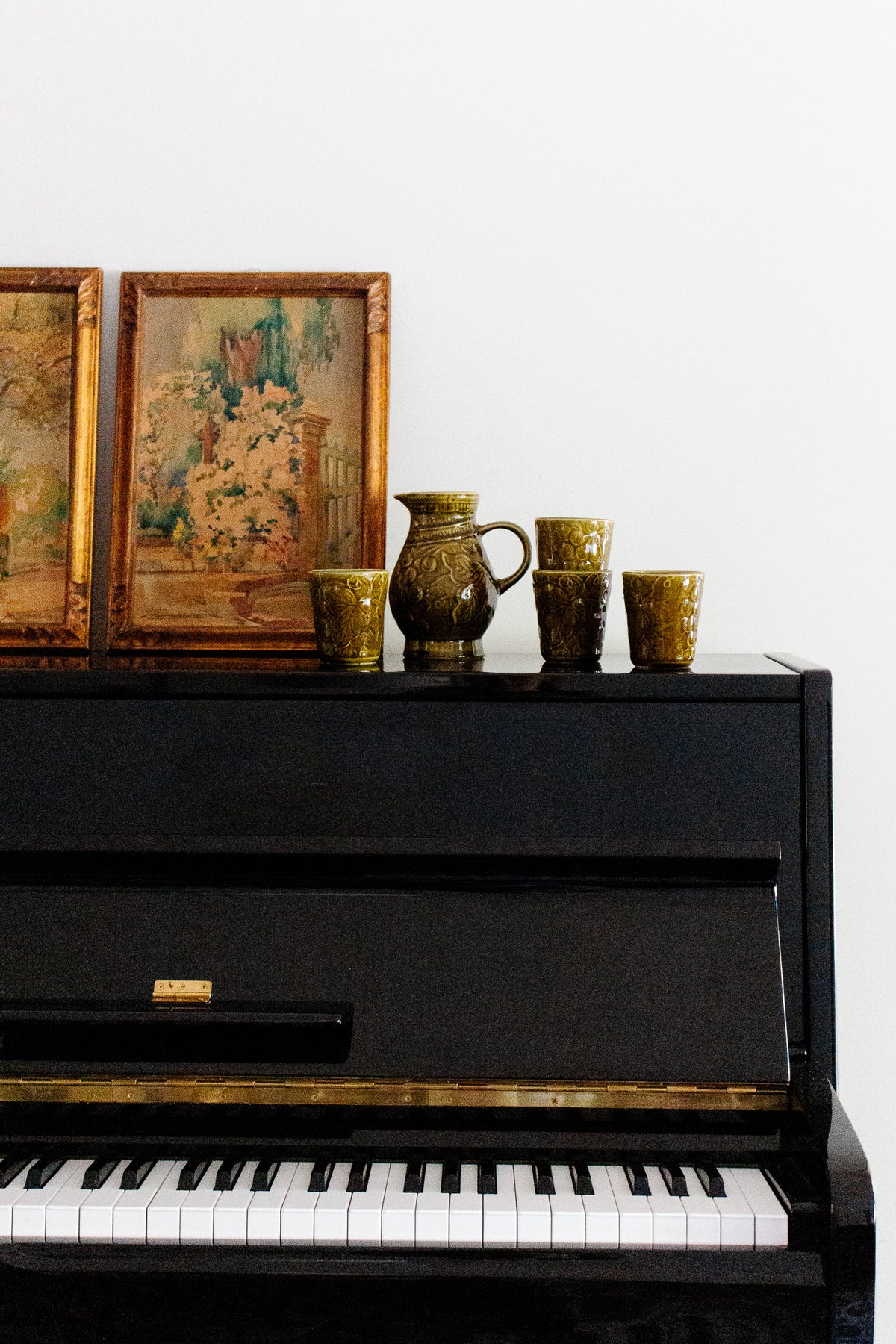 A black upright piano with visible keys is topped with two framed paintings and a drinkware set, featuring a jug and four cups in green ceramic, arranged against a plain white wall.
