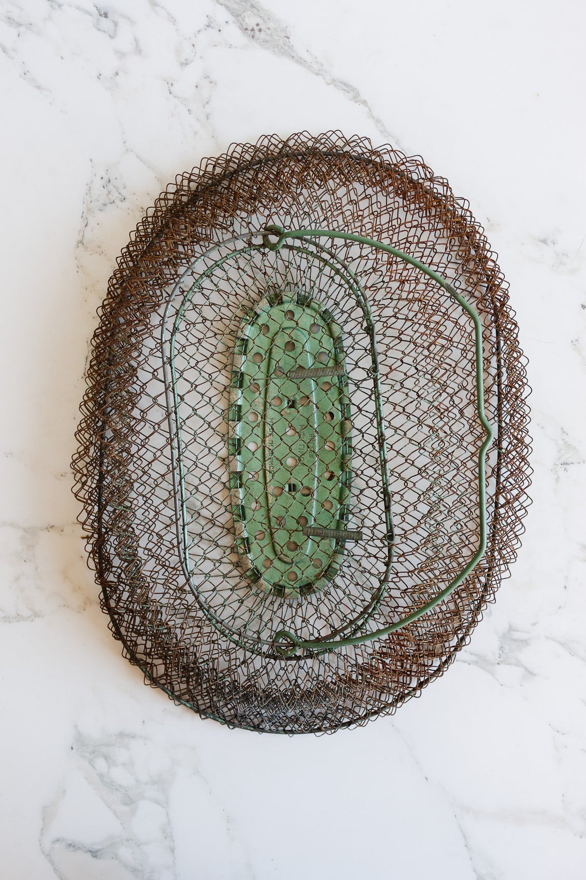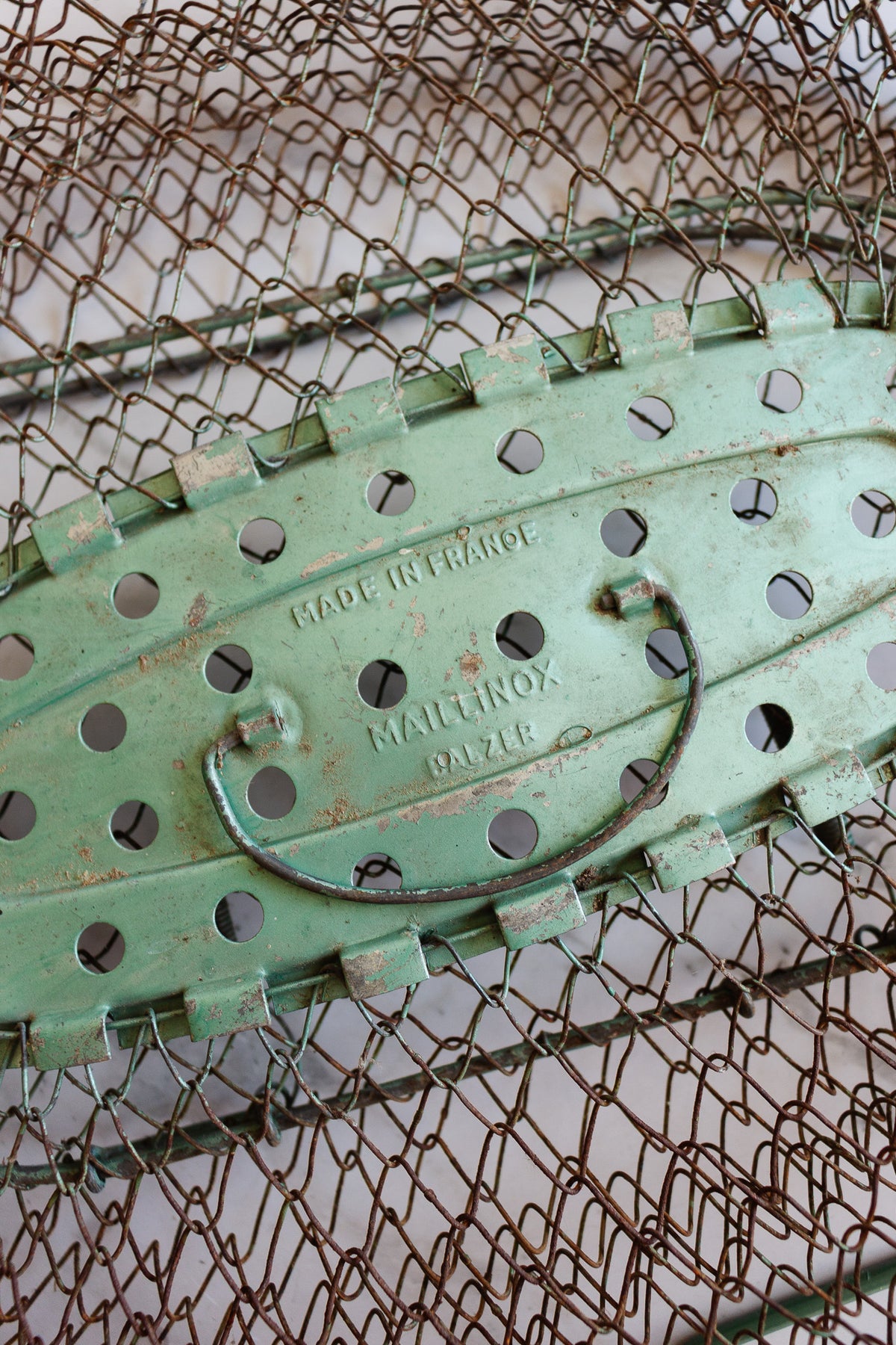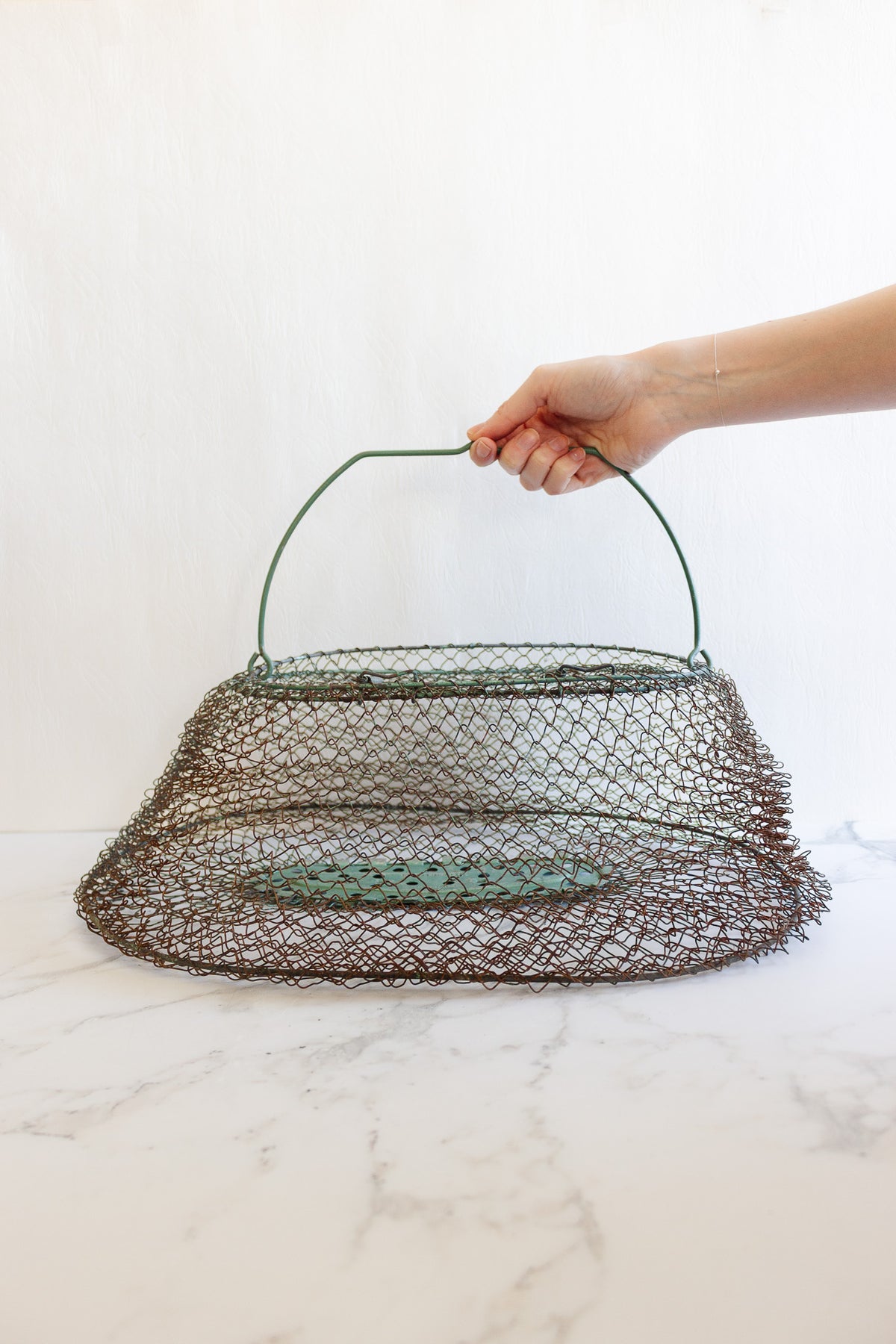 This antique French collapsible wire fish basket is a beautifully functional relic of rural life, once used by fishermen to keep their catch fresh in the water. Crafted from interwoven metal wire with a gracefully expanding body, it folds neatly when not in use—an ingenious example of 19th- or early-20th-century design. Its patina and gentle wear tell the story of years by the rivers of France.