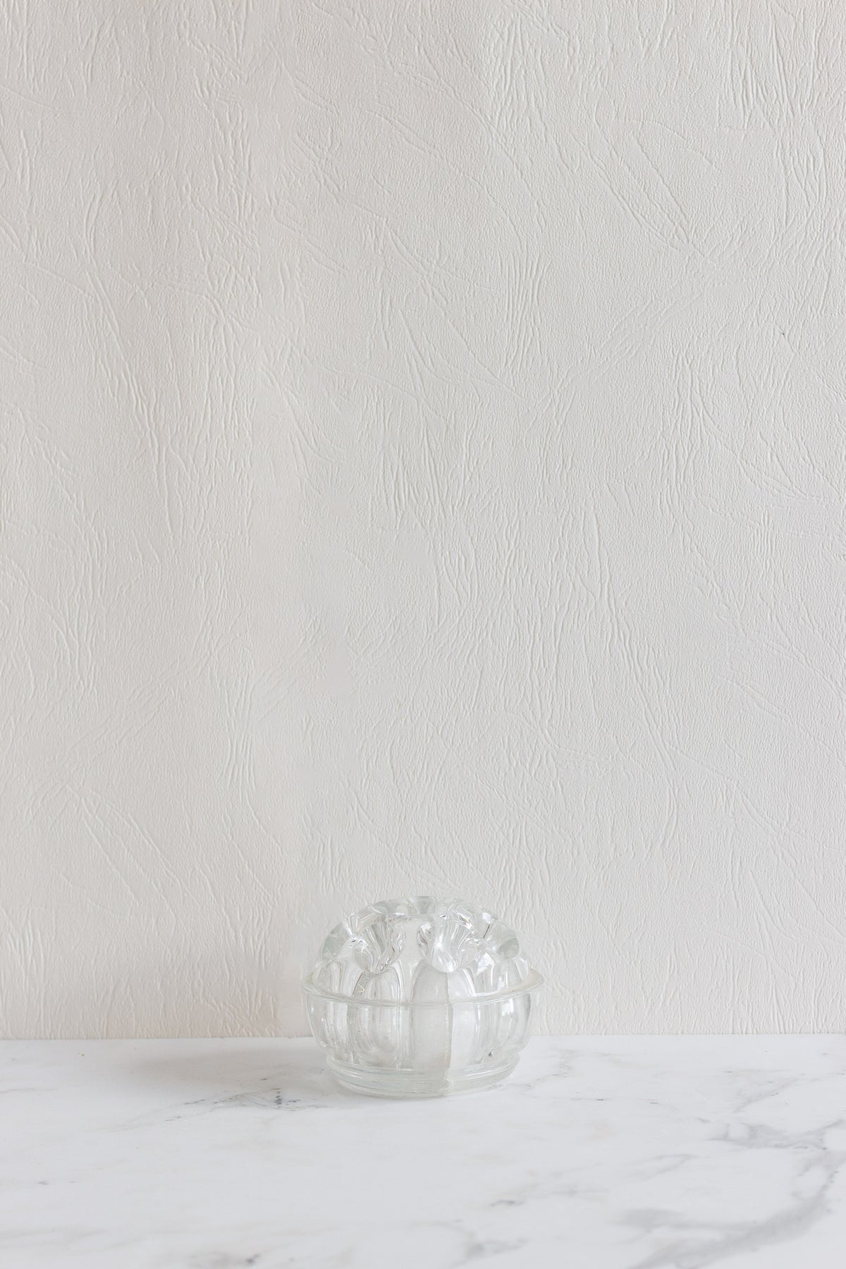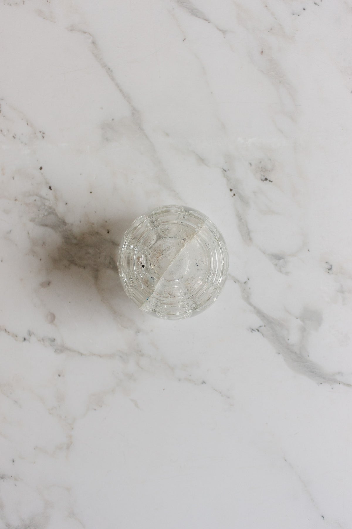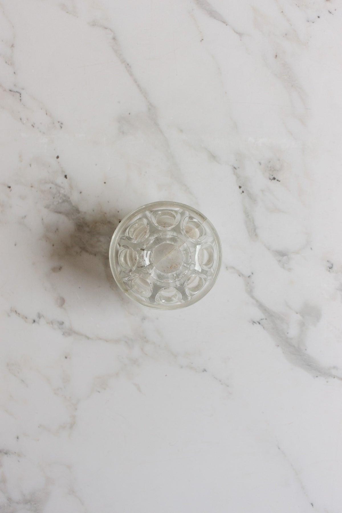 Vintage French thick glass floral frog. Solid and weighty, this clear glass frog was designed to hold flower stems securely in place inside a vase or bowl. Its circular form and multiple openings reflect the thoughtful functionality of early 20th-century French design. The substantial glass and soft wear from use give it a tactile presence—simple, sculptural, and endlessly versatile.