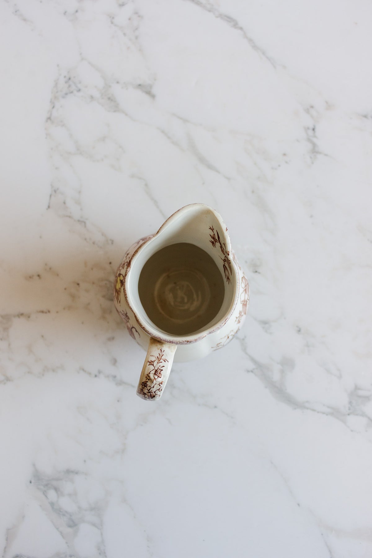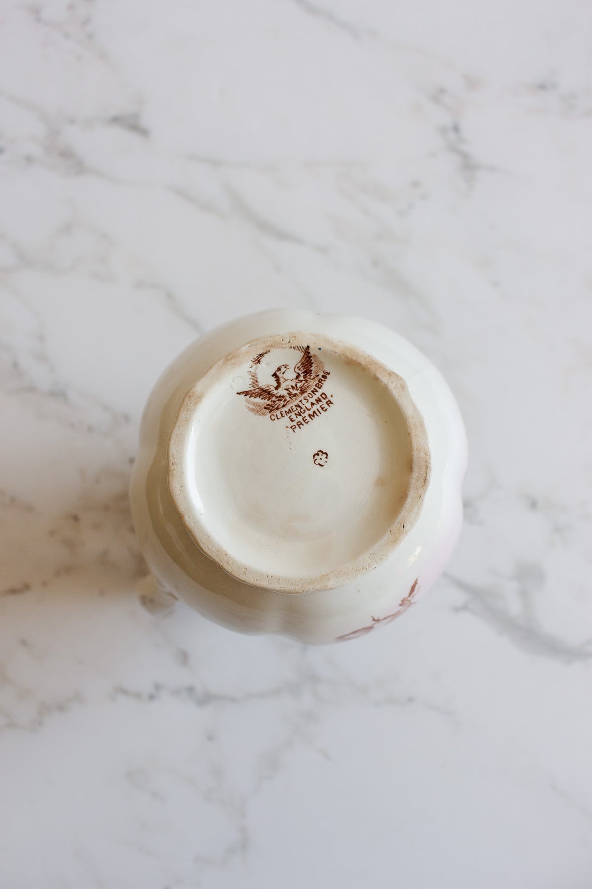 Antique Clementson Bros. Premier pitcher, England. A fine example of late 19th-century English earthenware, this pitcher features the Premier pattern by the esteemed Clementson Brothers pottery. The detailed transfer design and graceful silhouette highlight the balance of utility and ornament characteristic of Victorian tableware. With gentle crazing and age marks that speak to its history, it’s a beautifully preserved piece—equally striking as a display object or used for fresh blooms. Sourced from a brocante in Marseille.