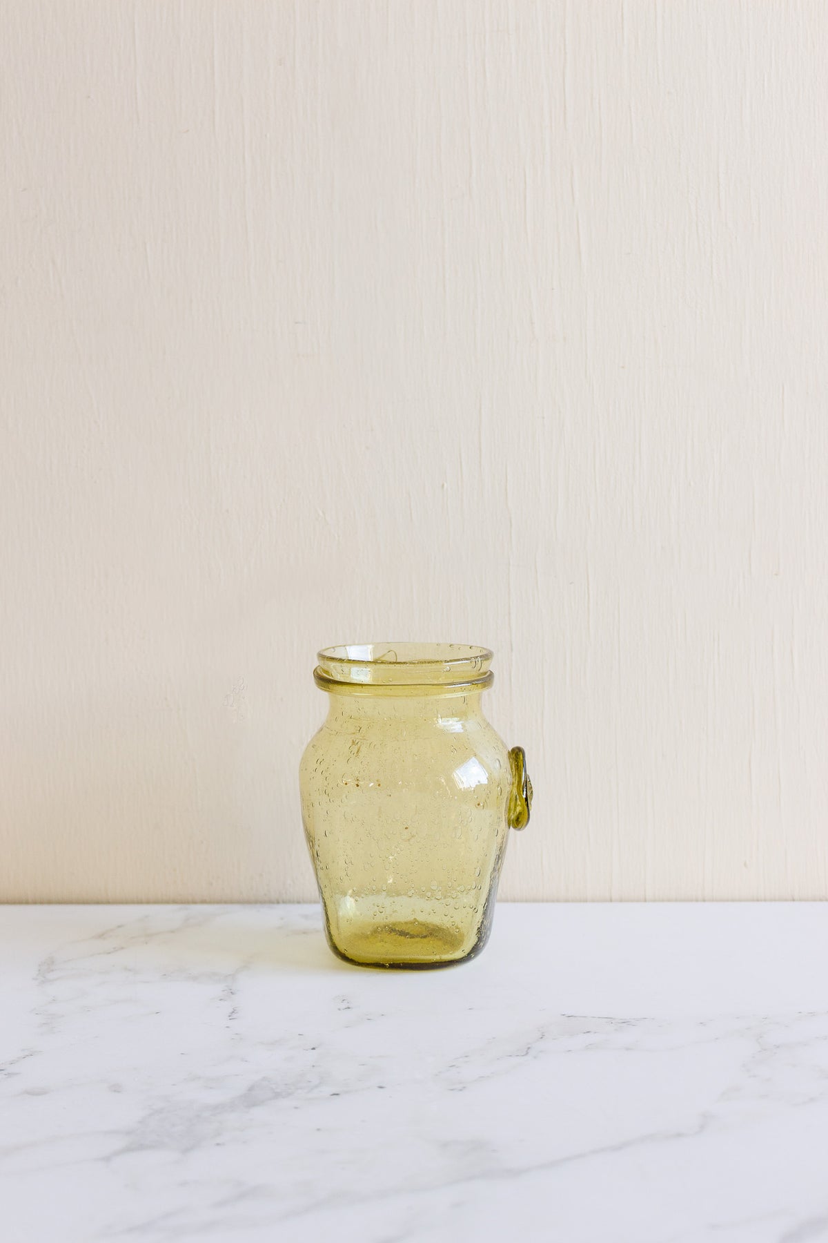 A vibrant 1960s yellow glass storage jar from Biot, France, handcrafted in the traditional Provençal style. The glass features the characteristic suspended air bubbles that Biot is celebrated for, along with an embossed “Biot” seal. Both decorative and functional, this piece adds a warm pop of colour to open shelving or a countertop and works beautifully for storing dry goods or small objects. Sourced from a brocante in Marseille.