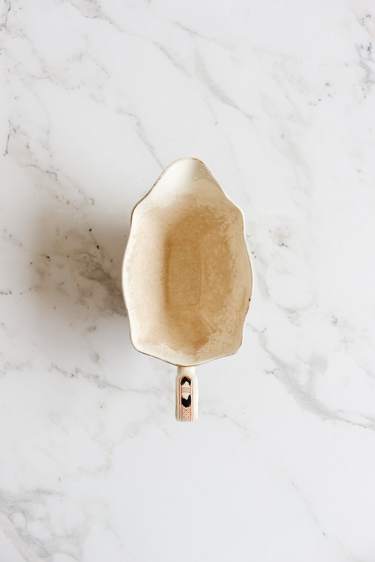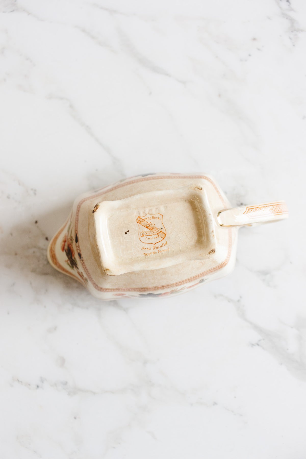 This early 1930s Duchess Royal gravy boat bears the Staffordshire hallmark and a 1931 registered design number, a quiet assurance of its provenance. Hand-painted decoration softens the porcelain form, while a fine network of age-born crazing, gently darkened by time, lends a depth and warmth that only decades of use can create. Sourced from a brocante in Marseille, it carries with it the layered poetry of past tables—an object that is both functional and evocative, equally at home in a curated collection or in the rhythm of contemporary dining.