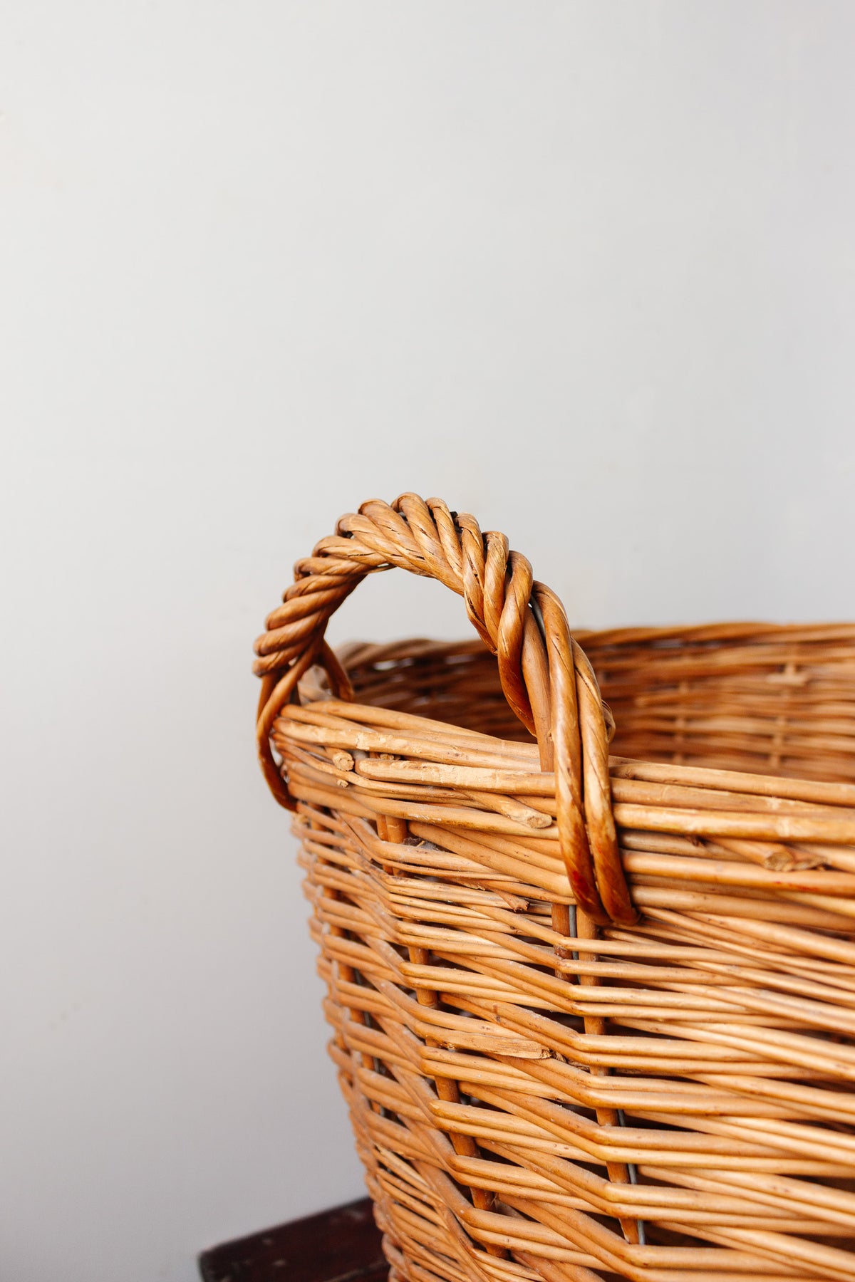 An antique French willow basket of generous scale with a sturdy wood-plank base built for strength and durability. Once used in the French countryside for carrying provisions, produce, or household goods, it now offers endless decorative possibilities. Its woven form and weathered patina bring rustic character to a room—perfect by the fireplace for logs, beside a sofa with rolled textiles, or as a striking storage piece for market finds and garden harvests.