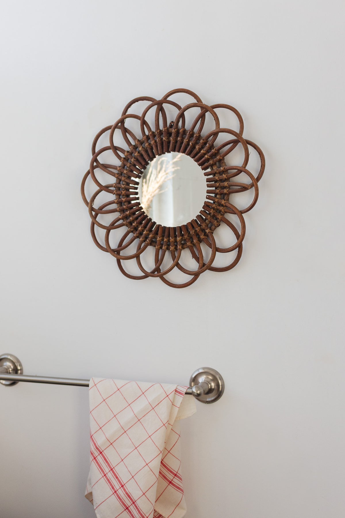 This midcentury French mirror features a sculptural bamboo and rattan frame arranged in a looping. The natural tones and graphic silhouette make it a statement piece, whether styled in an entryway, above a dresser, or layered into a gallery wall. Sourced from a brocante in Marseille.