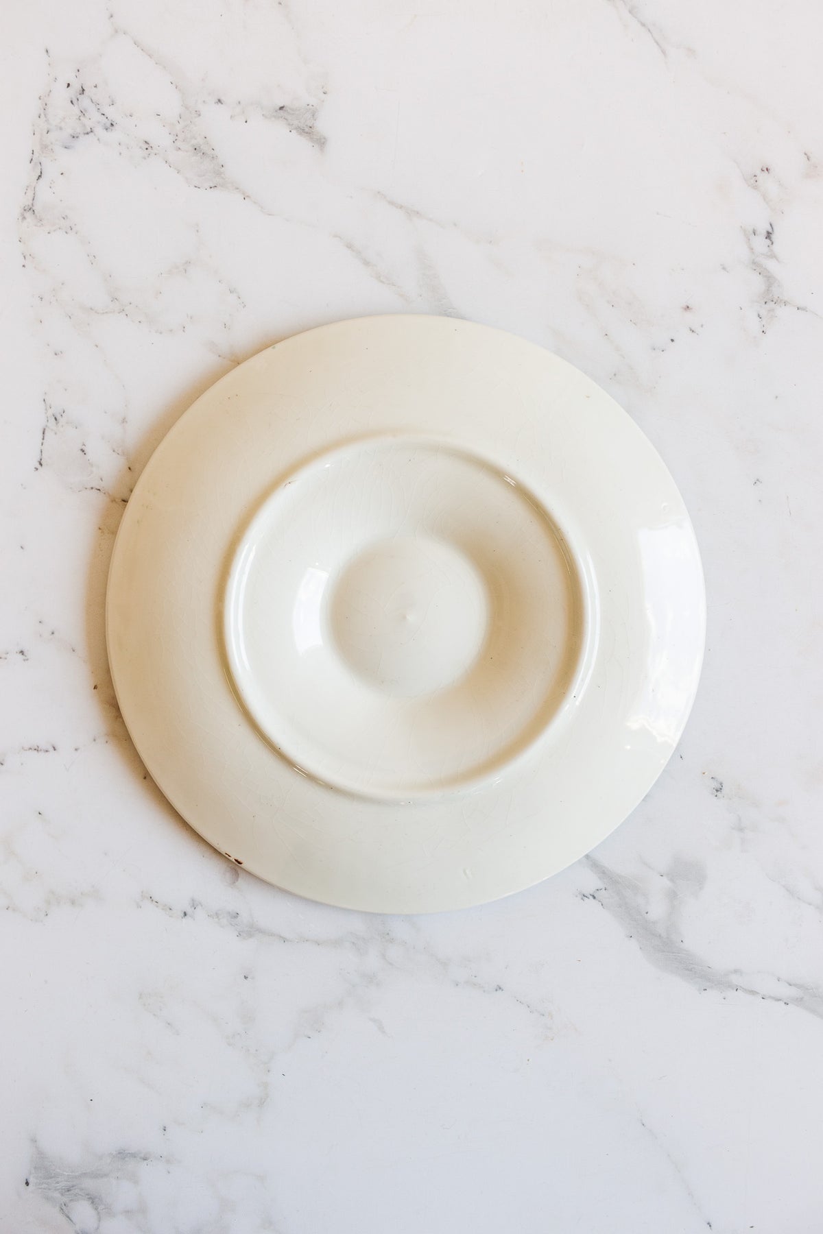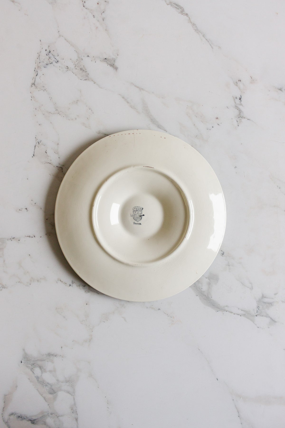 An antique French Longchamp oyster plate featuring a richly glazed green “woven” basketweave ground with softly molded white shell wells and a central sauce reservoir. Crafted in faïence and sourced from a brocante in Marseille, this classic coastal form was designed for serving oysters on the half shell, balancing beauty and function with ease. The deep green glaze and subtle variation speak to its age and hand-finished quality. Sold individually, perfect for building a collected set or styling as a decorative accent.