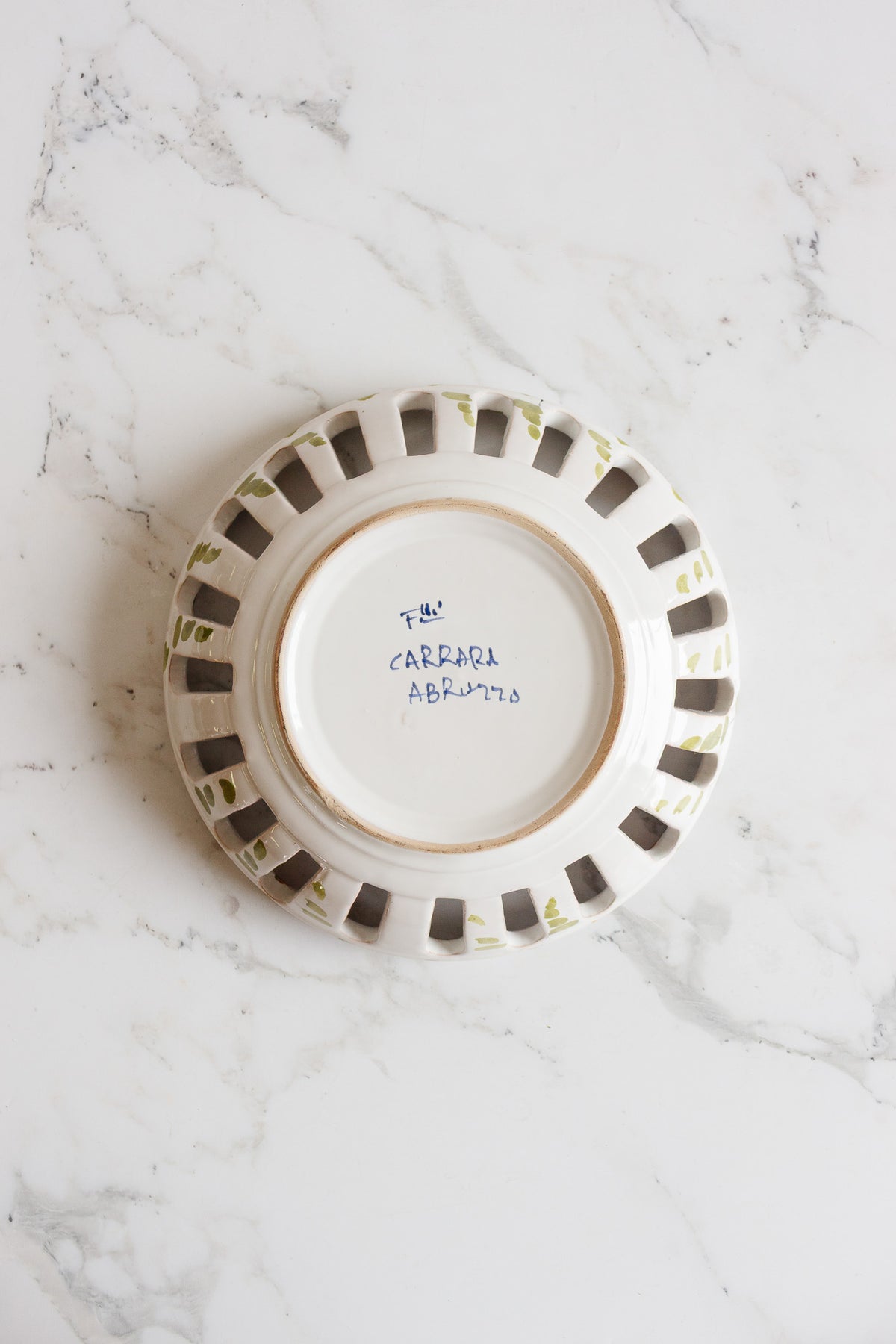 A vintage Italian Carrara hand-painted reticulated bowl, showcasing finely pierced detailing and vibrant painted decoration. The openwork rim lightens the form, while the hand-painted motifs add color and character. Both decorative and functional, it reflects the artistry of Italian craftsmanship and makes a striking centerpiece or display piece in any setting.