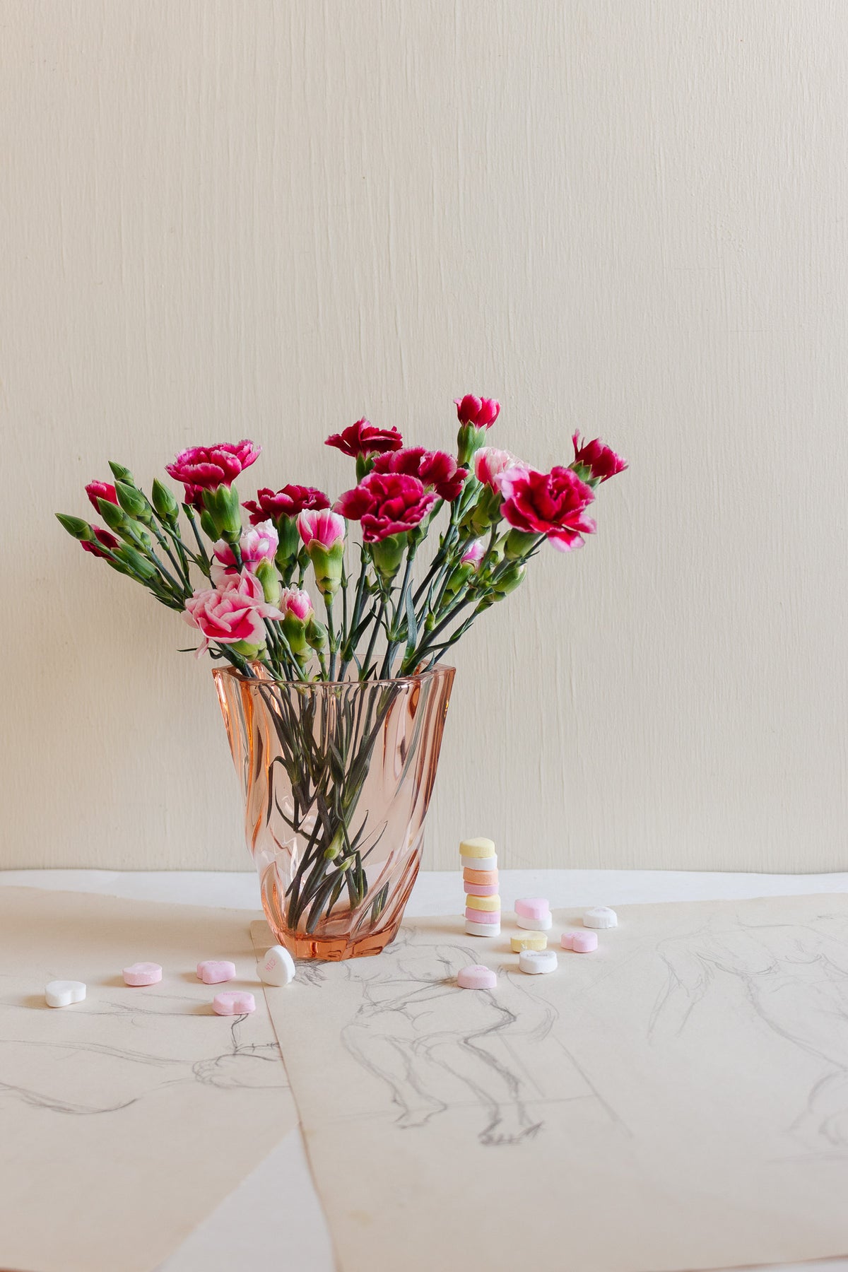 A lovely midcentury French vase in soft pink glass, designed with a gentle swirling pattern that catches the light beautifully. Its compact size makes it perfect for a small bouquet, a few sculptural stems, or simply as a pretty accent on a shelf or bedside table. Sourced from a brocante in Marseille.