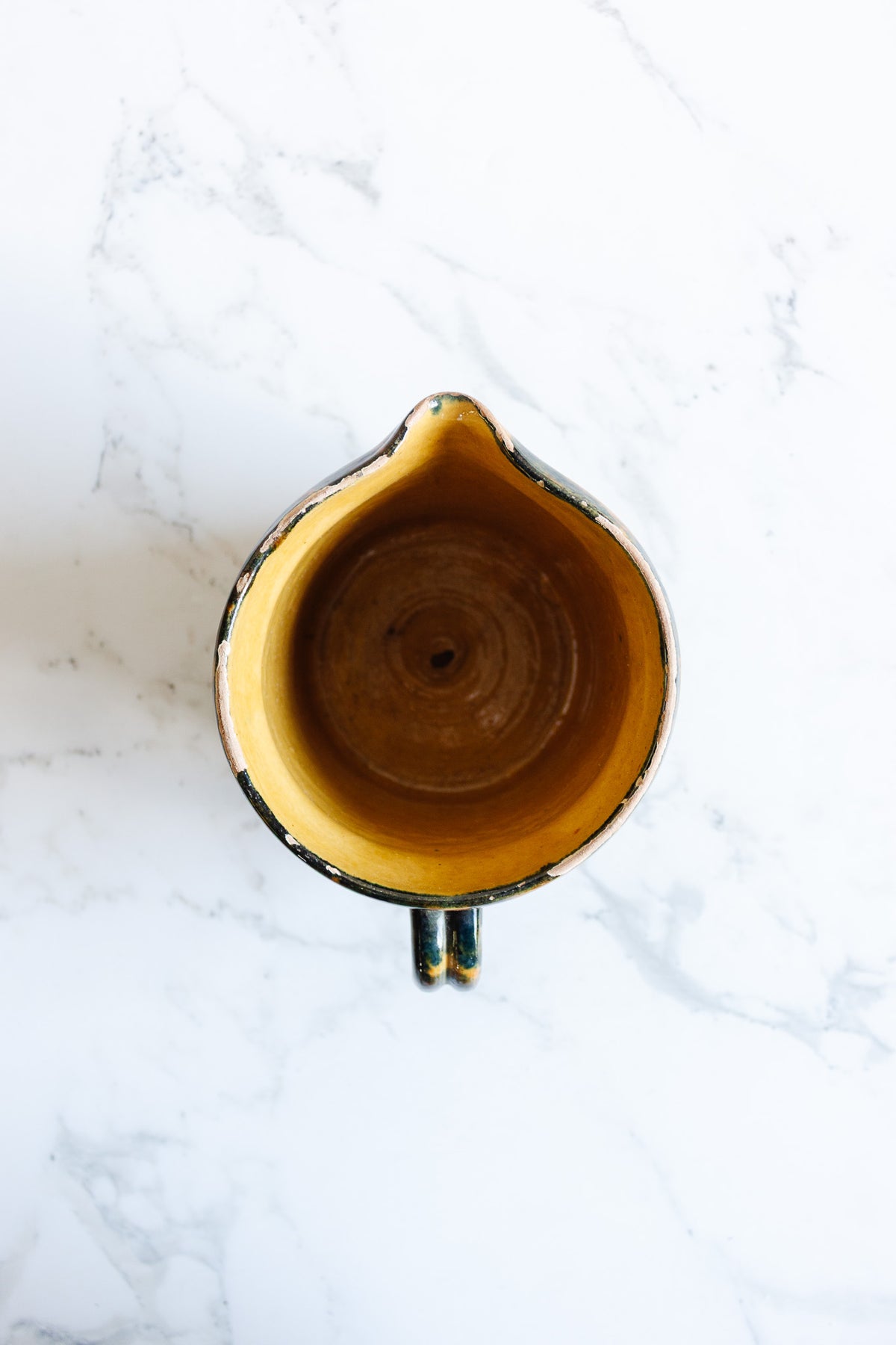 Jaspé glazed earthenware pitcher with a richly marbled surface in deep tones of brown, ochre, green, and black. The glossy glaze highlights the natural variation of the jaspé finish, giving the piece visual depth from every angle. Simple, well-balanced form with a pinched pouring spout and sturdy handle, characteristic of utilitarian glazed pottery. Decorative yet functional, it works equally well as a pitcher, vase, or accent piece on a table or shelf.