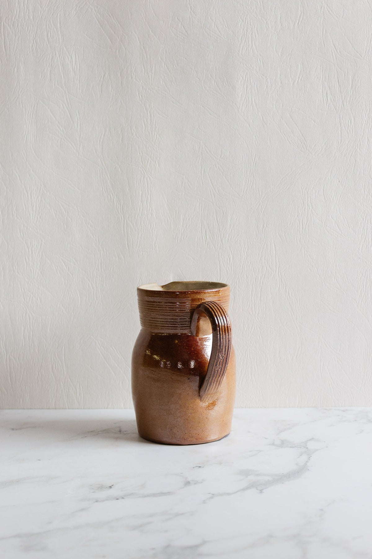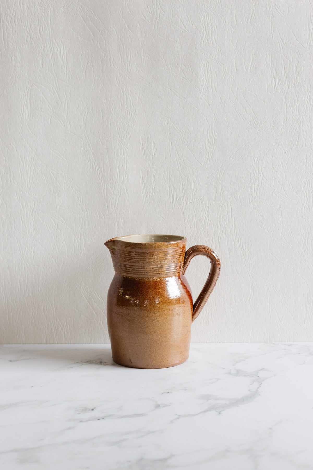 Vintage French stoneware pitcher. Sourced from a brocante in Marseille, this traditional French vessel embodies everyday beauty through simple form and honest material. Its smooth surface and balanced proportions reflect the practicality of rural pottery, while the subtle variations in tone and glaze reveal its handmade origin. Perfect for serving, holding flowers, or displayed on its own, it adds quiet authenticity to any space.