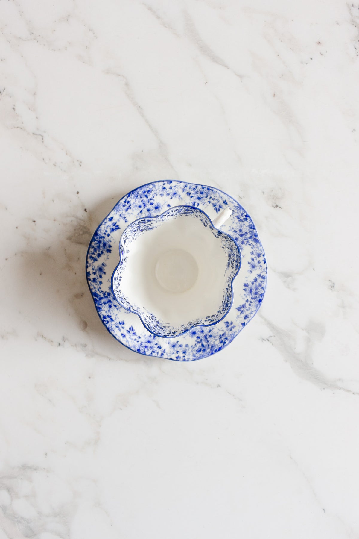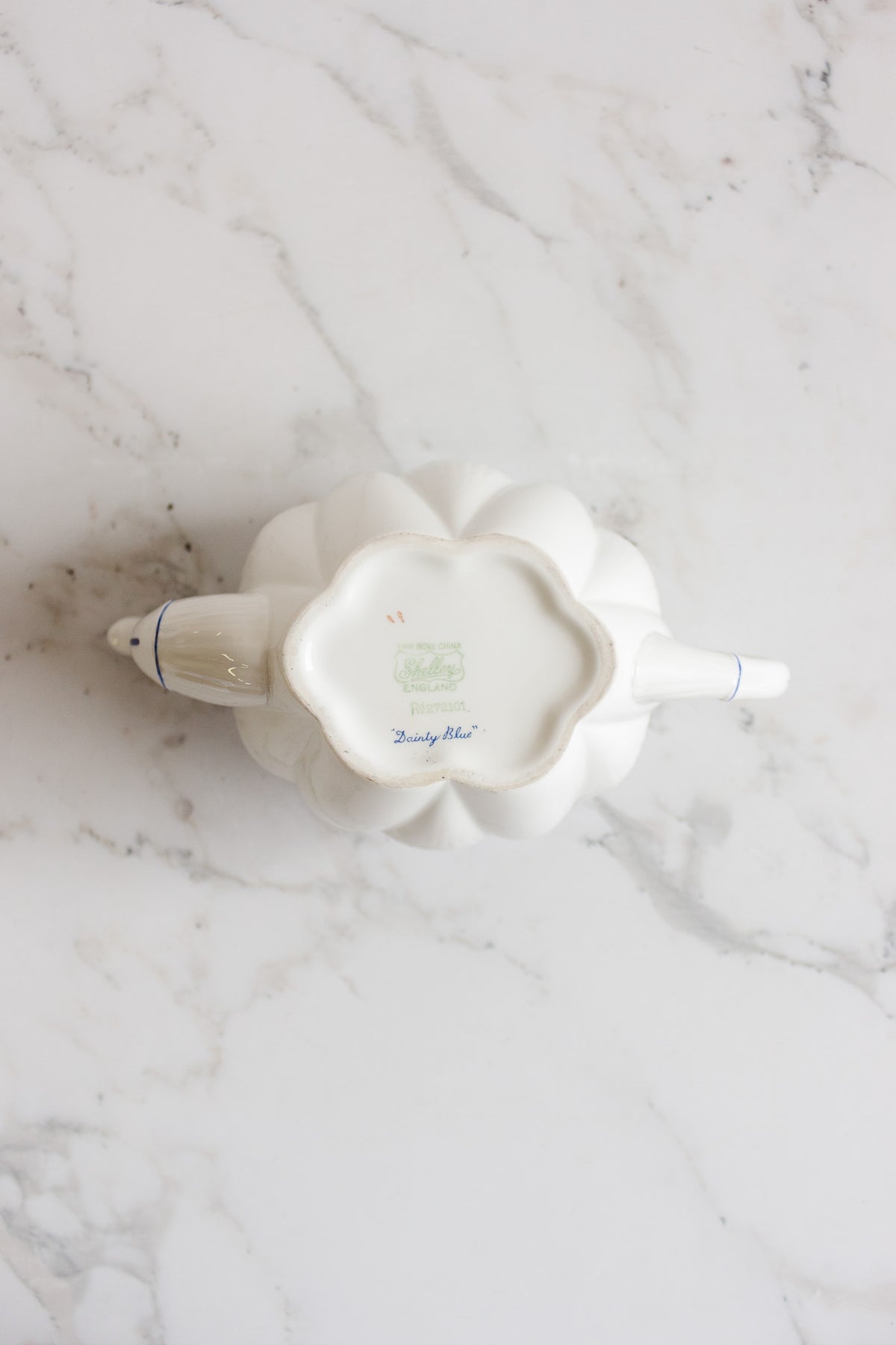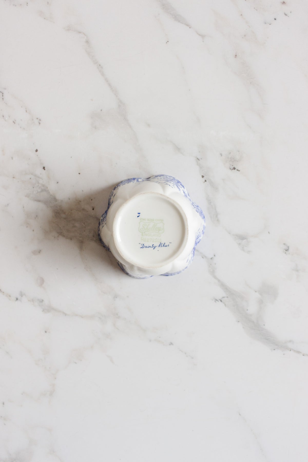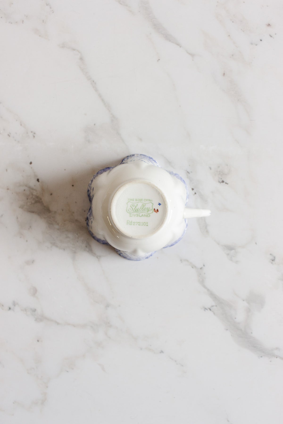 A beautiful vintage Shelley tea set in the beloved “Dainty Blue” pattern, featuring a teapot, creamer, sugar bowl, and teacup with matching saucer. The set is decorated with Shelley’s signature scalloped edges and delicate pale blue floral design, a hallmark of English fine bone china.