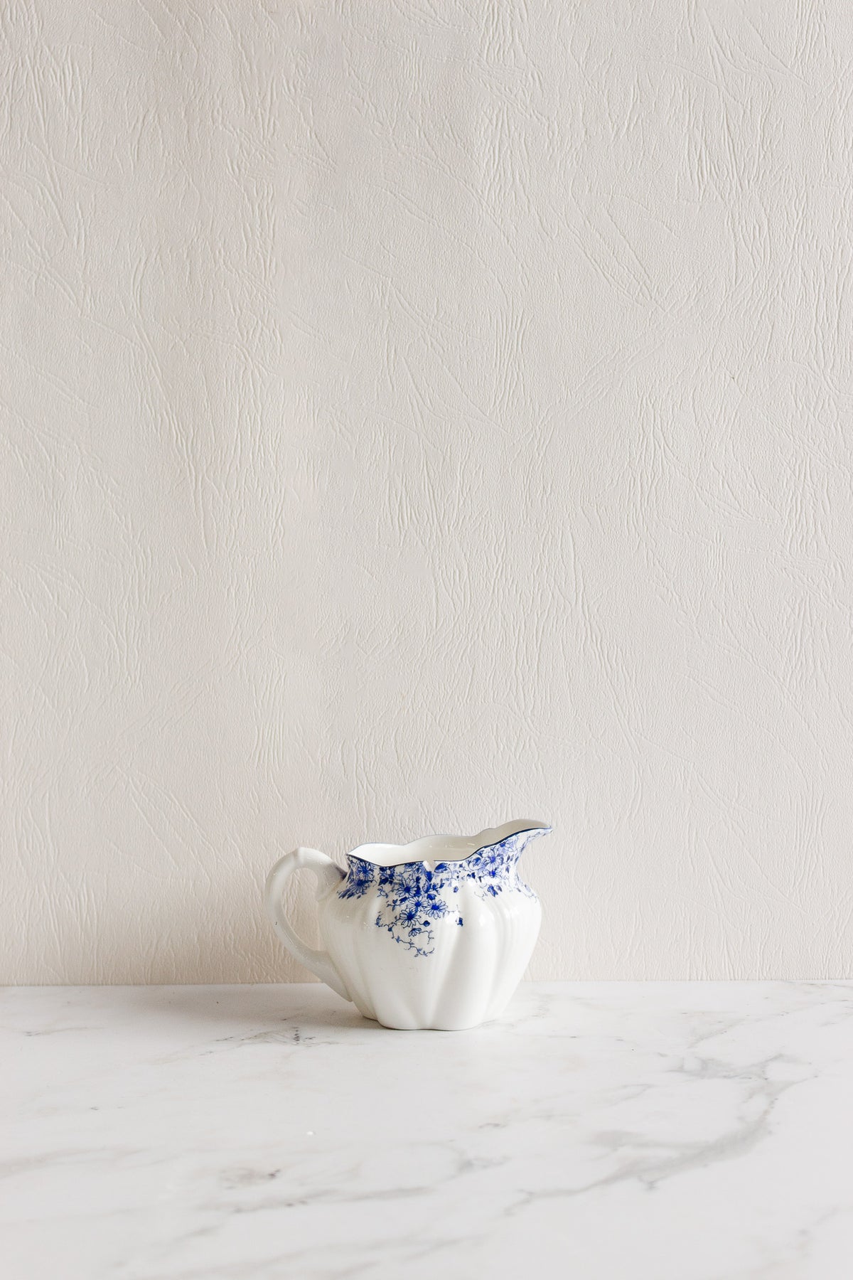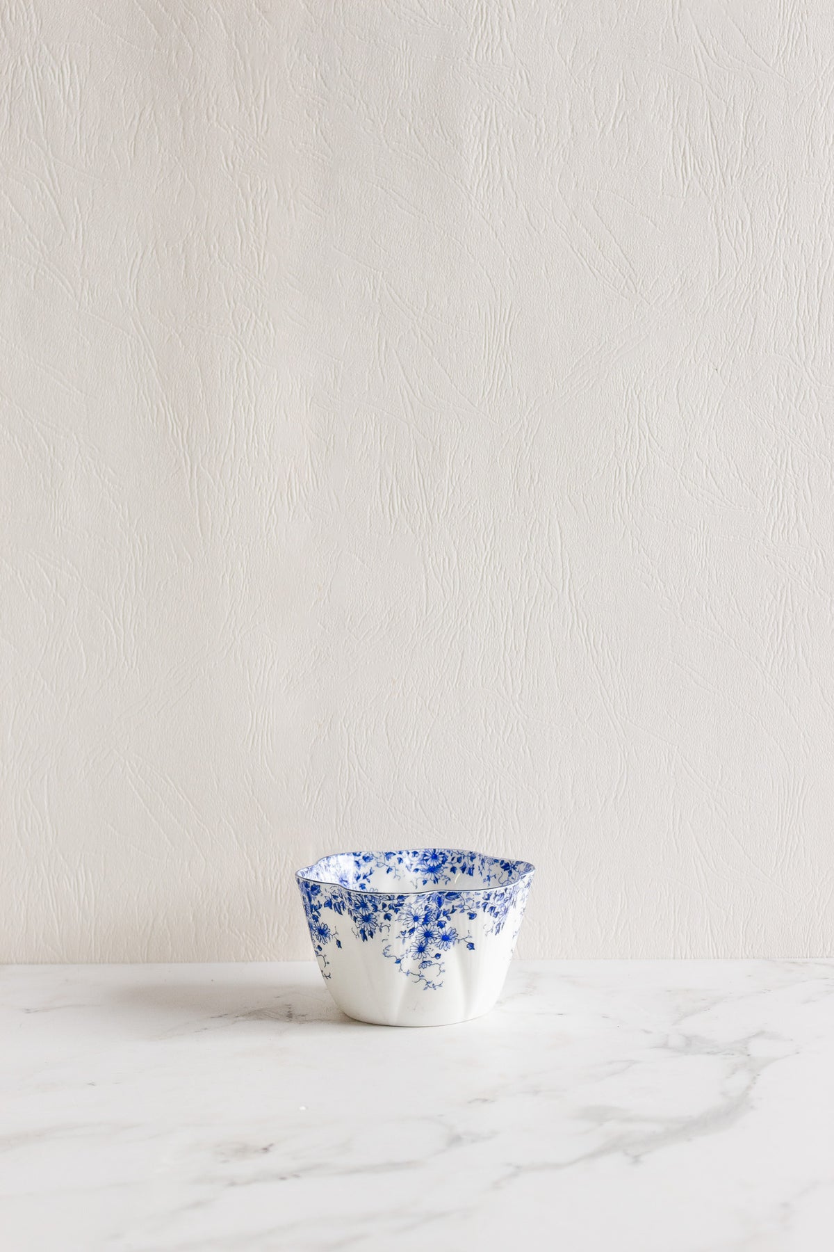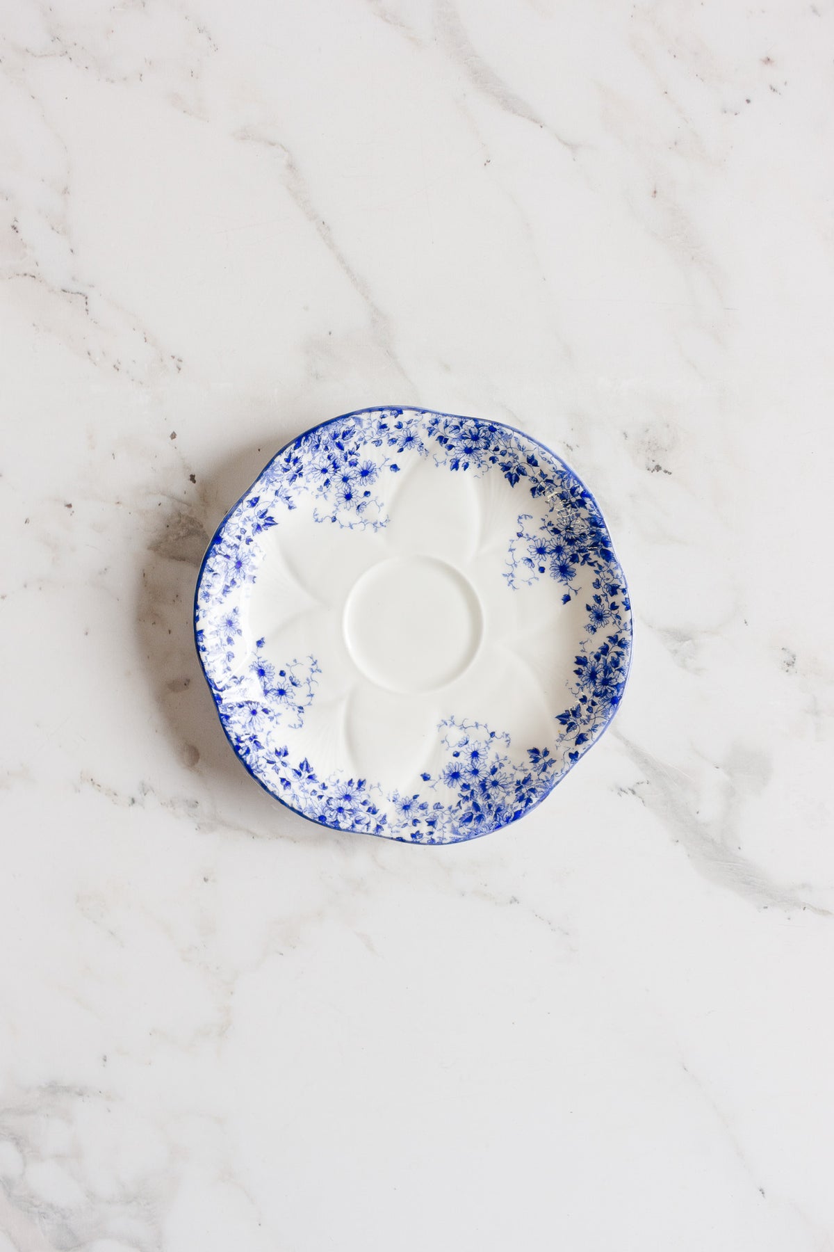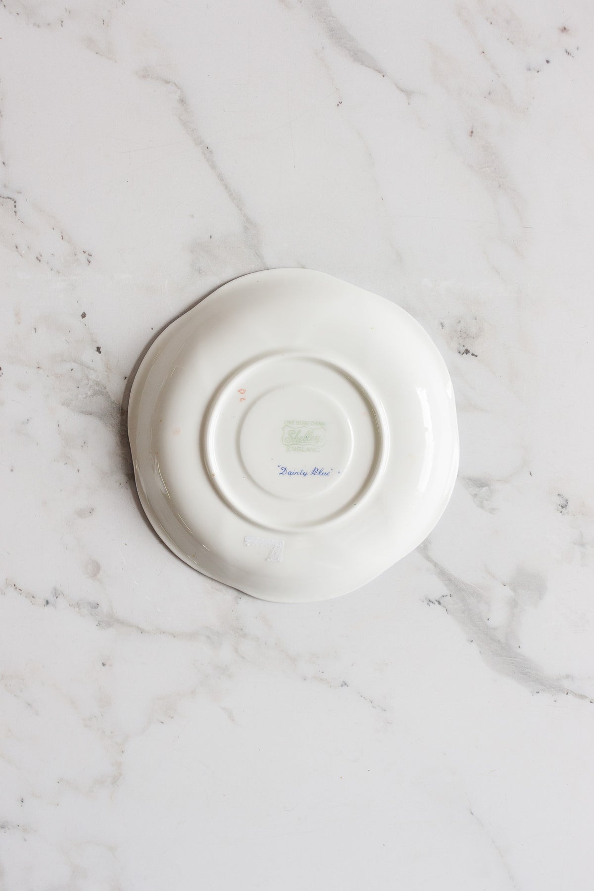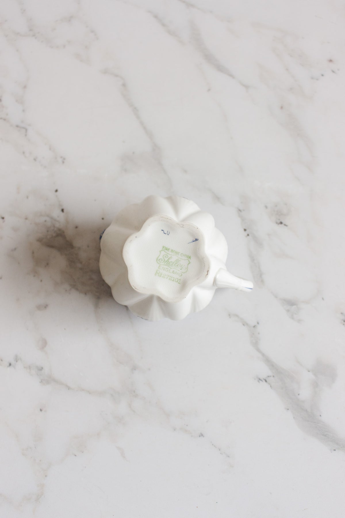 A beautiful vintage Shelley tea set in the beloved “Dainty Blue” pattern, featuring a teapot, creamer, sugar bowl, and teacup with matching saucer. The set is decorated with Shelley’s signature scalloped edges and delicate pale blue floral design, a hallmark of English fine bone china.