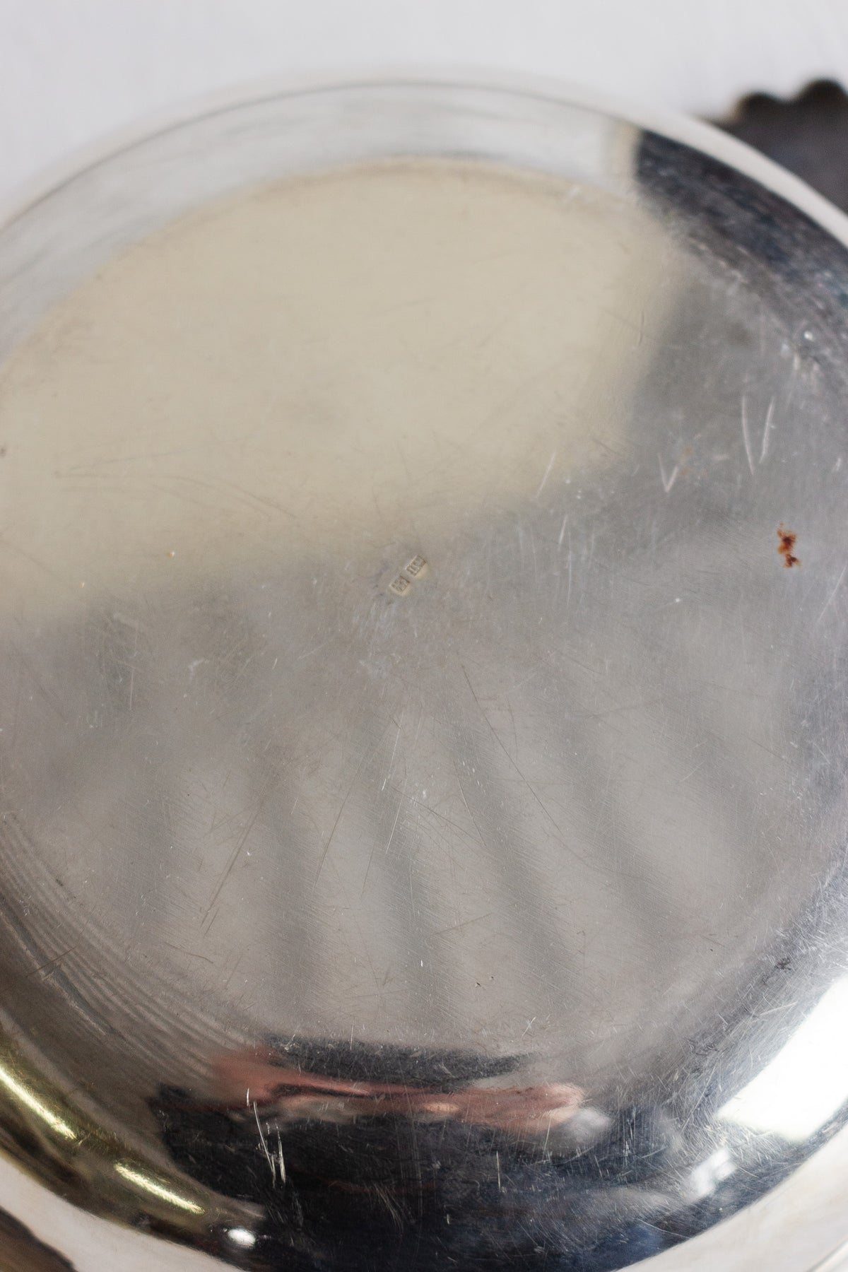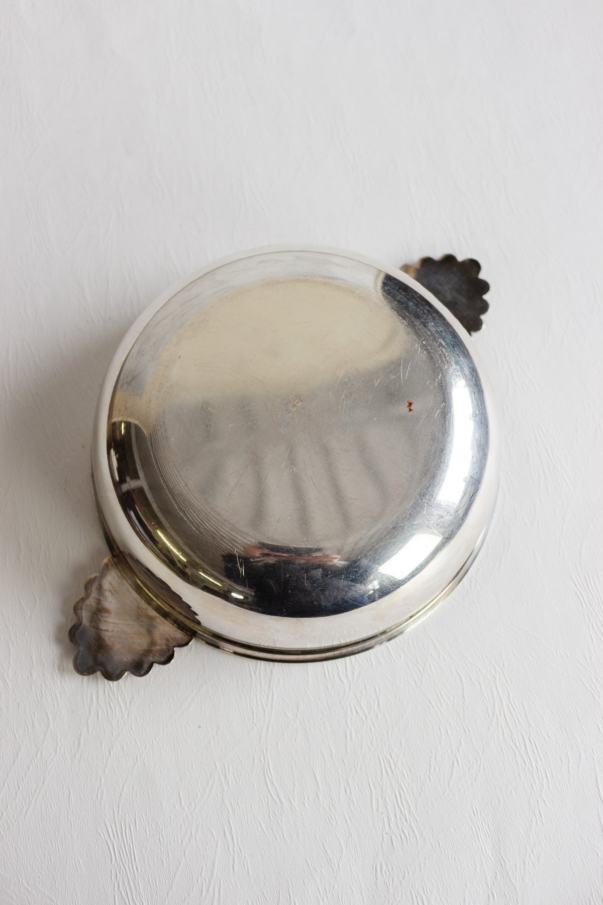 This Art Deco French bowl, sourced from a brocante in Marseille, is crafted in heavy silver plate and marked with French “poinçons” (hallmarks). The bowls' geometric patterned handles and subtle detailing are characteristic of the Art Deco period.