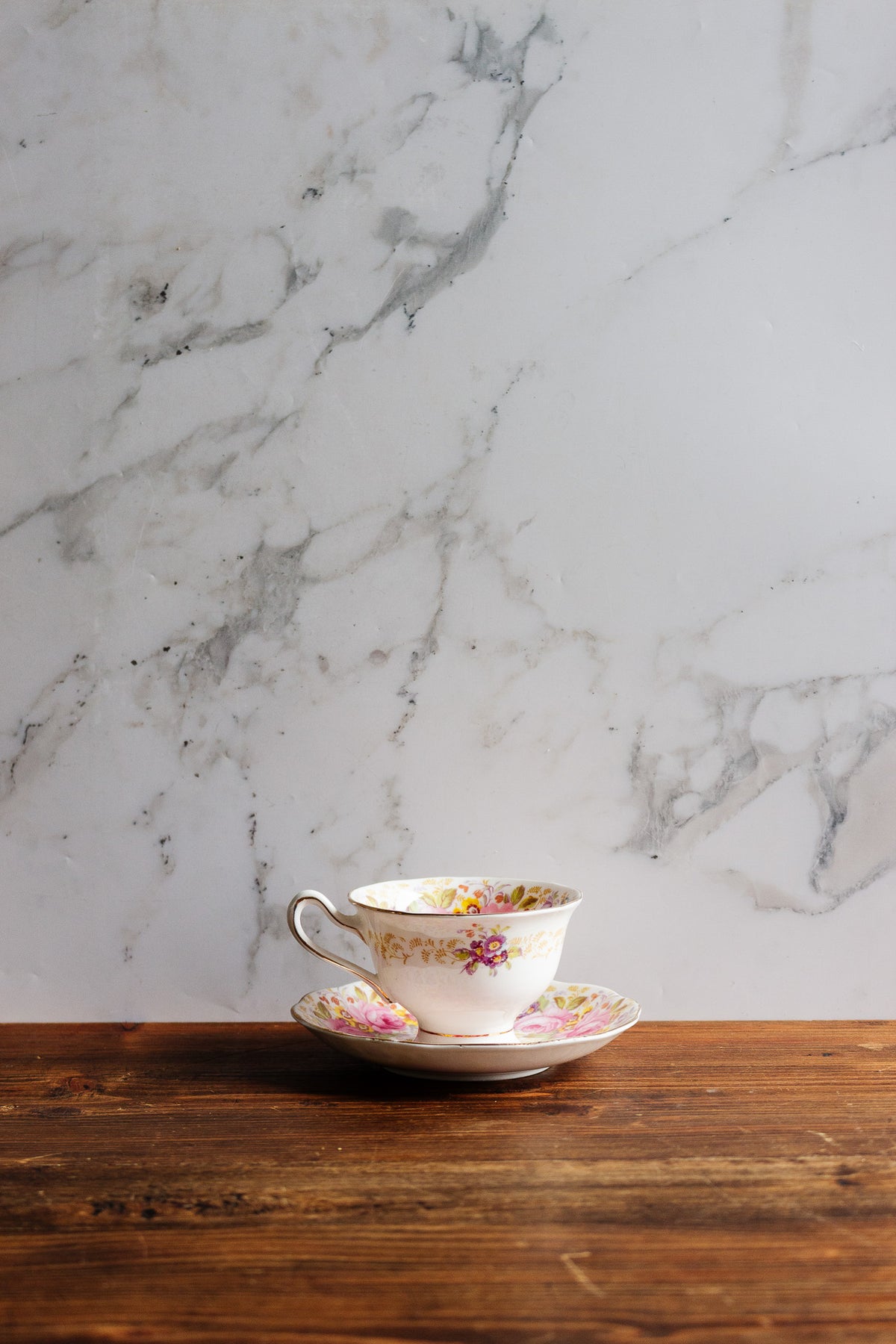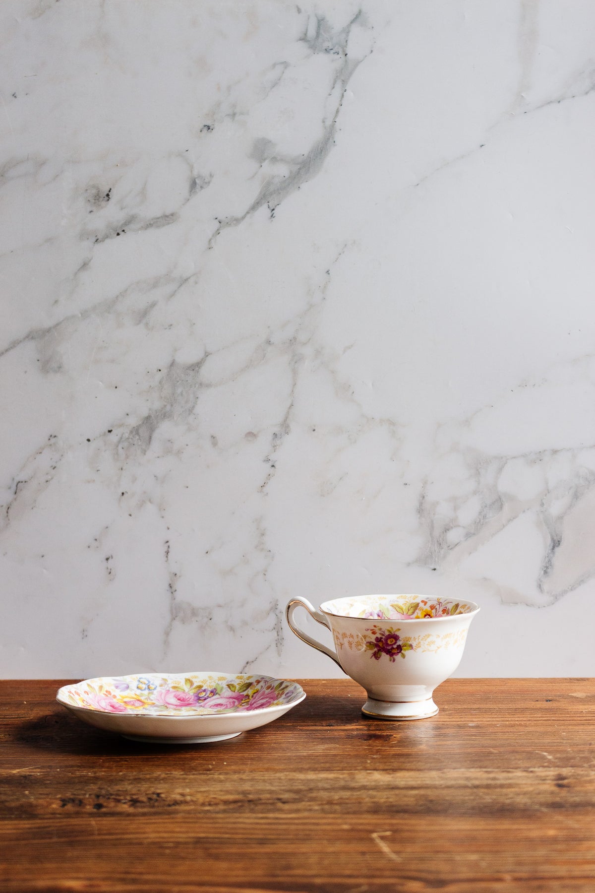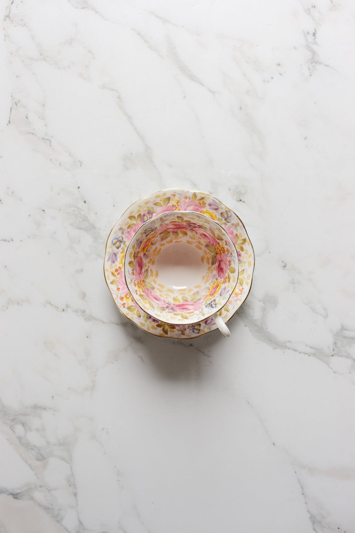 You know how we love an eclectic set of teacups. They are romantic, timeless, and chic. This teacup is a lovely example of English fine bone china in the Serena pattern—a lush floral design in pink, blue, and yellow with delicate green leaves, finished with Royal Albert’s signature gold trim. Sourced from a brocante in Marseille.