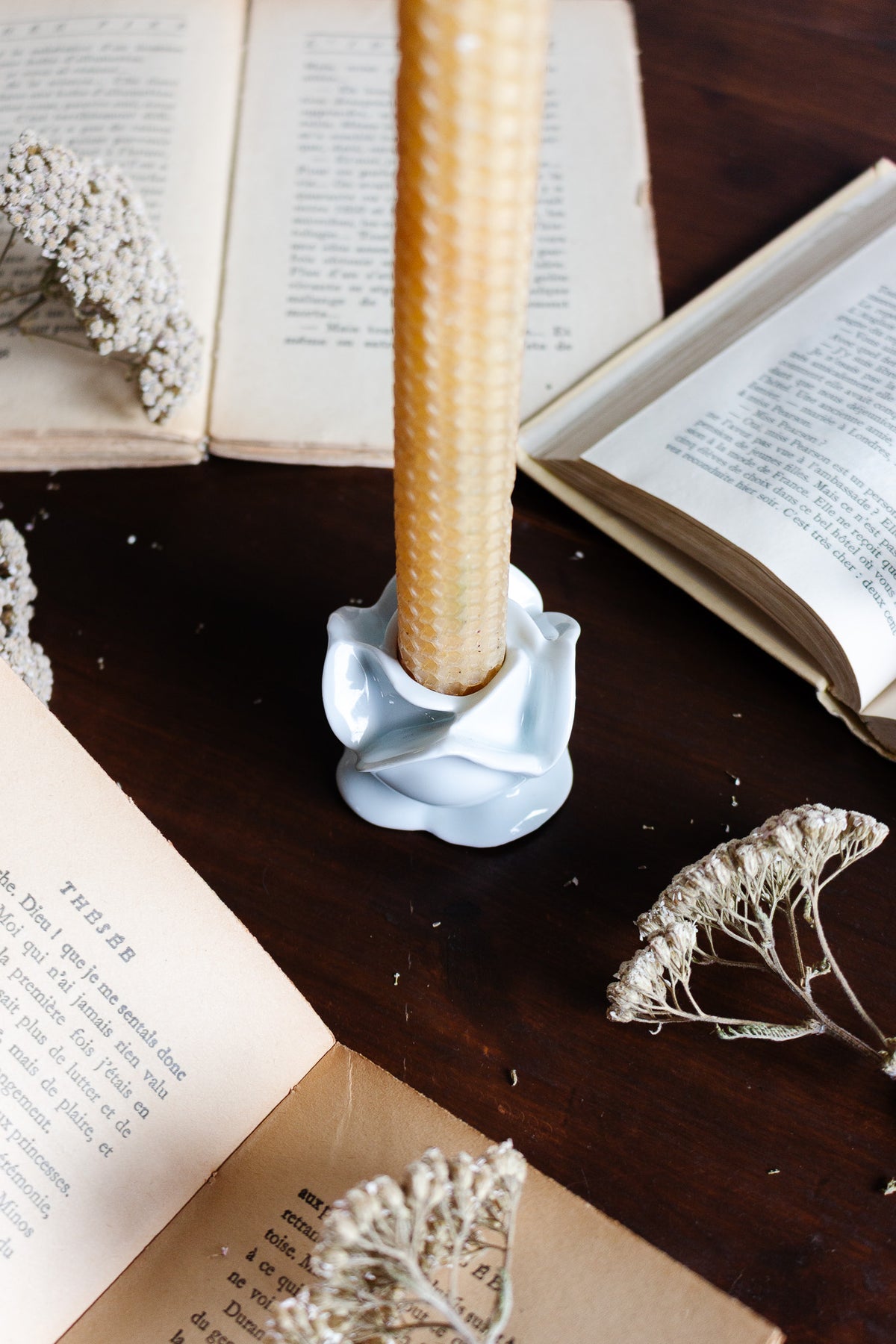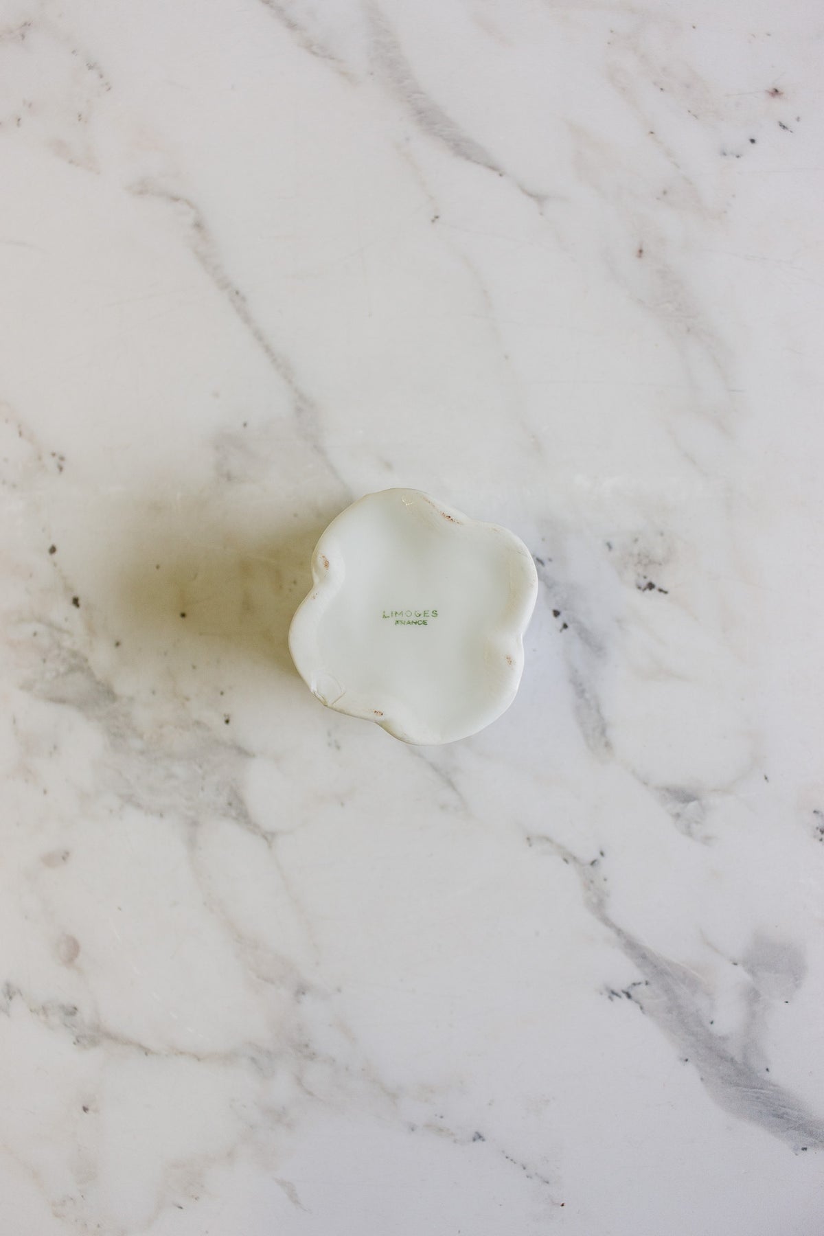 A delicate vintage Limoges candle votive in the shape of a blooming white rose. Finely detailed petals capture the softness of porcelain, creating a romantic, timeless piece that glows beautifully with a lit candle. Perfect as a decorative accent, a soft light source on a vanity or nightstand, or a thoughtful gift.