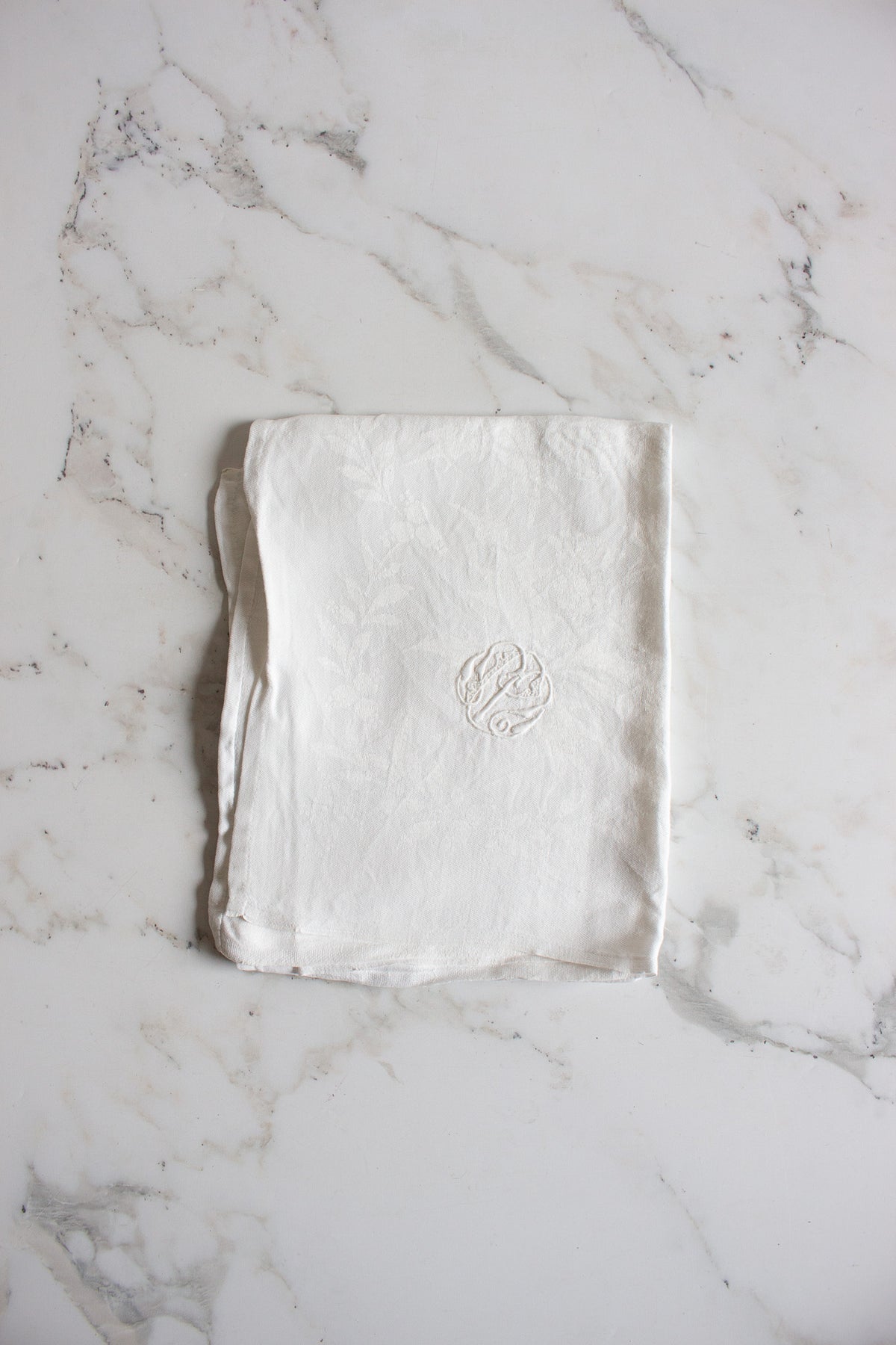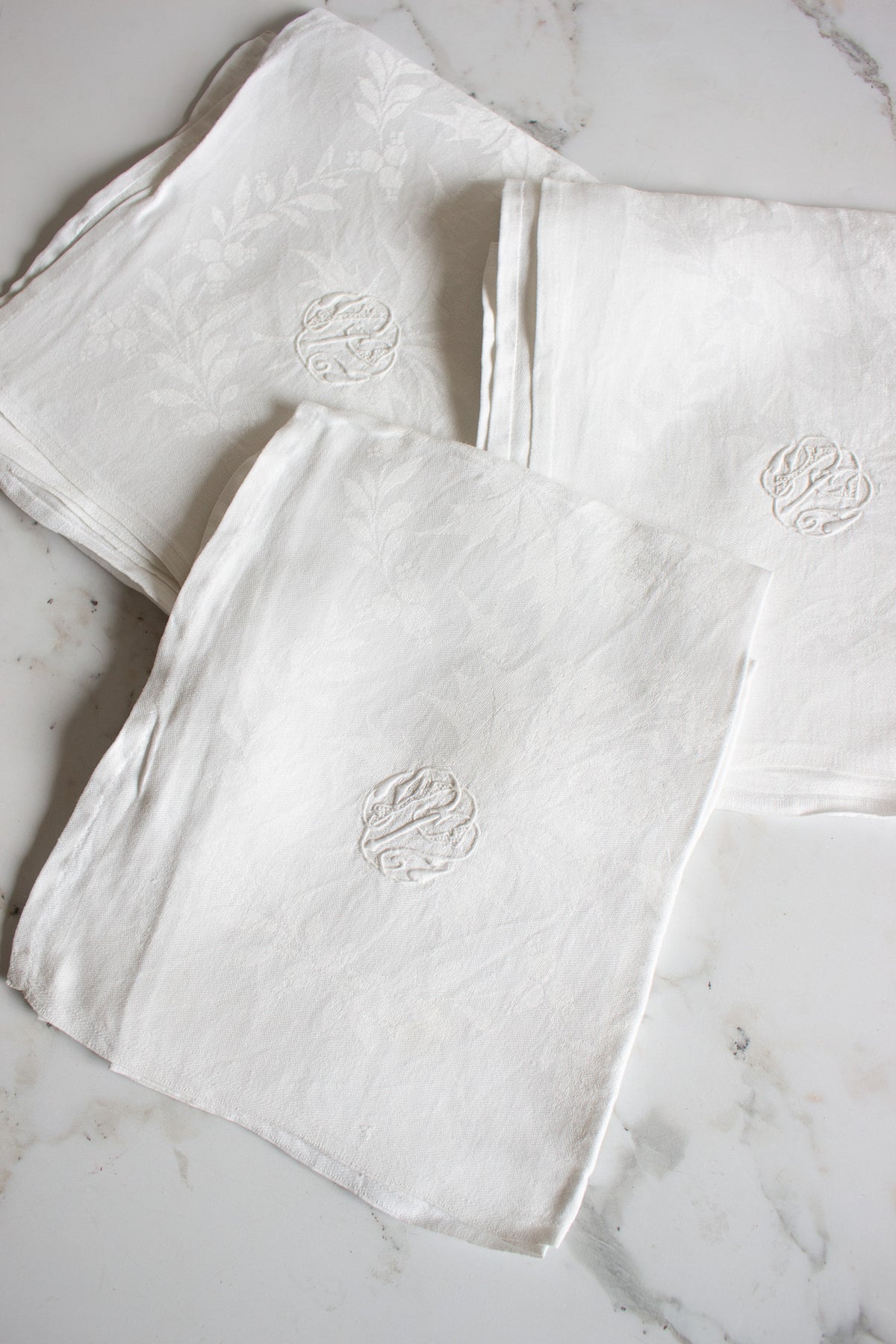 Antique French cotton and linen blend napkins, each monogrammed with elegant initials. Soft yet durable fabric with a fine weave typical of traditional French linens. Subtle signs of wear add character without compromising quality. Ideal for adding understated charm to everyday dining or special occasions.